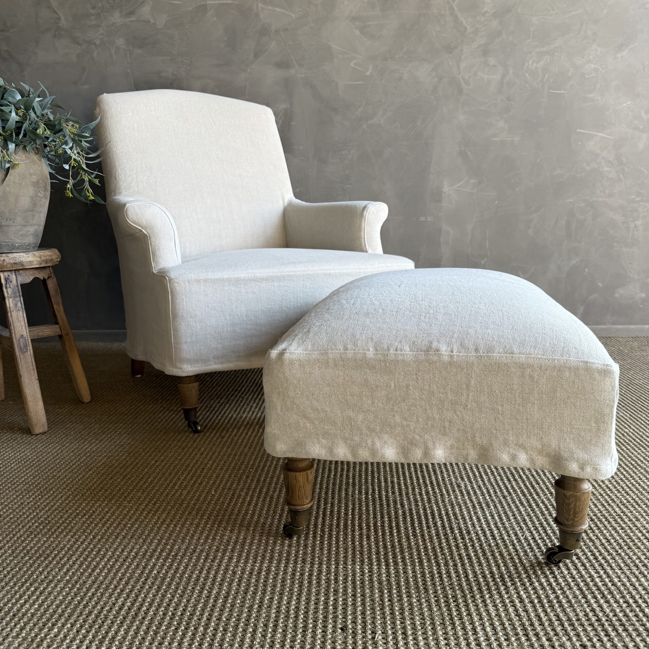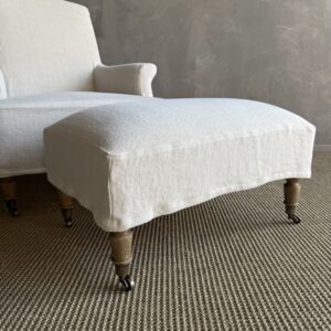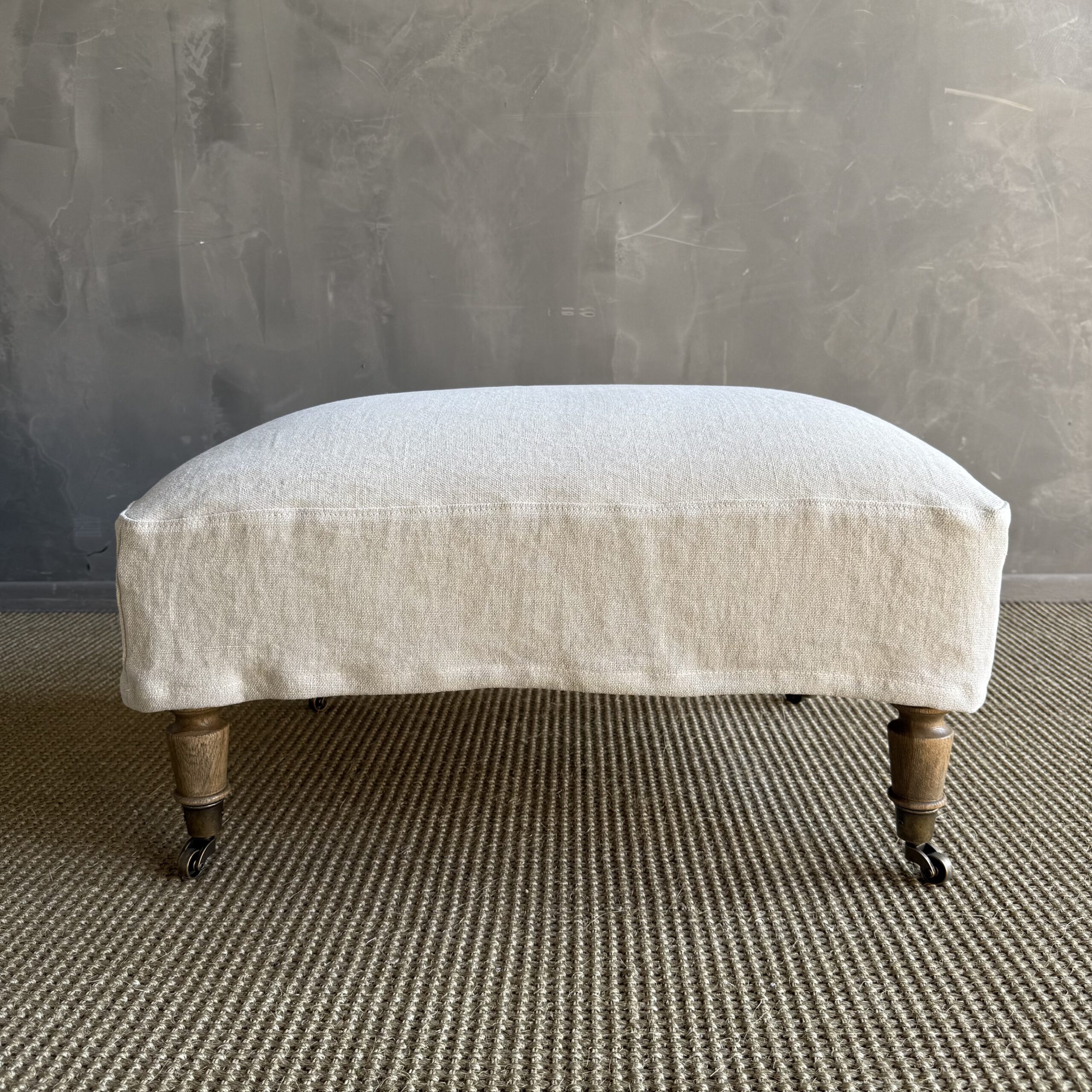 Our Alma Ottoman features a tailored linen slipcover that adds a touch of relaxed sophistication, perfectly complemented by sturdy white oak legs.  The casters are an antique brass color, they provide style and function. The removable slip cover is in our stone washed Belgian linen. The color is greige, a natural linen that has been bleached once, giving it a color resembling oatmeal.