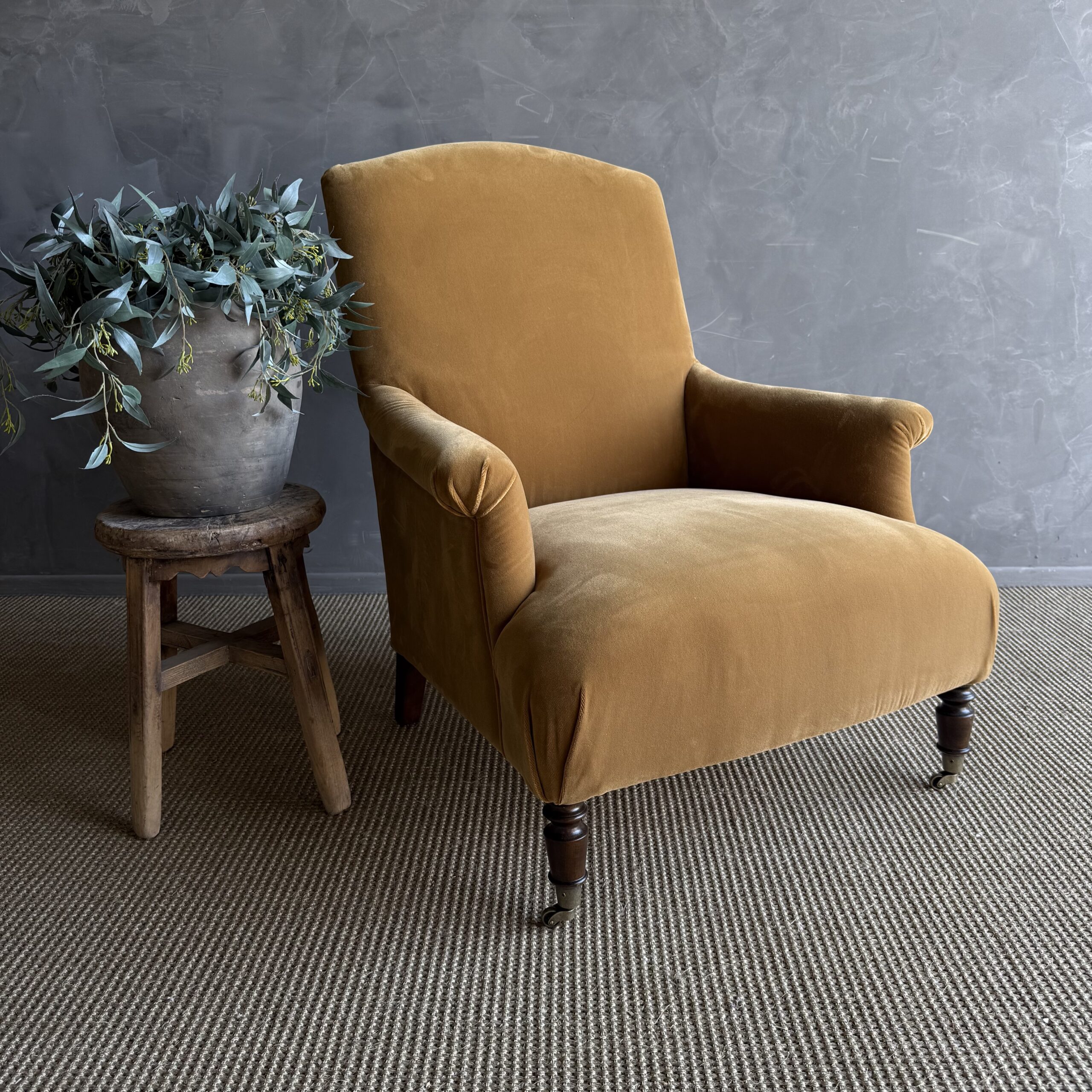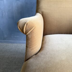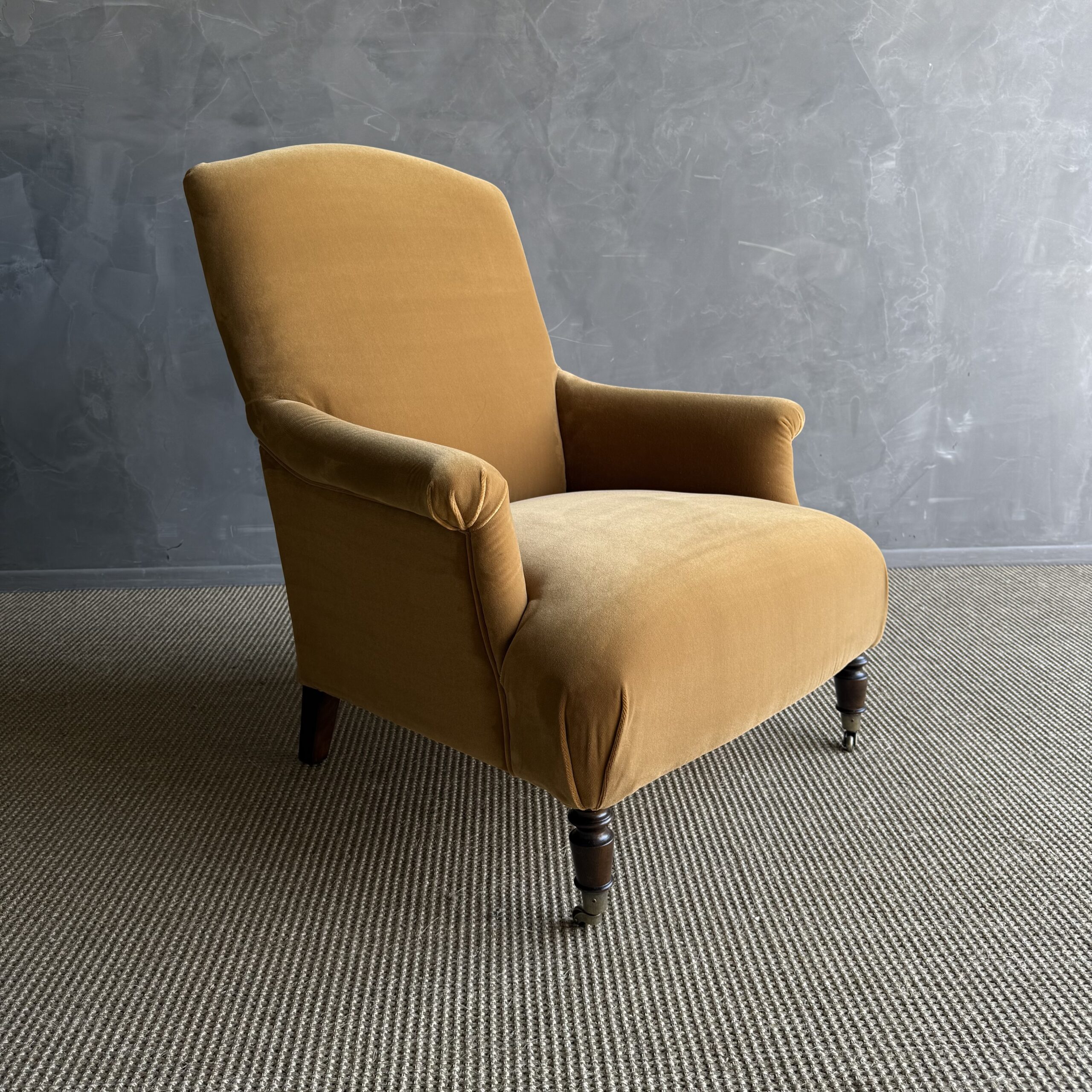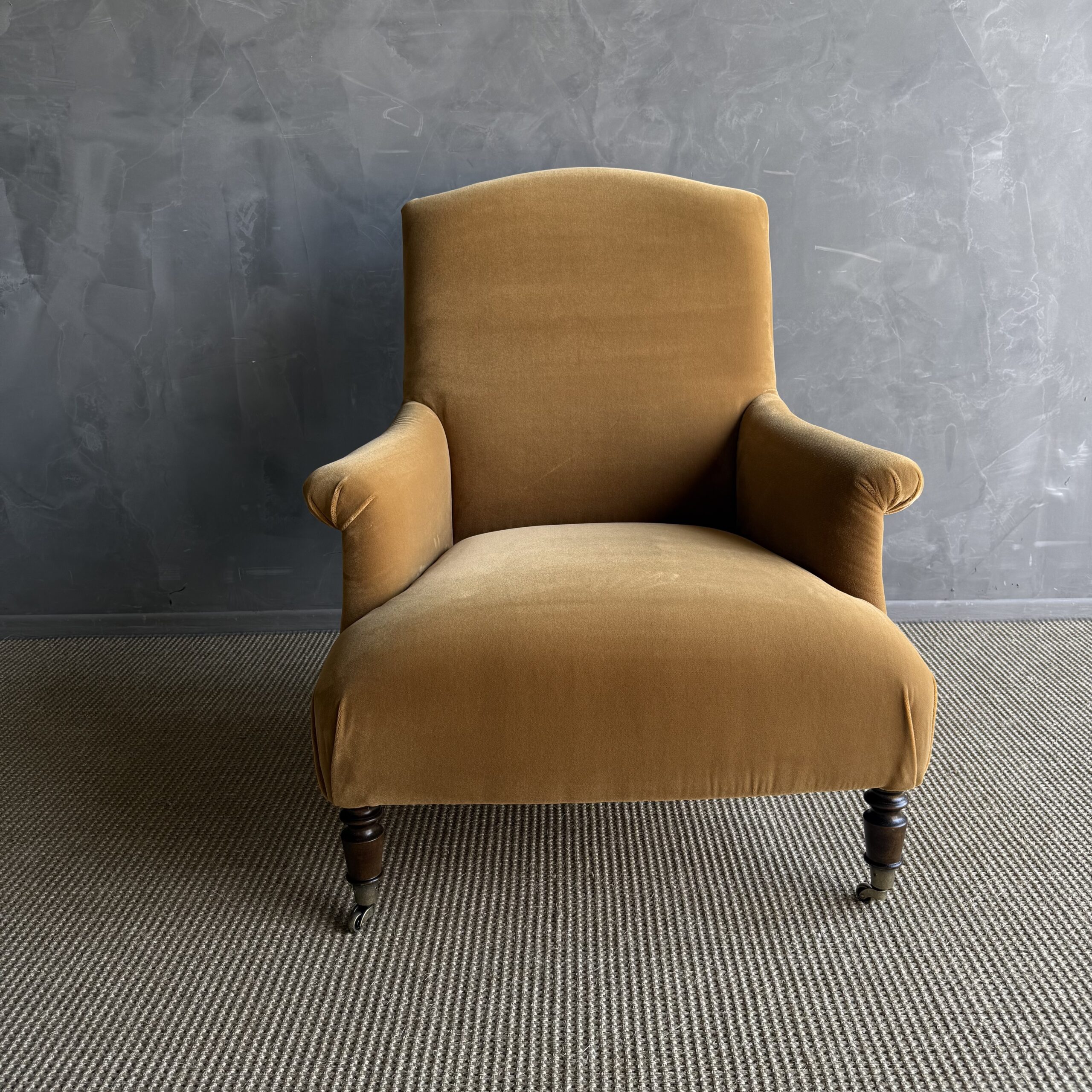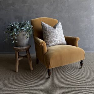 Introducing the Alma Accent Chair – a timeless piece crafted for comfort and style. Upholstered in a faux mohair style velvet, the color is our french havane, a warm honey, caramel tone. Resembling a classic French Napoleon style chair, the Alma features turned white oak legs in a chestnut finish and charming antique-style caster wheels. Designed for comfort, the Alma Accent Chair is your perfect companion for moments of relaxation and leisure.