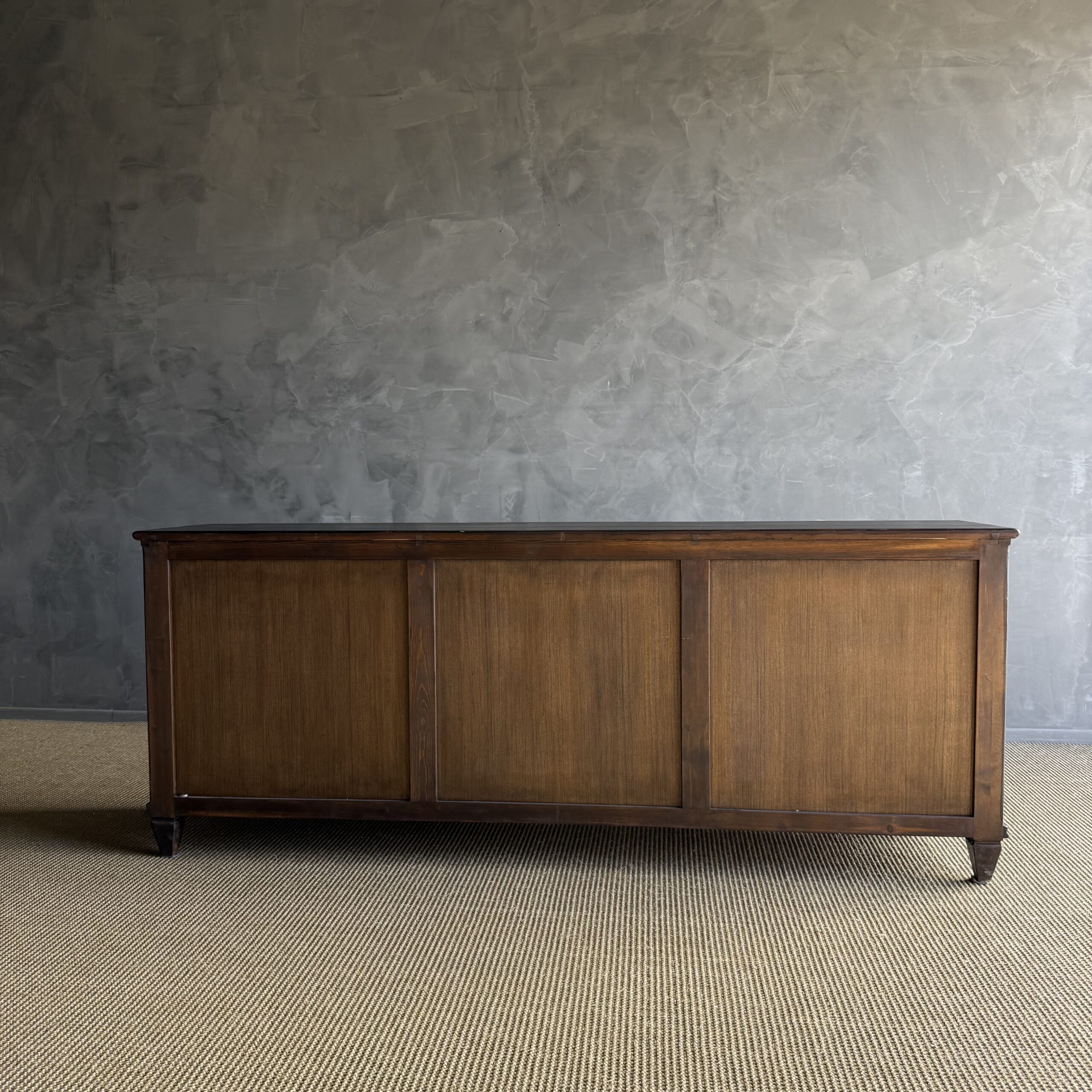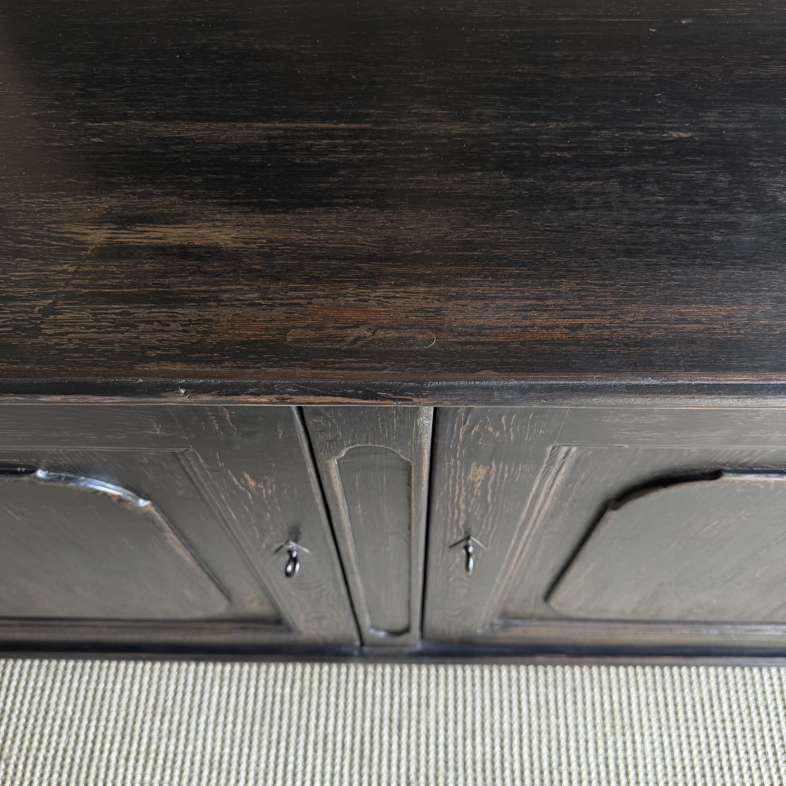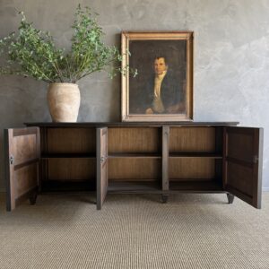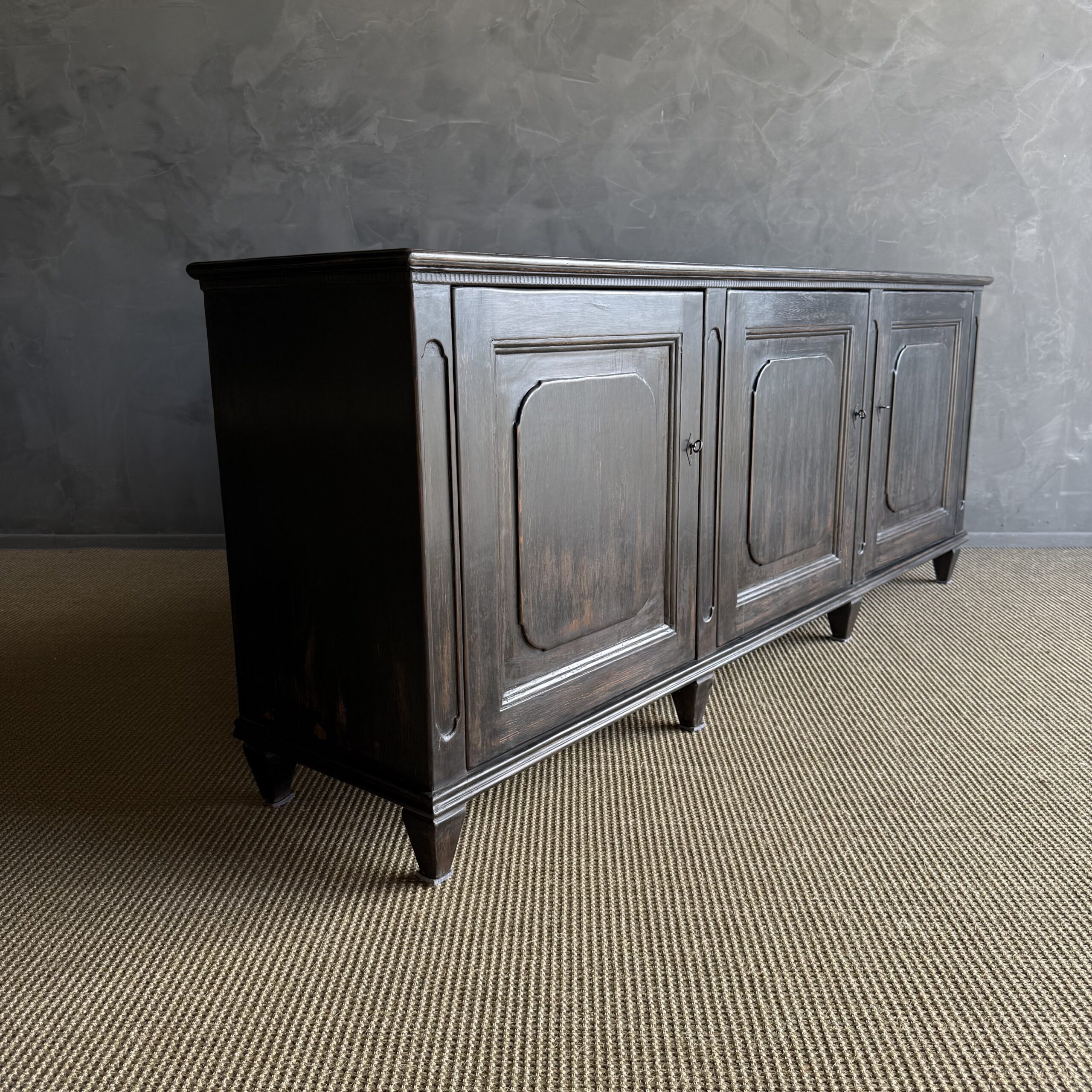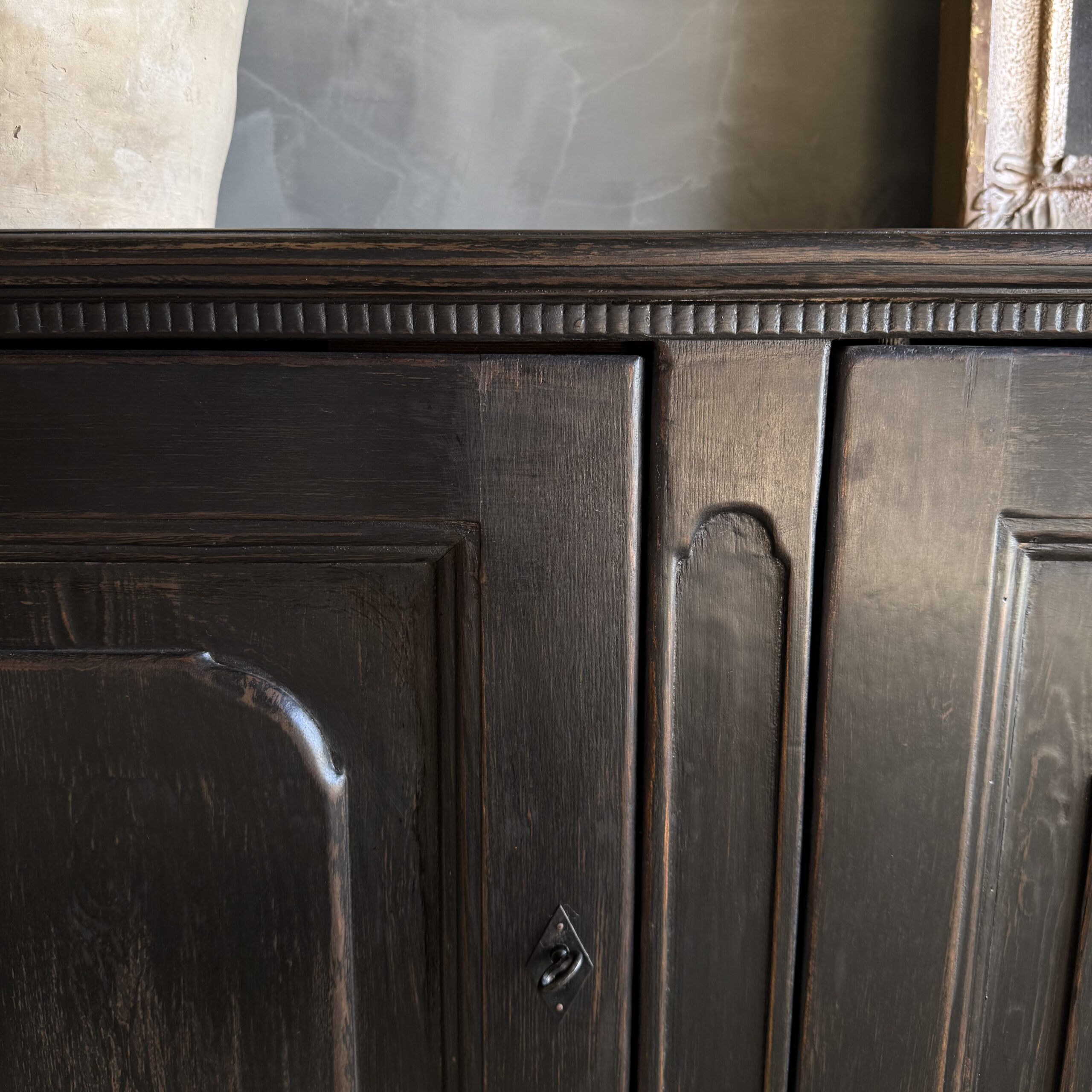 This vintage-style black-painted three-door cabinet is a stunning blend of functionality and classic elegance. Crafted from solid wood, it exudes durability and timeless charm, making it a perfect addition to any home décor. The cabinet features a rich black finish that beautifully highlights its intricate craftsmanship and adds an air of sophistication to your space. Each of the three doors opens to reveal spacious interior shelving, offering ample storage for your belongings, whether it be books, dishes, or collectibles. The working locking key adds an element of security and authenticity, enhancing its vintage feel. This cabinet is not just a piece of furniture; it’s a statement that reflects your appreciation for quality and style, making it an ideal focal point in living rooms, dining areas, or home offices.