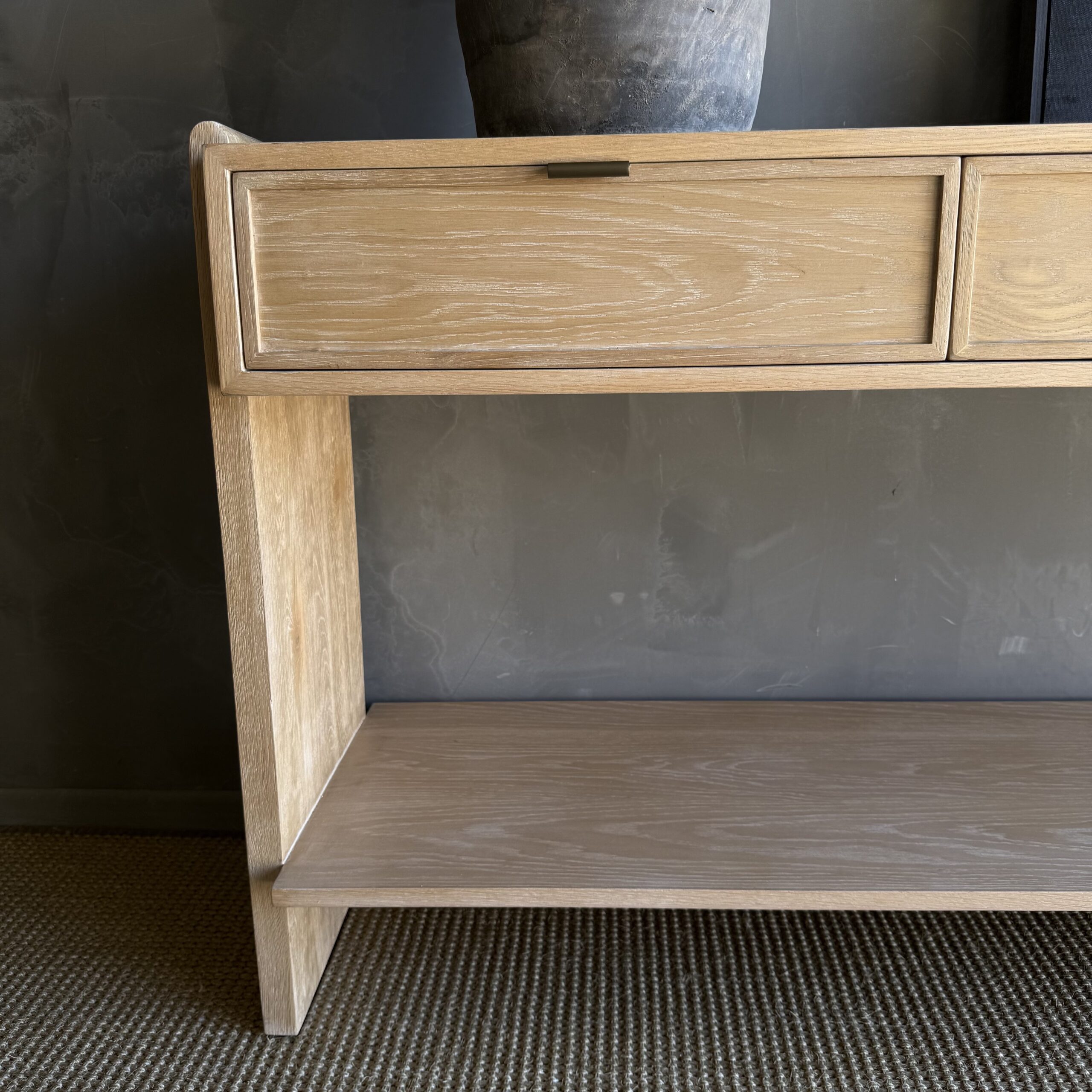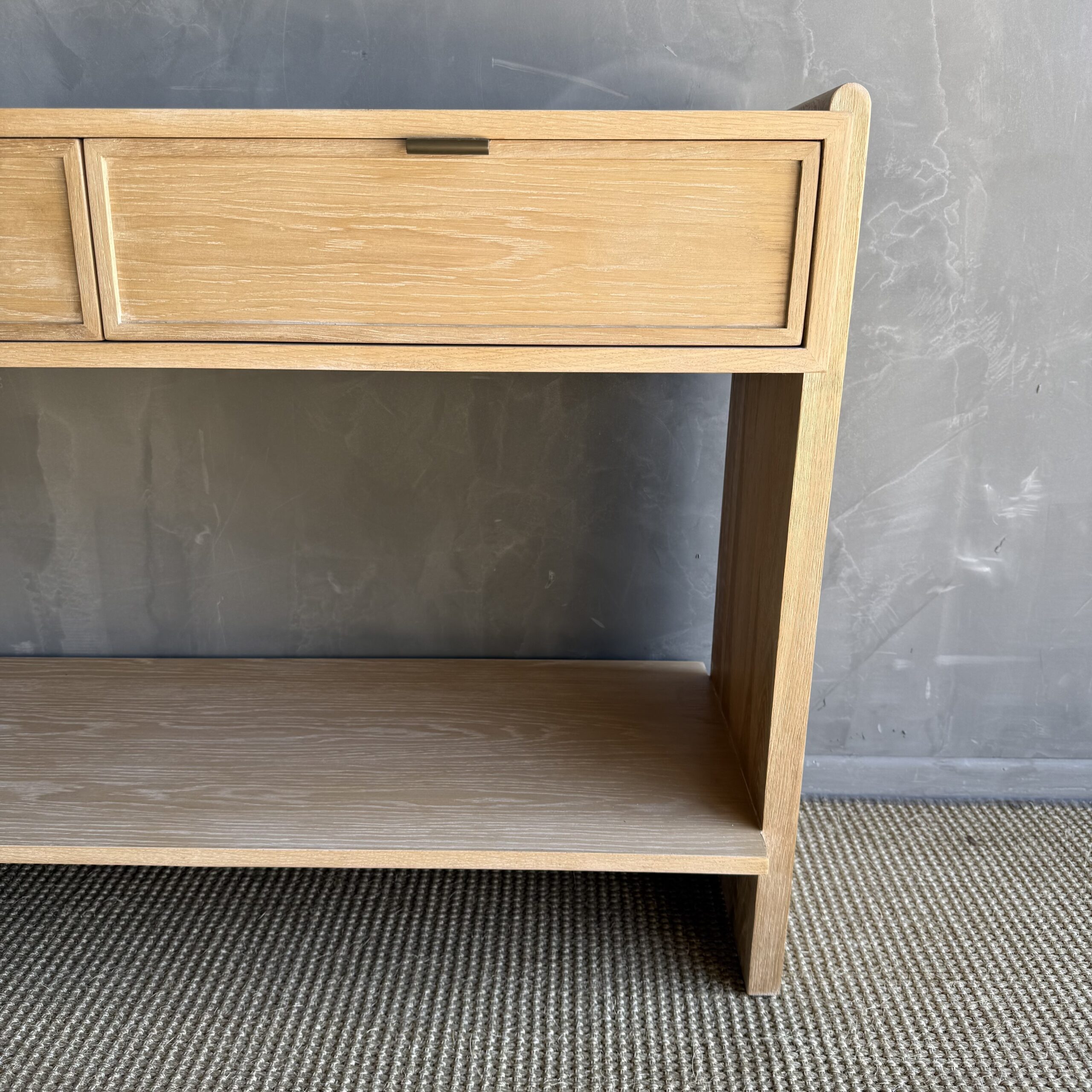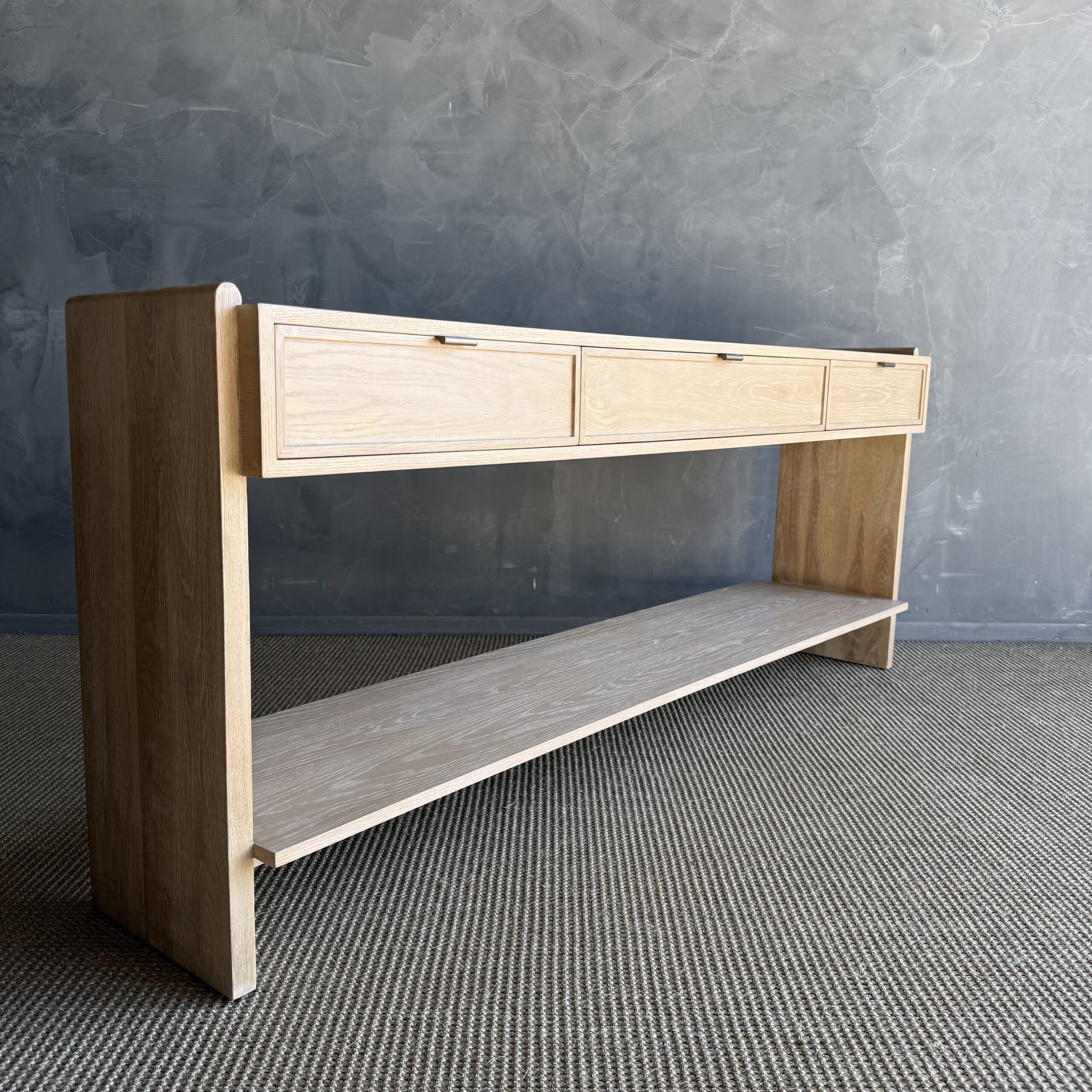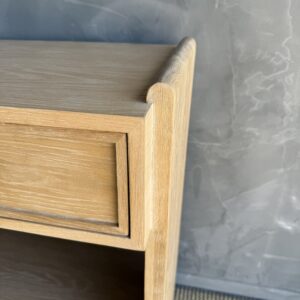 Thoughtfully designed for both form and function, the console features sleek drawers accented with elegant brass pulls, adding a warm contrast to the organic tones of the oak. The streamlined design allows the materials and craftsmanship to take center stage, creating a piece that feels both contemporary and enduring.