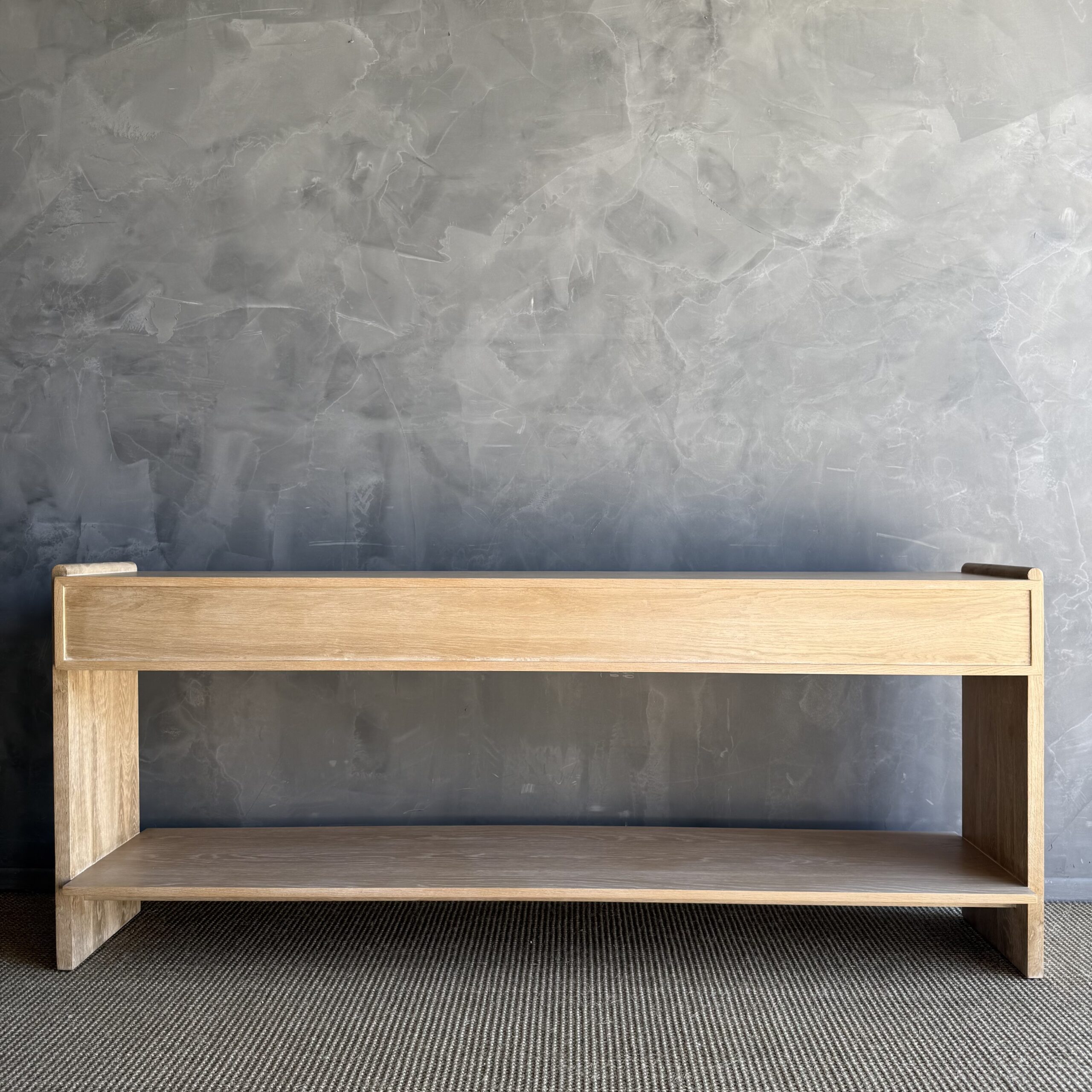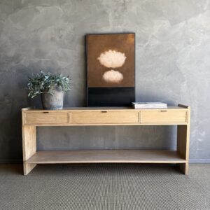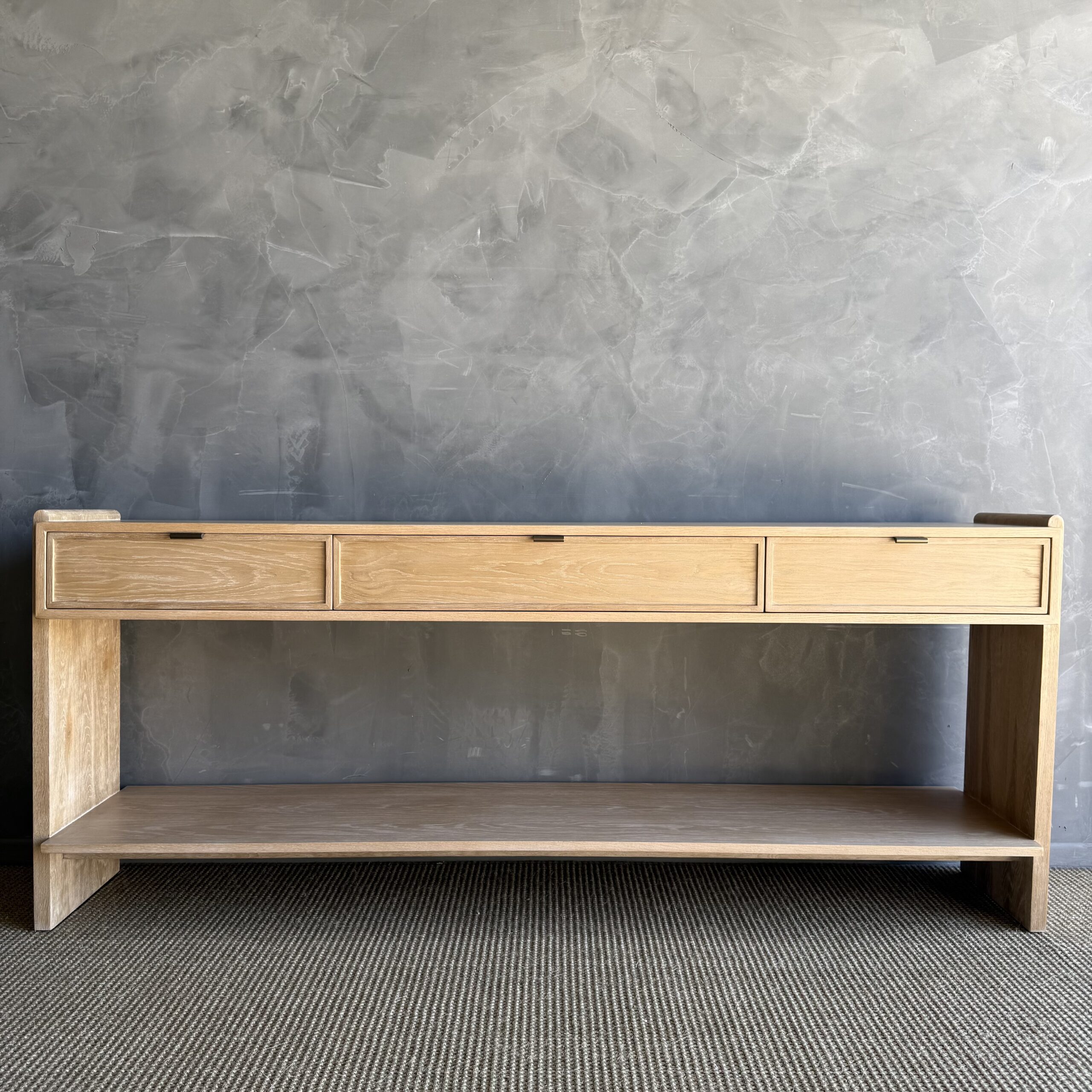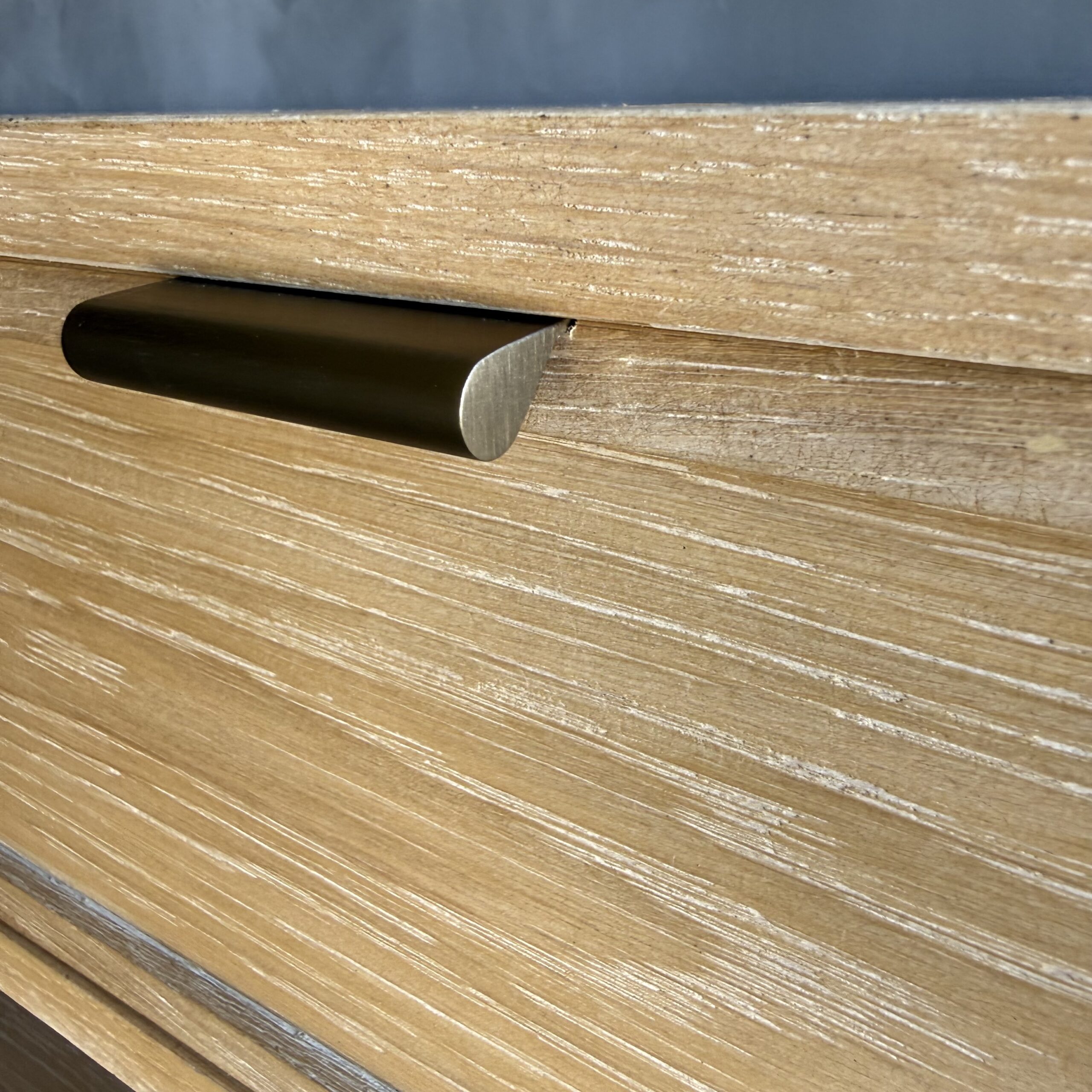Thoughtfully designed for both form and function, the console features sleek drawers accented with elegant brass pulls, adding a warm contrast to the organic tones of the oak. The streamlined design allows the materials and craftsmanship to take center stage, creating a piece that feels both contemporary and enduring.