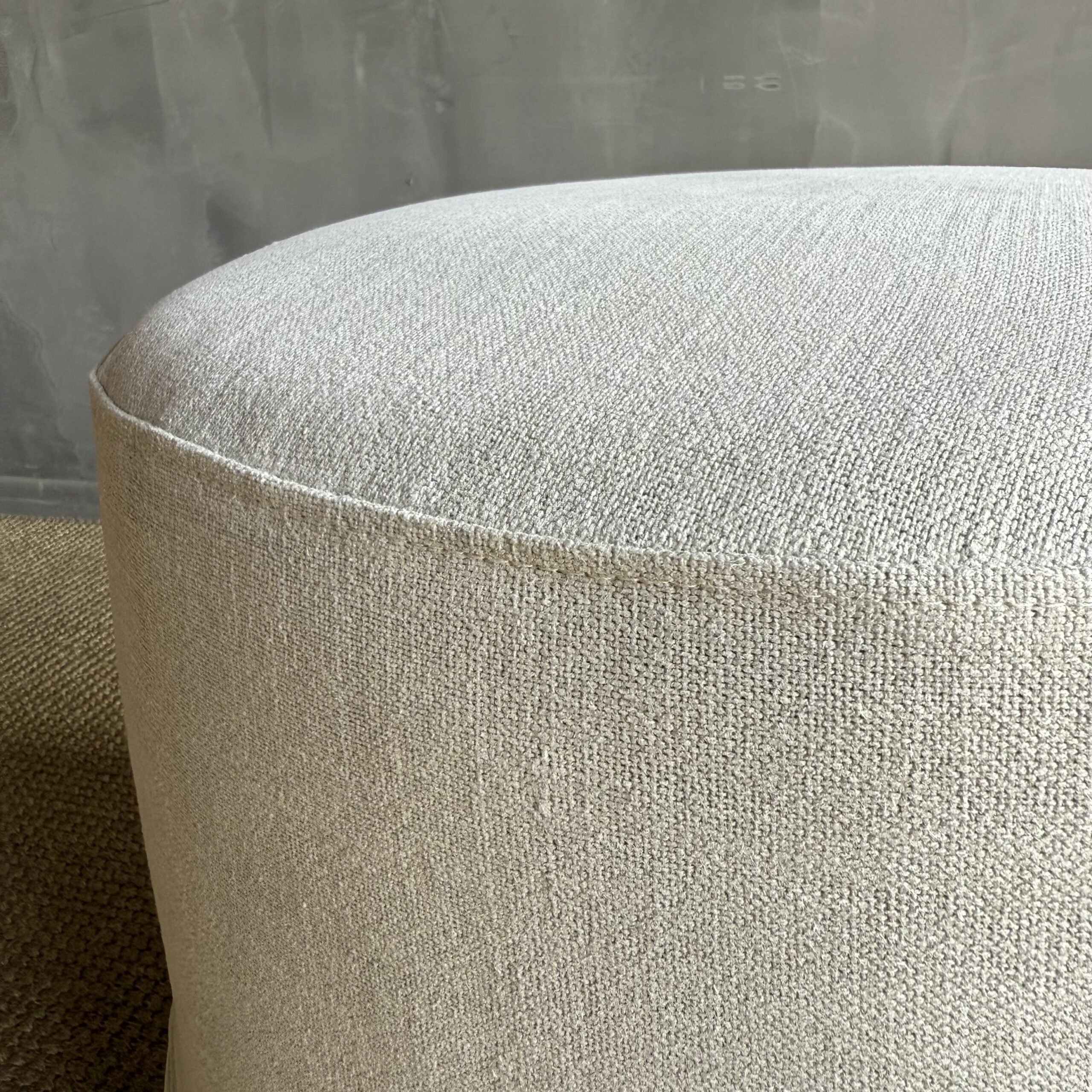 Our Bailey ottoman is upholstered in a sophisticated heavy weight hemp fabric with X pattern stitching, this ottoman is versatile and stylish. We have added a slip cover in the heavy stone washed Greige Linen. The pattern is subtle. A pleated skirt detail add sophistication to this ottoman. Very sturdy solid wood frame guarantees durability, while the medium-firm density foam offers both comfort and support. Whether you need additional seating or a footrest, this ottoman is perfect for any living room, bedroom, or entryway. Add a touch of functionality and chic style to your space with the Bailey Slip Covered Hemp Round Ottoman.