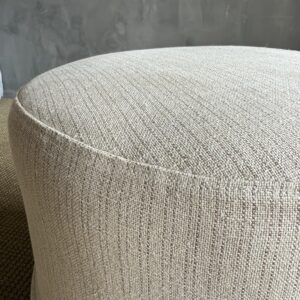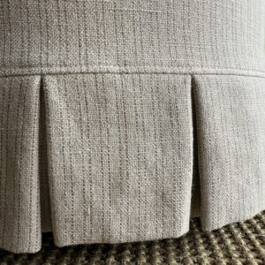 Our Bailey ottoman is upholstered in a sophisticated heavy weight hemp fabric with X pattern stitching, this ottoman is versatile and stylish. We have added a slip cover in the heavy stone washed flax with ticking stripe. The pattern is subtle. A pleated skirt detail add sophistication to this ottoman. Very sturdy solid wood frame guarantees durability, while the medium-firm density foam offers both comfort and support. Whether you need additional seating or a footrest, this ottoman is perfect for any living room, bedroom, or entryway. Add a touch of functionality and chic style to your space with the Bailey Slip Covered Hemp Round Ottoman.