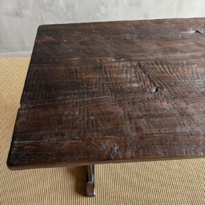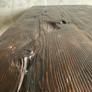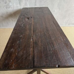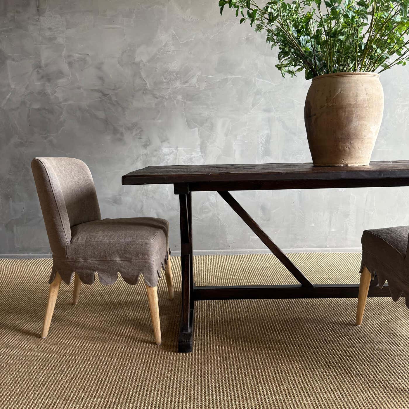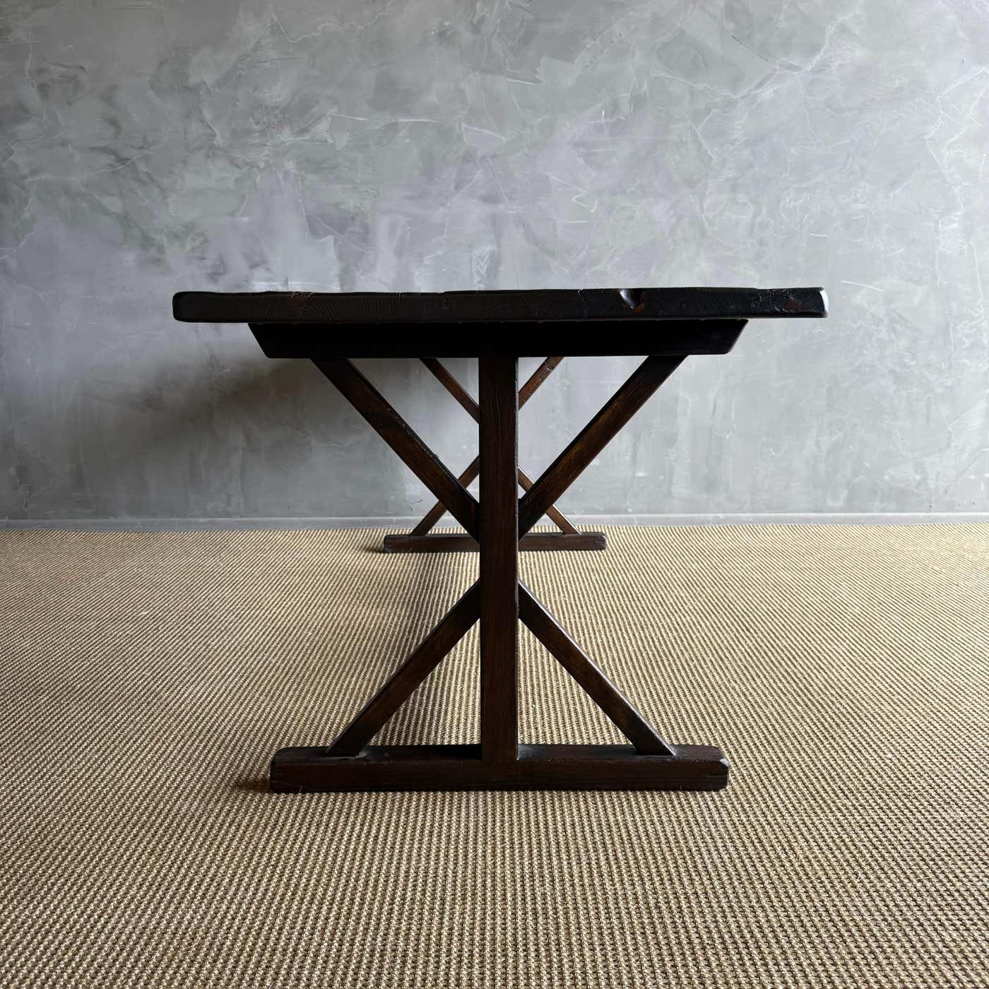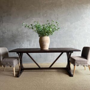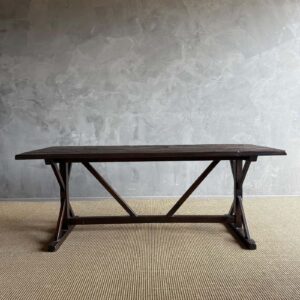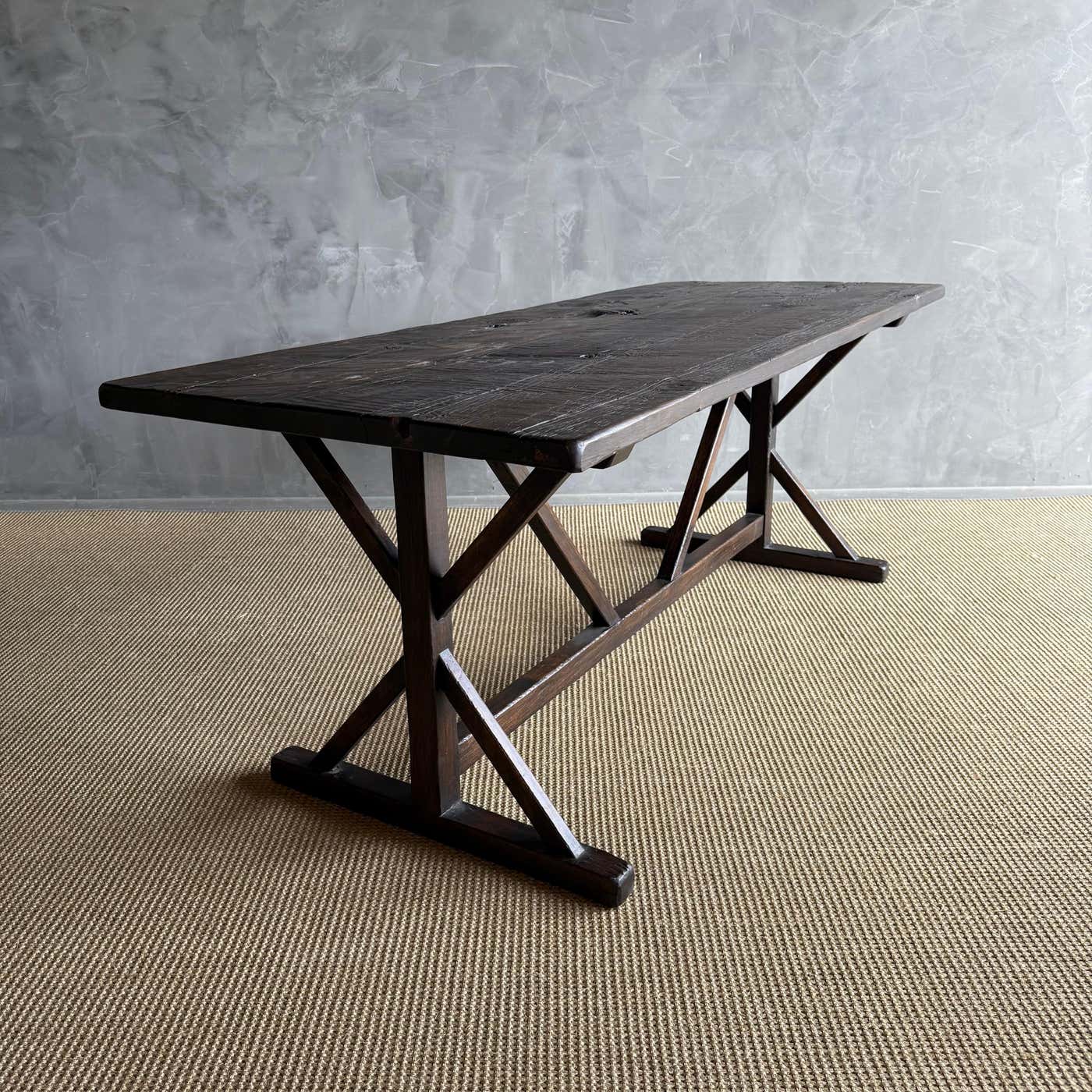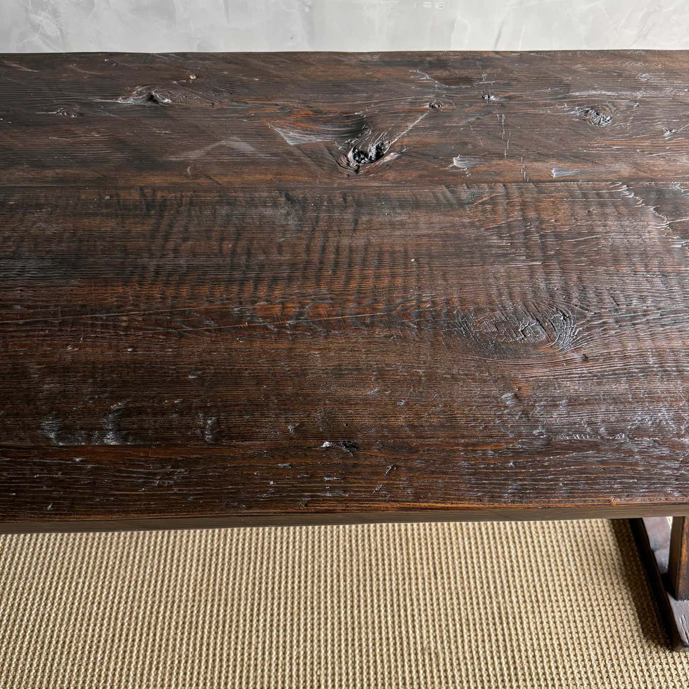 Trestle Dining Table crafted from reclaimed oak in a rich walnut stain. The unique crossgrain pattern adds a touch of rustic charm to any dining space.