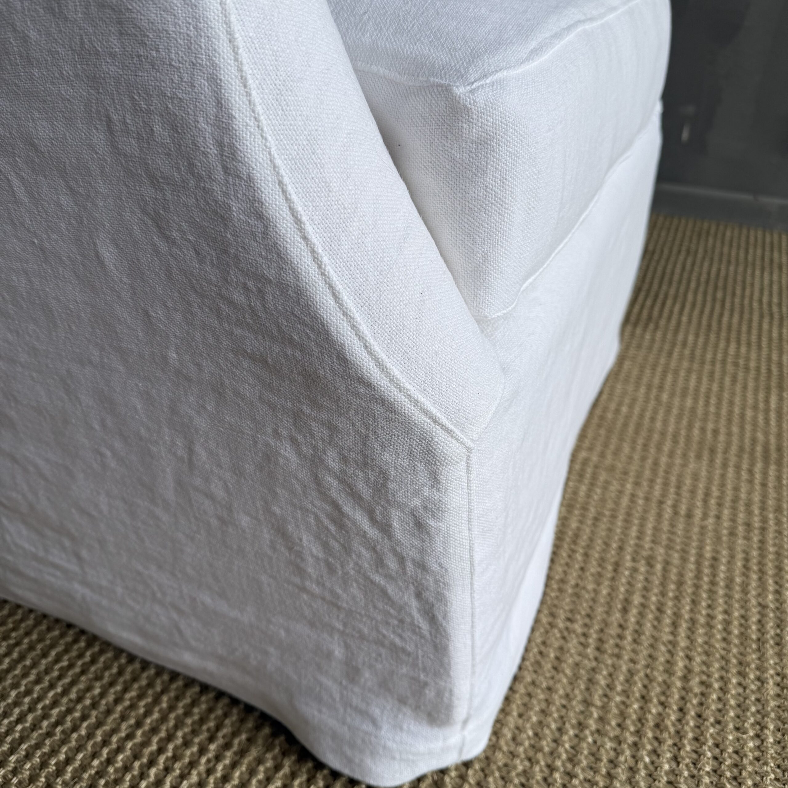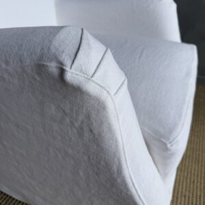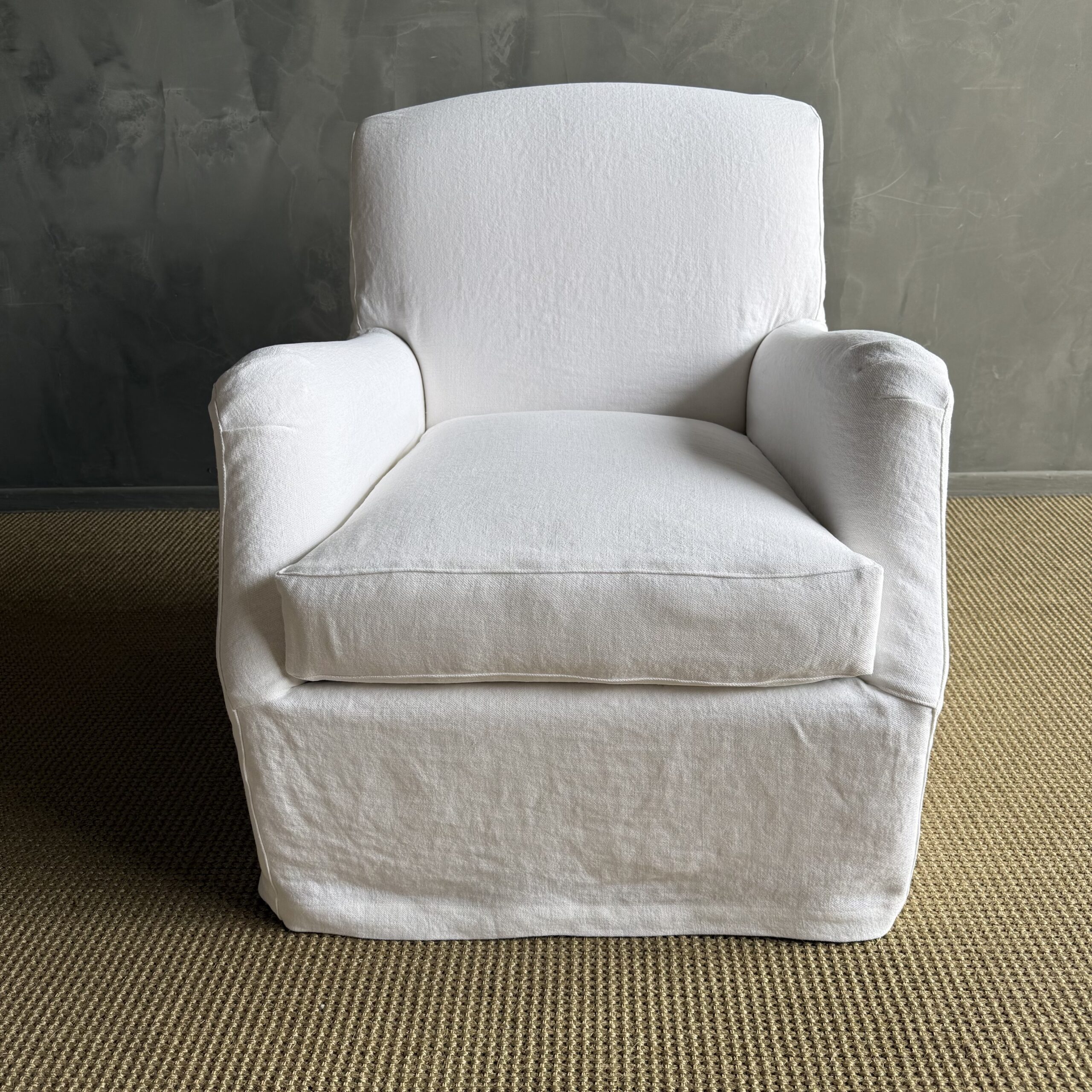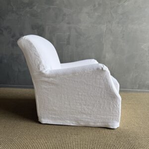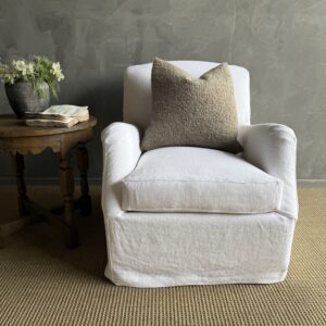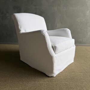 A timeless staple, this English roll arm chair offers a perfect balance of comfort and classic design. Slipcovered in linen for a relaxed, tailored look, it brings an effortless elegance to any room while remaining highly practical for everyday living.