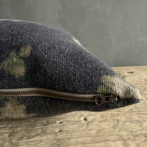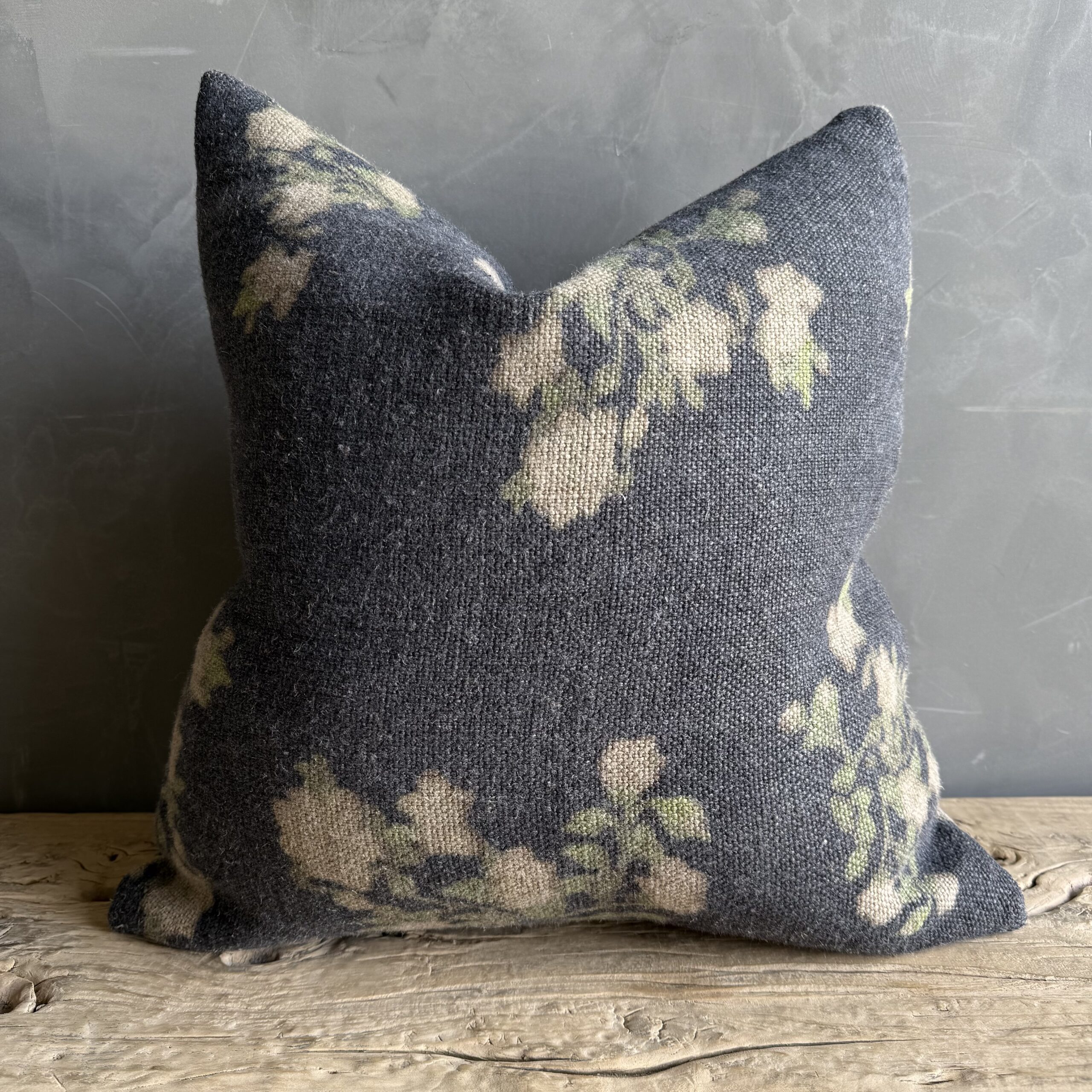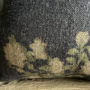 A faded stone washed black background, creme, beige, light grey and green floral accents. This pillow has a soft nubby texture, finished edge and metal zipper closure.