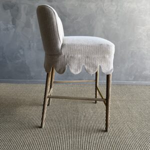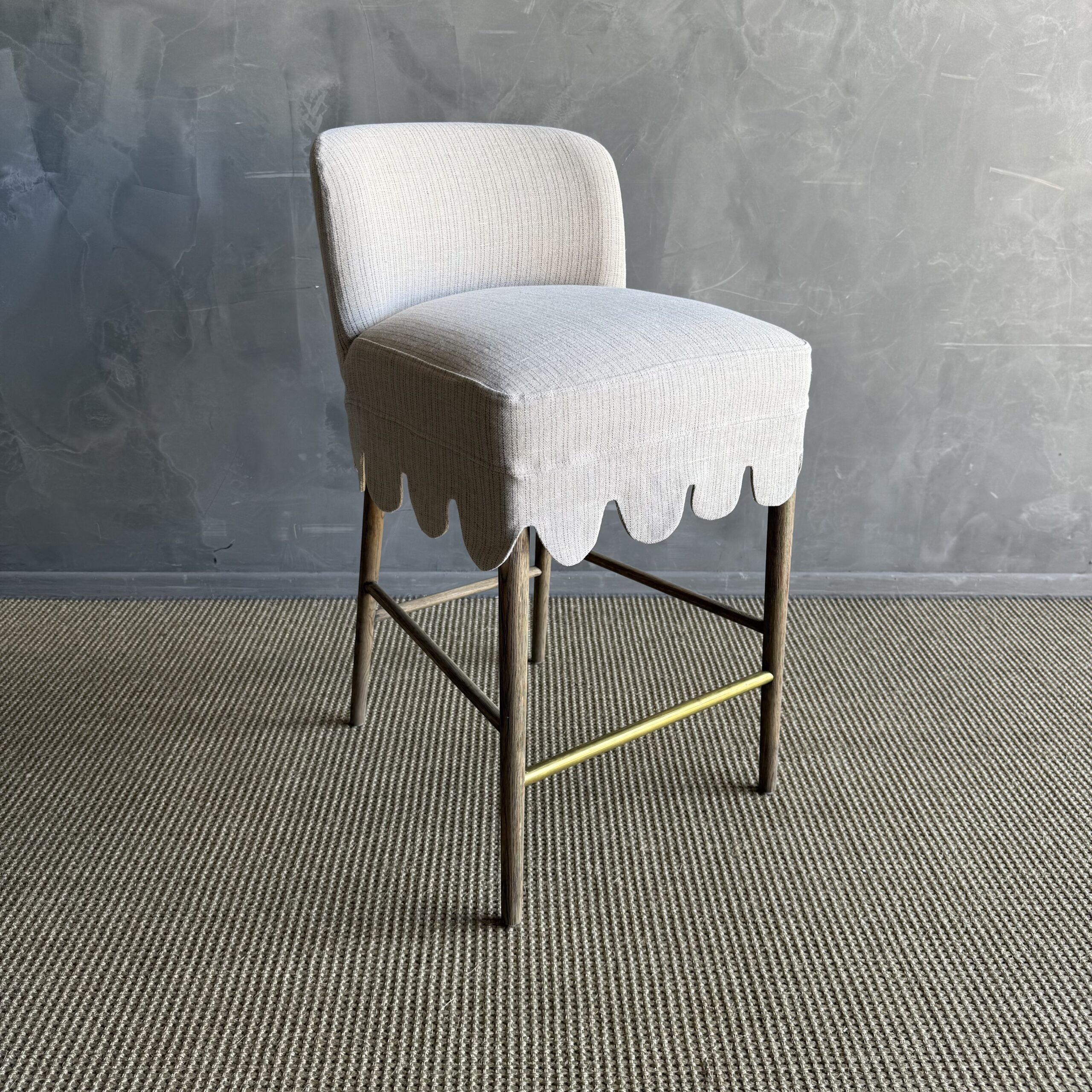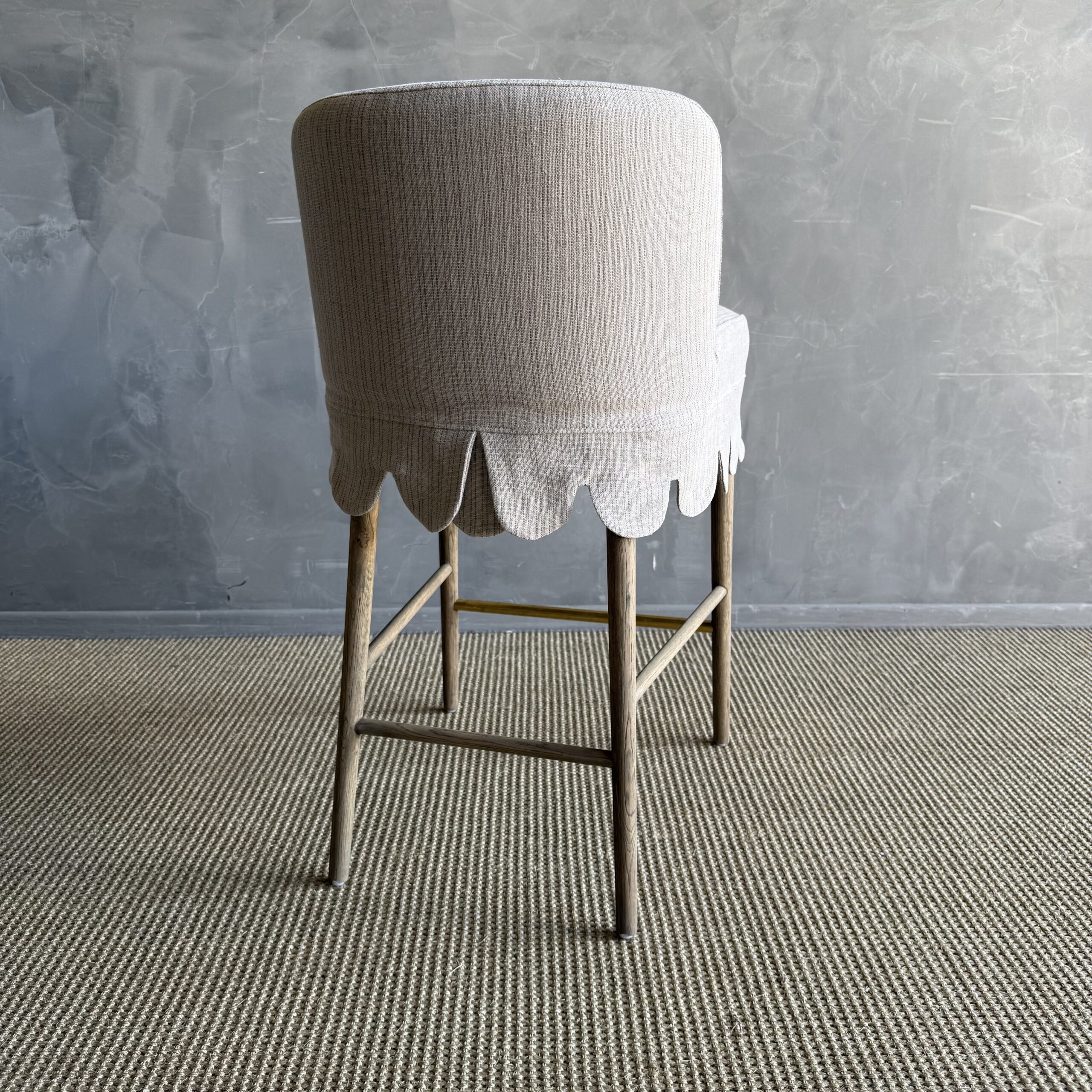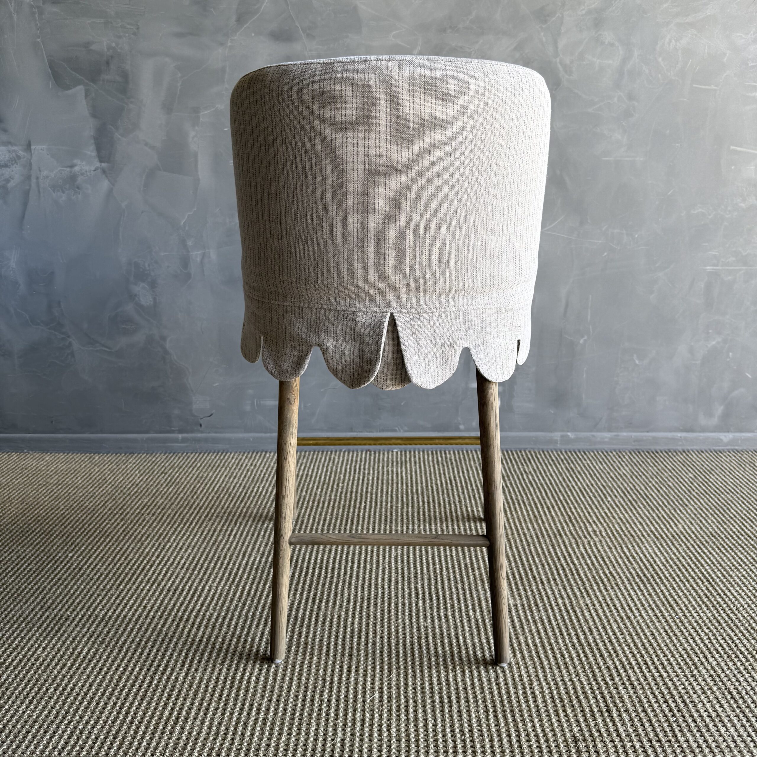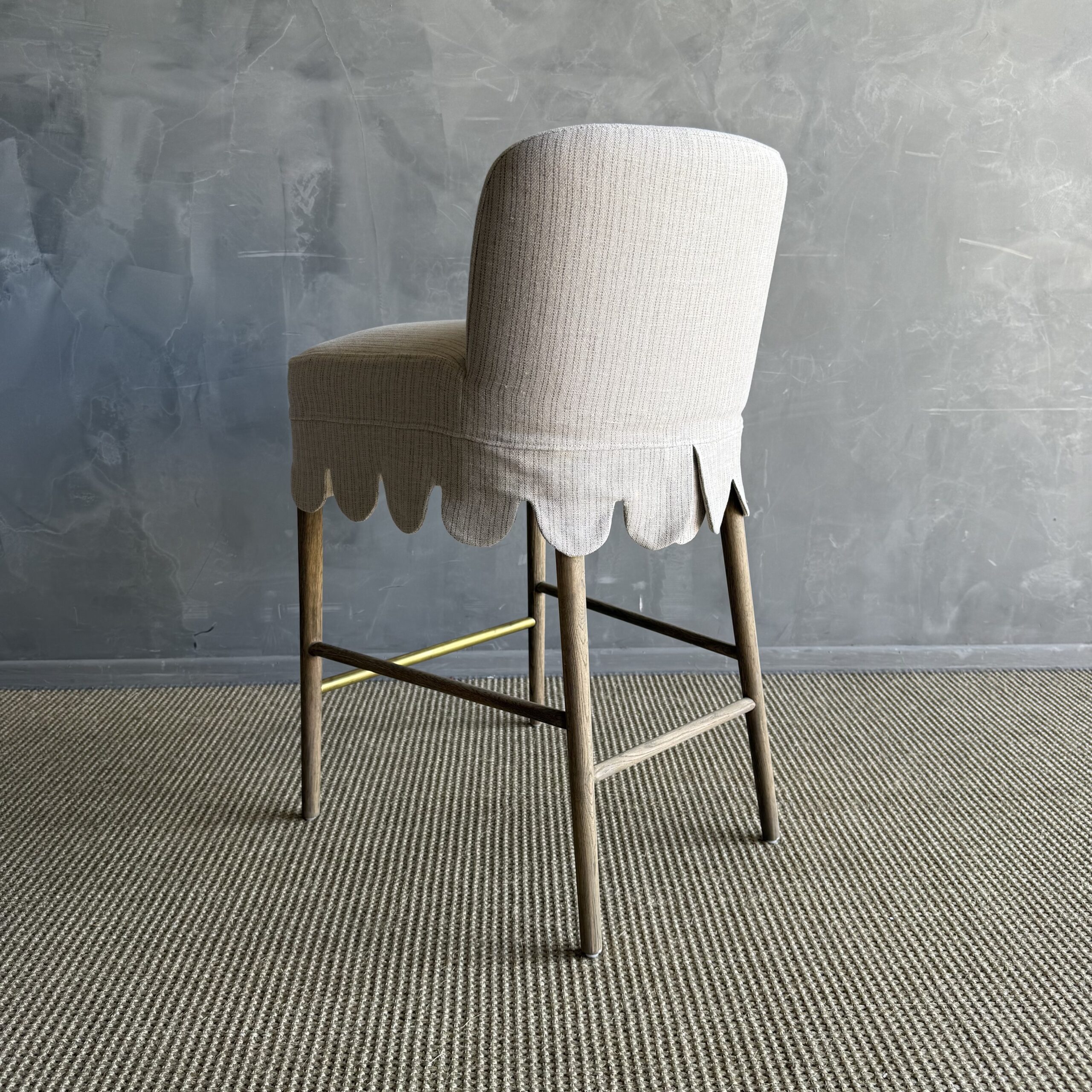 This linen slipcovered dining chair is a stylish and comfortable addition to any kitchen or bar. Made from heavy-weight fabric with a soft hand, it features scalloped detailing for a touch of elegance. The counter stool is supported by solid white oak legs, and decorative unlacquered brass foot rest, giving it a sturdy and durable base. The slipcover is machine washable for easy cleaning, although spot cleaning or dry cleaning is recommended to maintain its quality. With its comfortable design, this stool is perfect for gatherings, ensuring you can sit and relax in comfort and style.