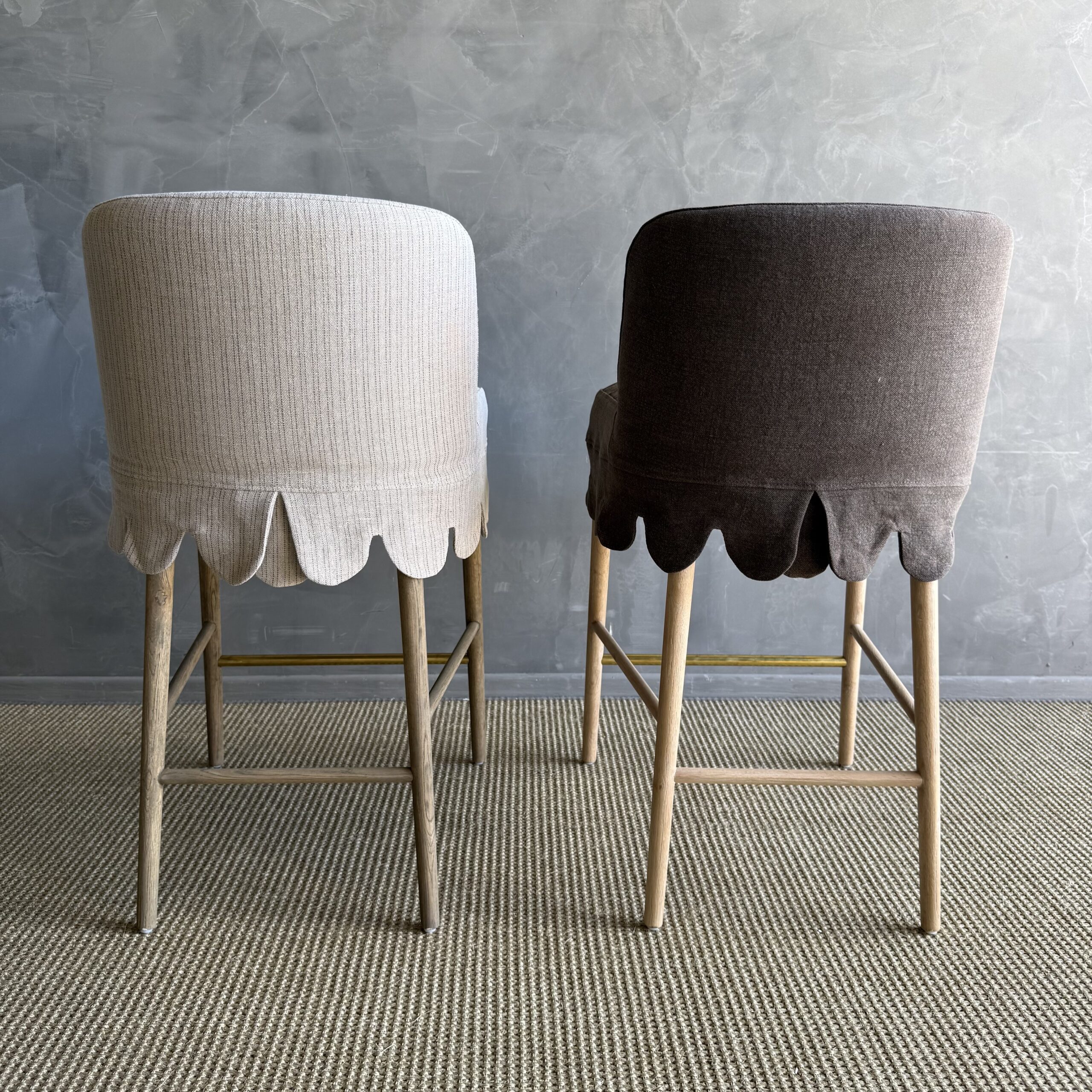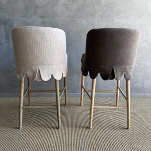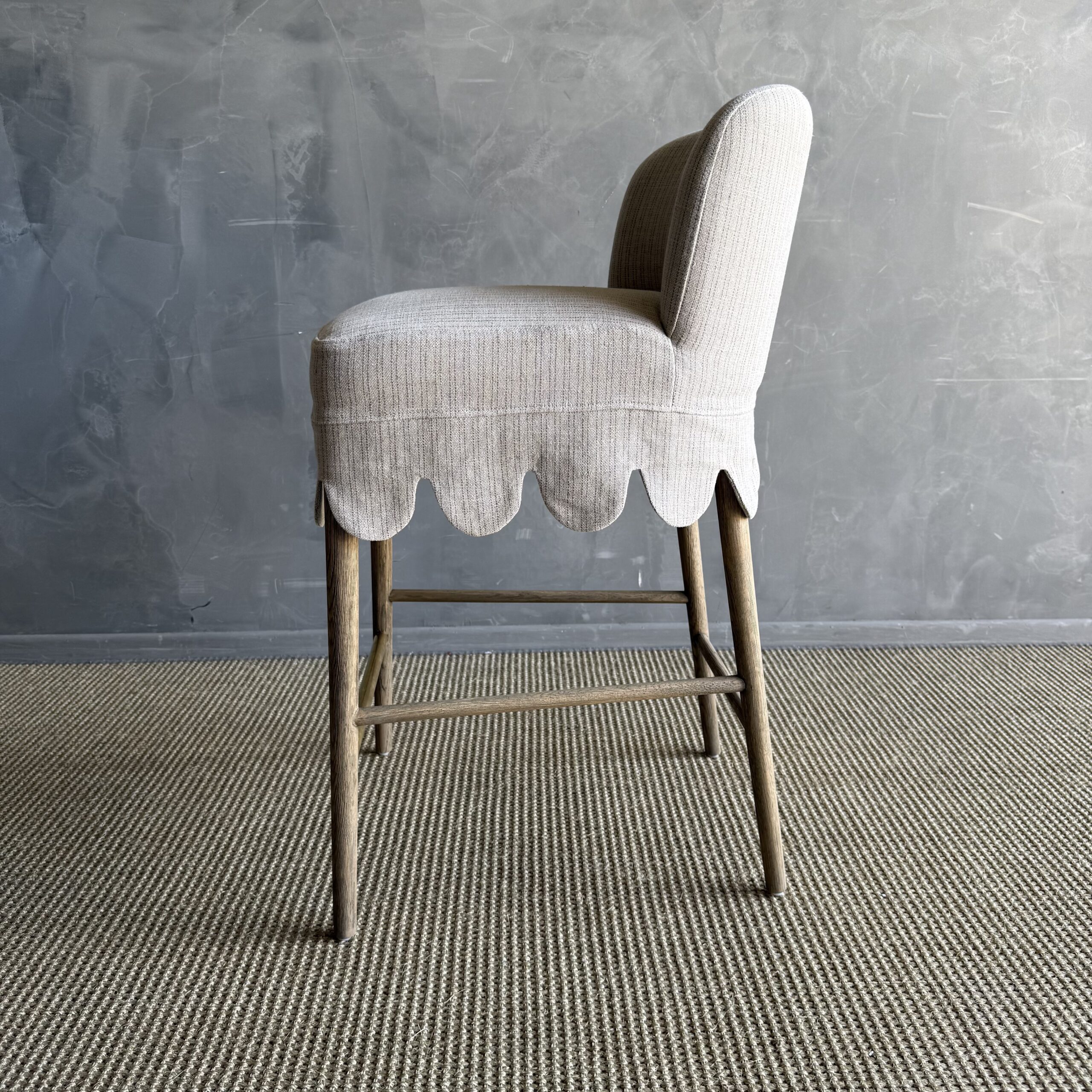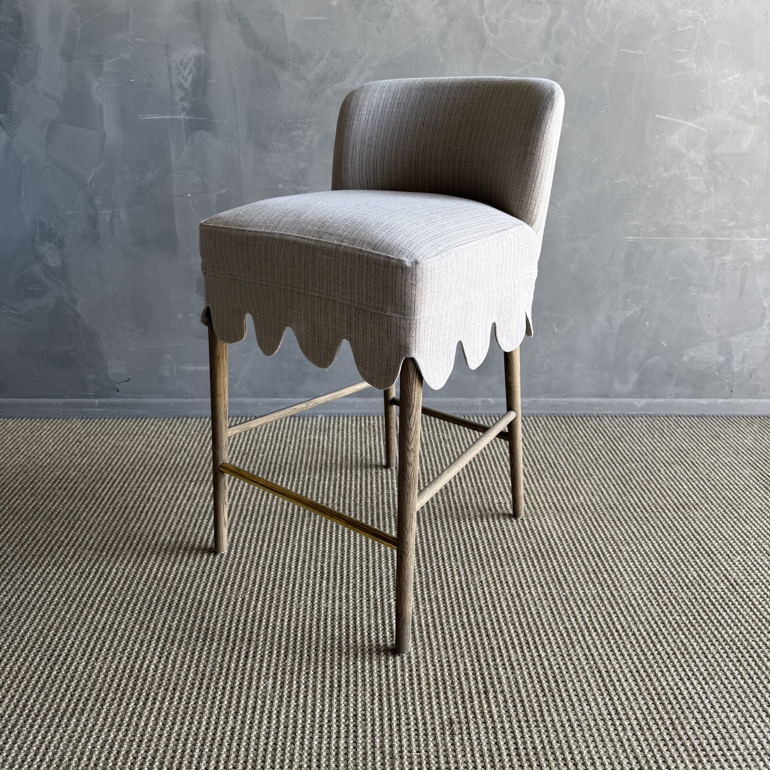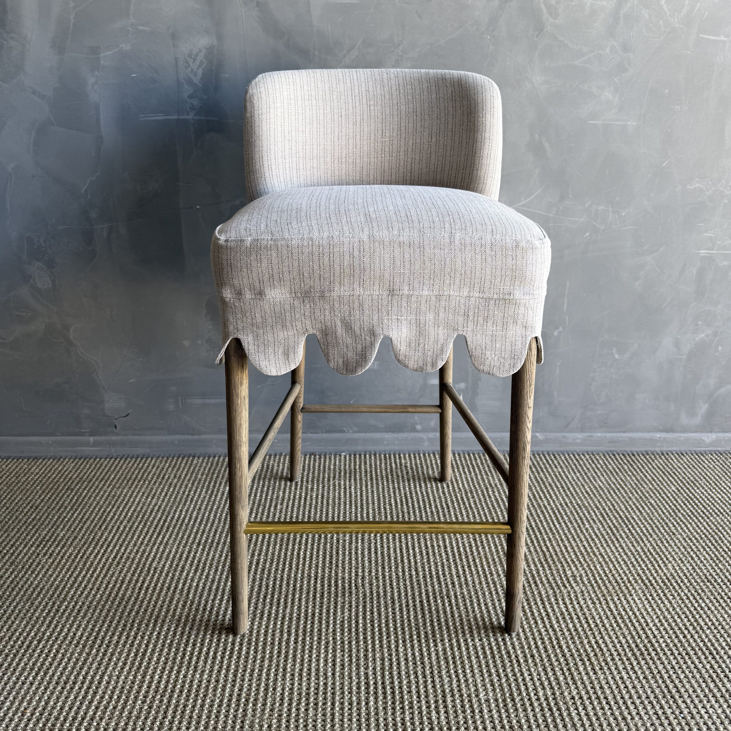 This linen slipcovered dining chair is a stylish and comfortable addition to any kitchen or bar. Made from heavy-weight fabric with a soft hand, it features scalloped detailing for a touch of elegance. The counter stool is supported by solid white oak legs, and decorative unlacquered brass foot rest, giving it a sturdy and durable base. The slipcover is machine washable for easy cleaning, although spot cleaning or dry cleaning is recommended to maintain its quality. With its comfortable design, this stool is perfect for gatherings, ensuring you can sit and relax in comfort and style.