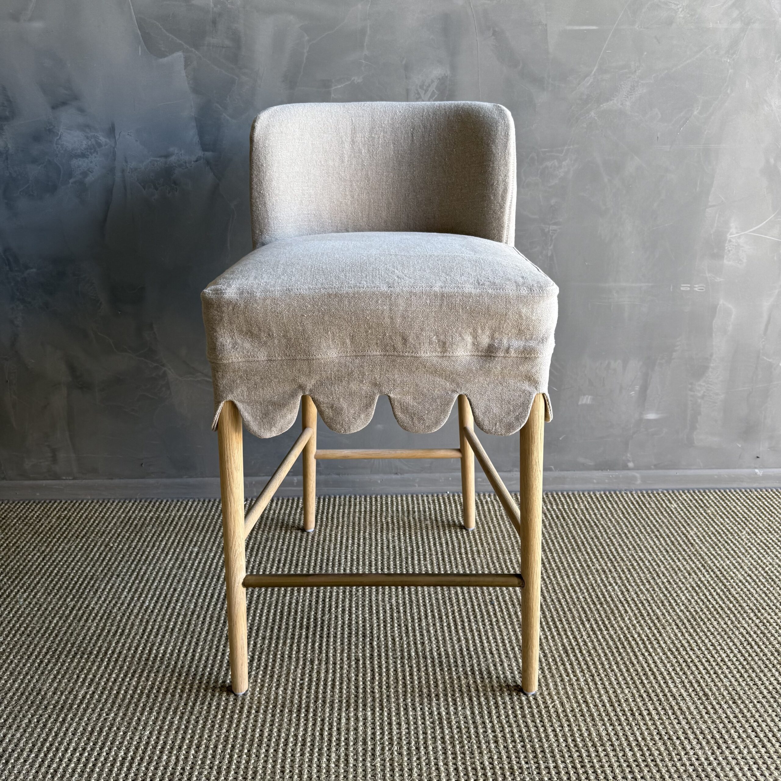 This linen slipcovered dining chair is a stylish and comfortable addition to any kitchen or bar. Made from heavy-weight fabric with a soft hand, it features scalloped detailing for a touch of elegance. The counter stool is supported by solid white oak legs, and decorative unlacquered brass foot rest, giving it a sturdy and durable base. The slipcover is machine washable for easy cleaning, although spot cleaning or dry cleaning is recommended to maintain its quality. With its comfortable design, this stool is perfect for gatherings, ensuring you can sit and relax in comfort & style.