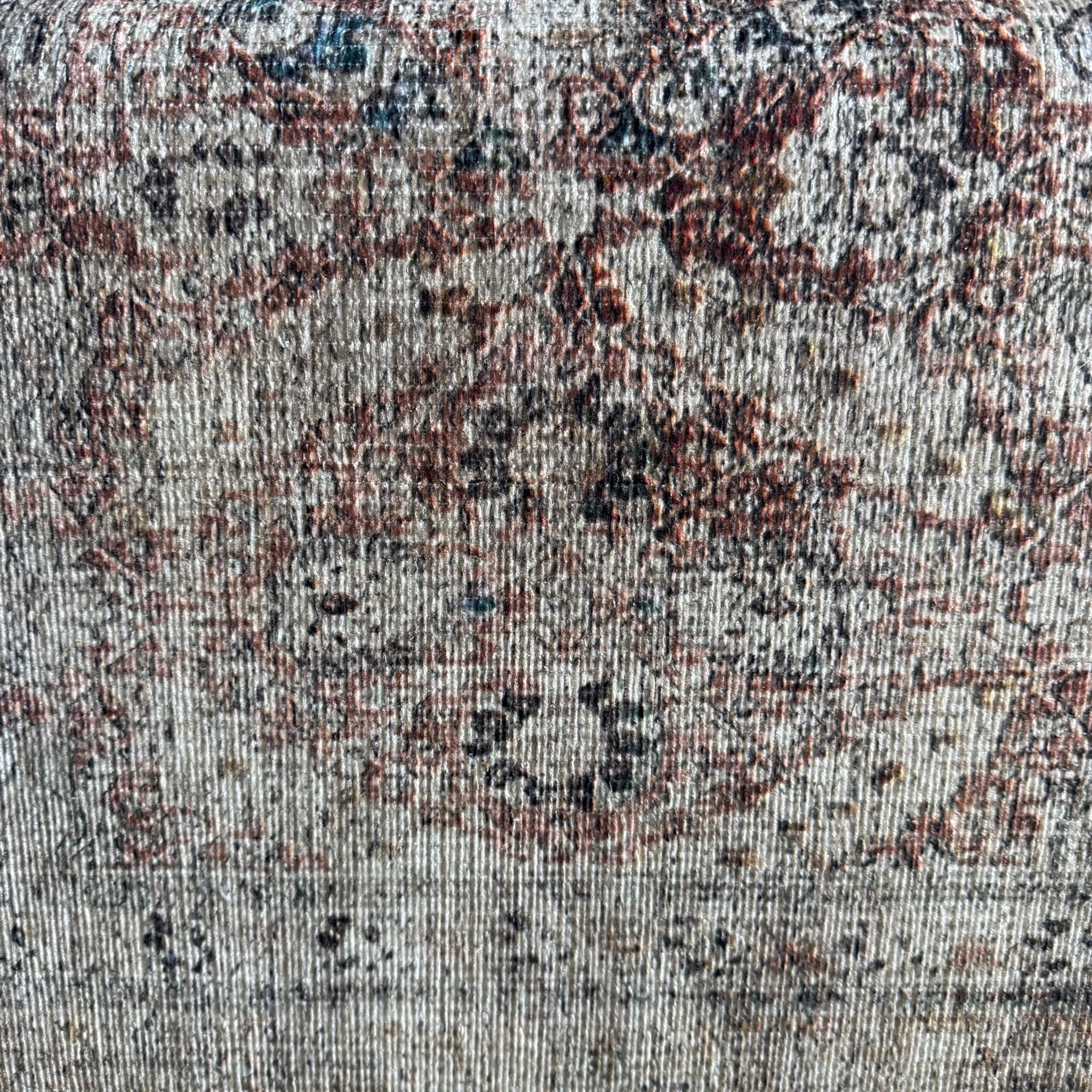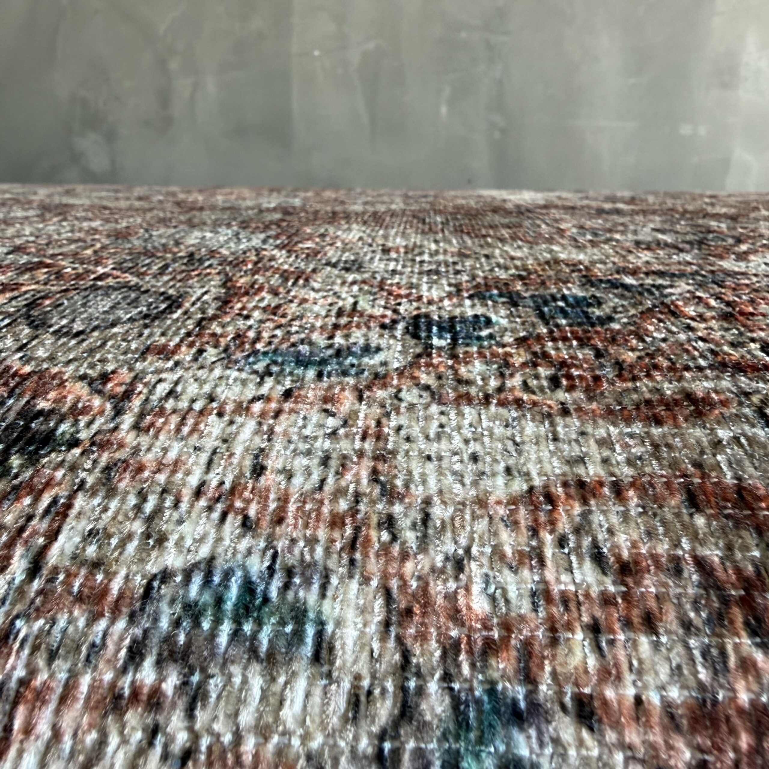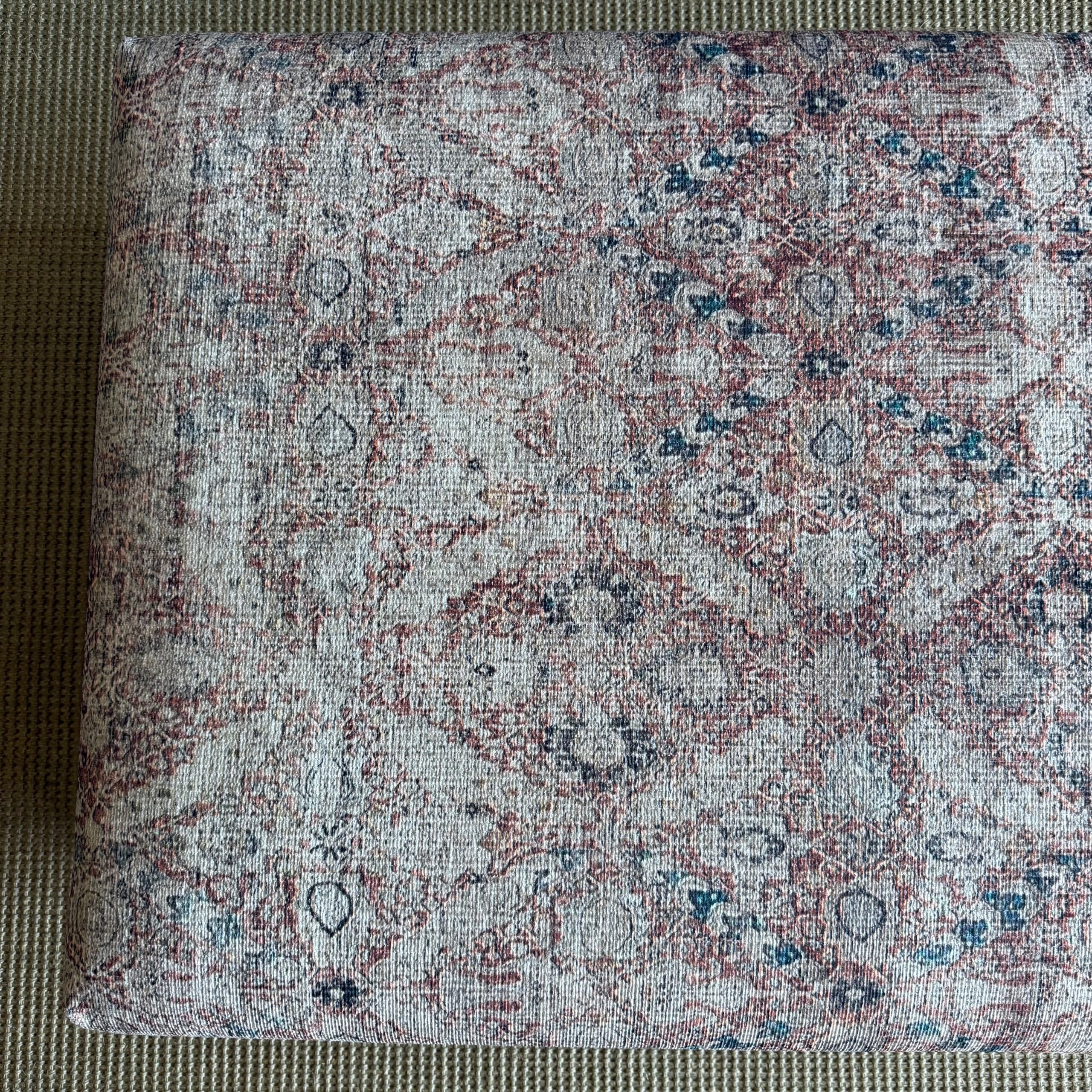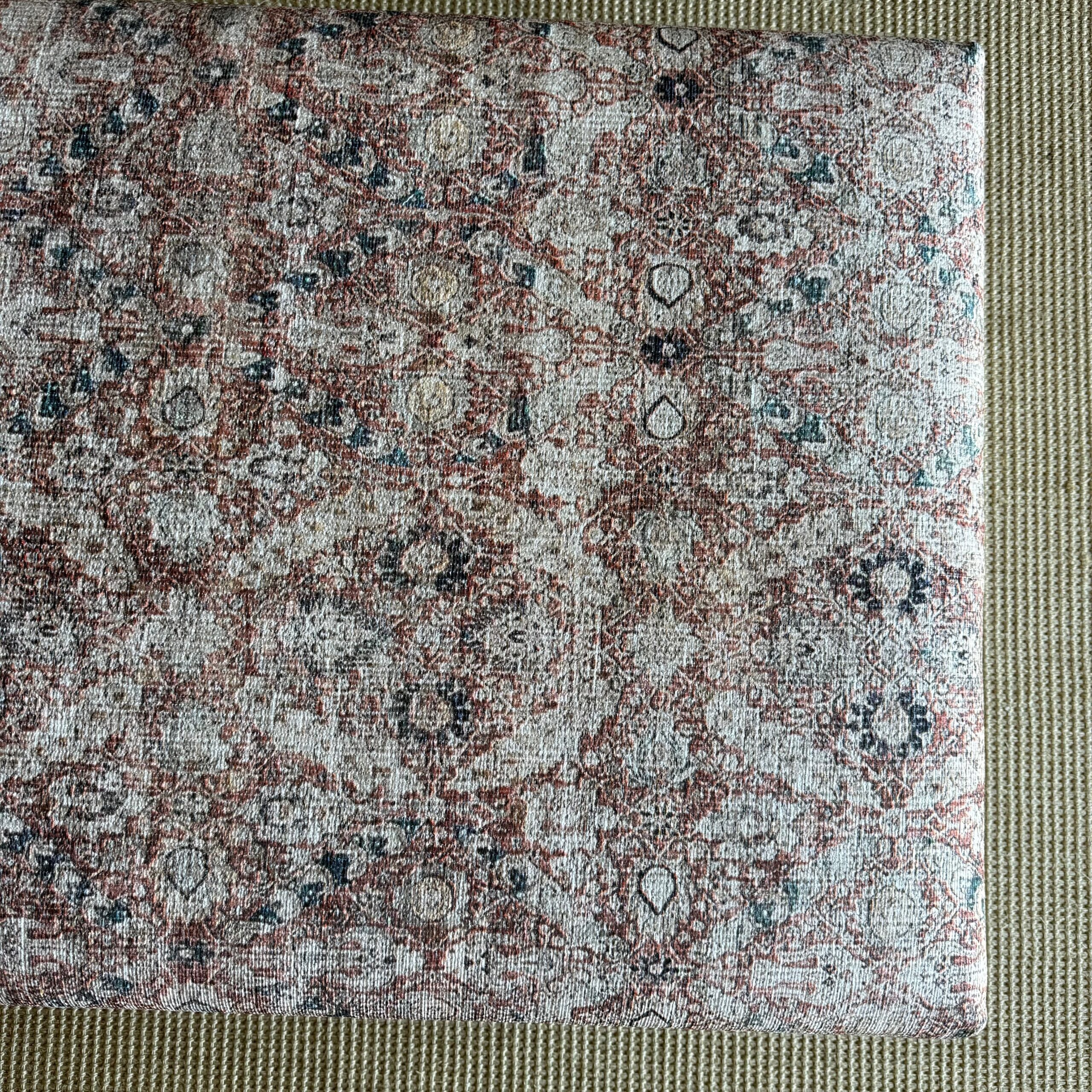 The base is upholstered in vintage looking washable Turkish rug. The fabric has a lot of character, and a very soft hand, easy to wipe clean.The main colors are light & dark blues, rusts, creamy white, gray and greens.