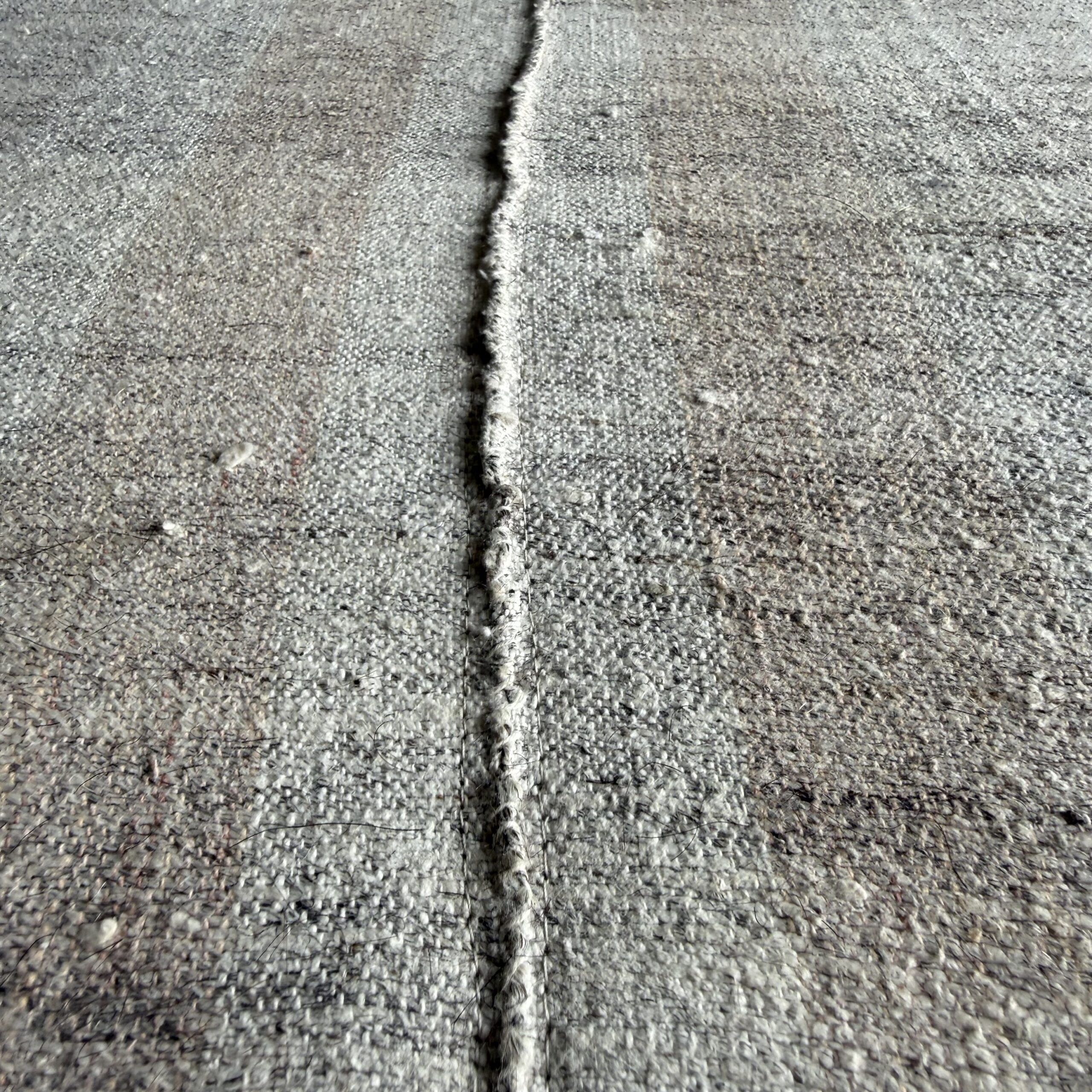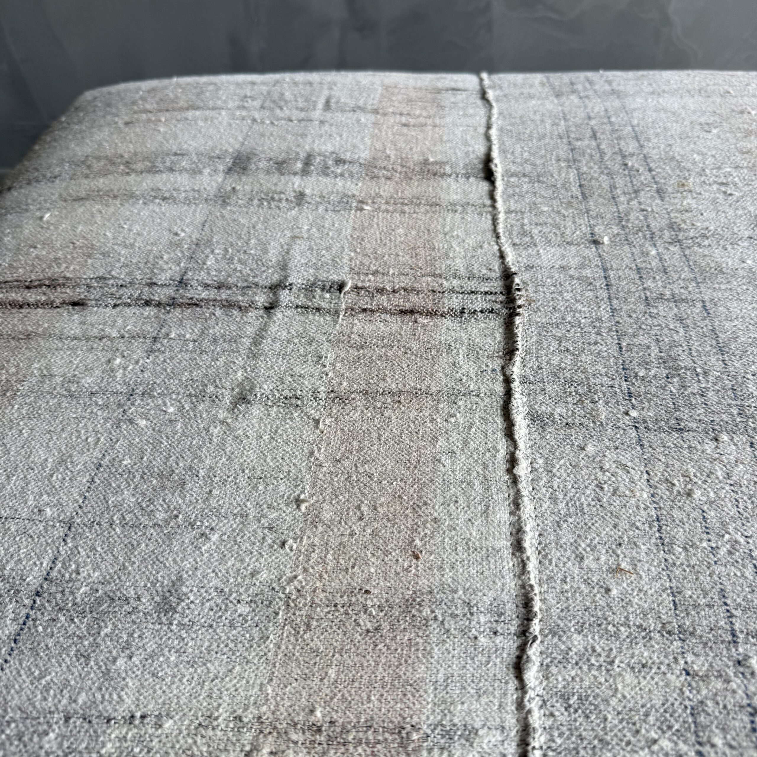 The base is upholstered in vintage Turkish rug wool in a soft checker pattern of creamy white, beige blush, and warm brown tones. The fabric has a lot of character, with original seams and subtle imperfections that come from its age and history.