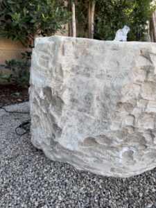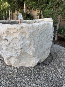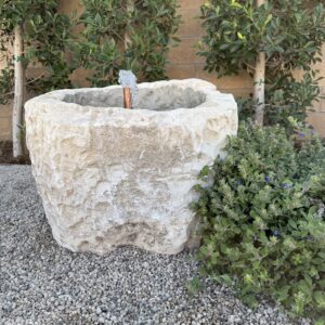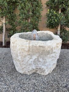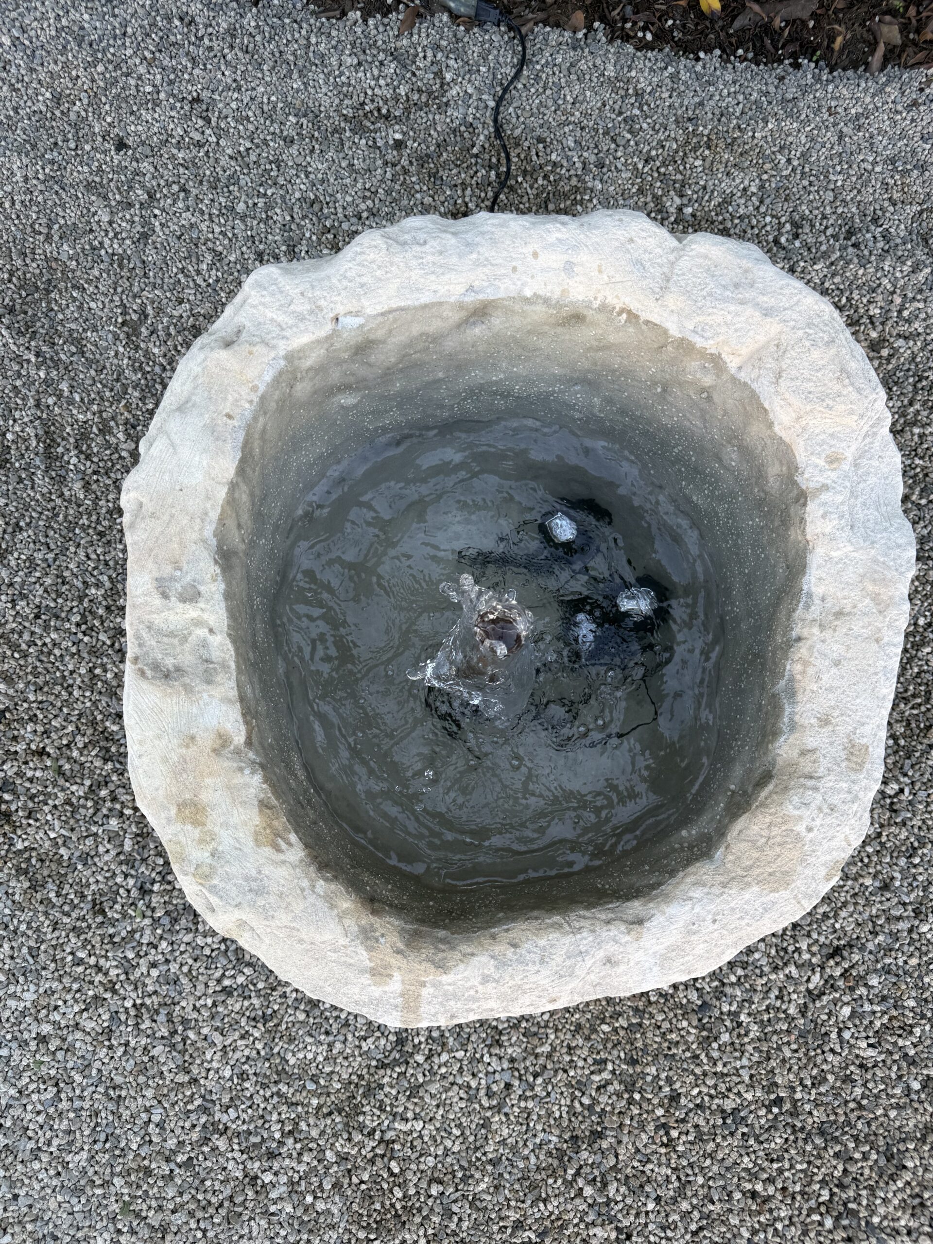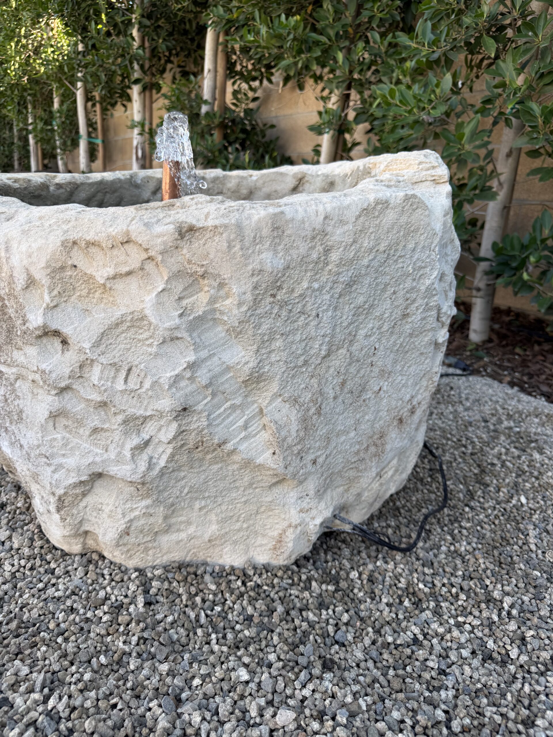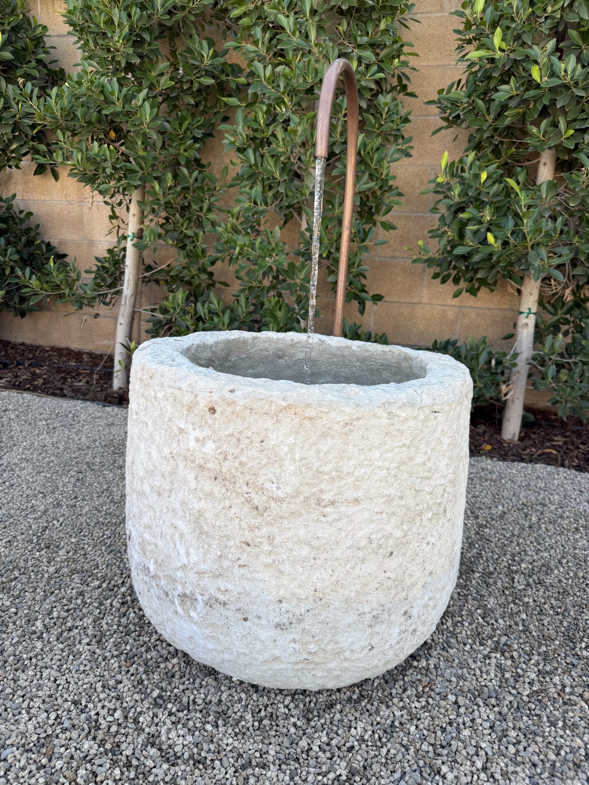 We’ve transformed this beautiful large limestone trough into a fountain, using copper piping that will patina even more over time turning a rich brown color. This fountain has the option to use the lights we included, There is an on-off switch for the lighting.