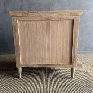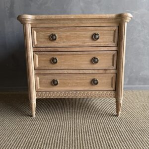 Louis XVI style 3 drawer nightstand in a beautiful natural white oak finish. The elegant design of this Louis XVI nightstand features intricate detailing and craftsmanship that exudes luxury and sophistication. With three soft close drawers, this nightstand offers ample storage space for your essentials while adding a touch of French charm to your bedroom. Made from high-quality materials, this nightstand is not only stylish but also durable, making it a timeless piece that will elevate the aesthetic of your bedroom for years to come.