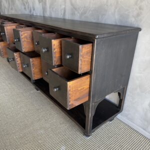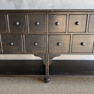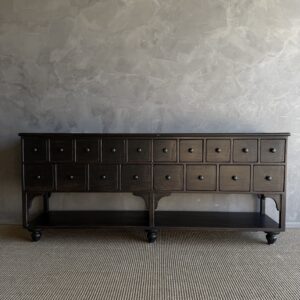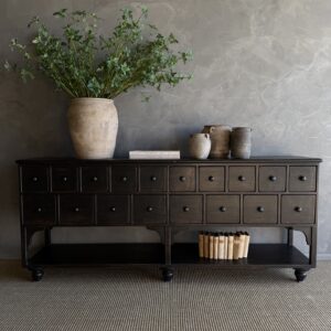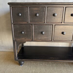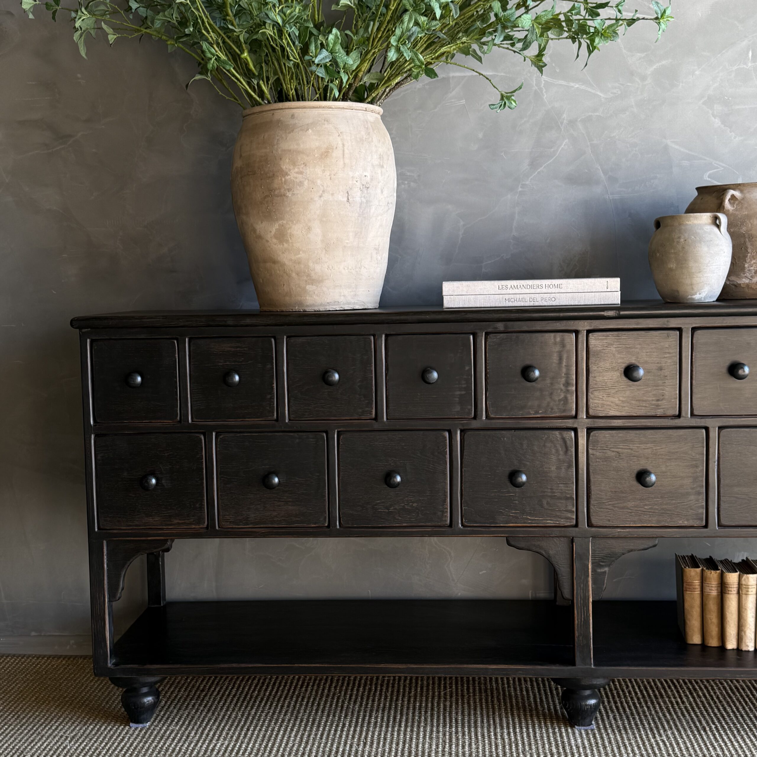Crafted with reclaimed wood in an ebony painted finish, this console will add a timeless look to any space. With its abundance of drawers, it serves as an excellent entry piece or server, providing storage for all your essentials. All drawers feature dovetail construction, and open and close with ease.