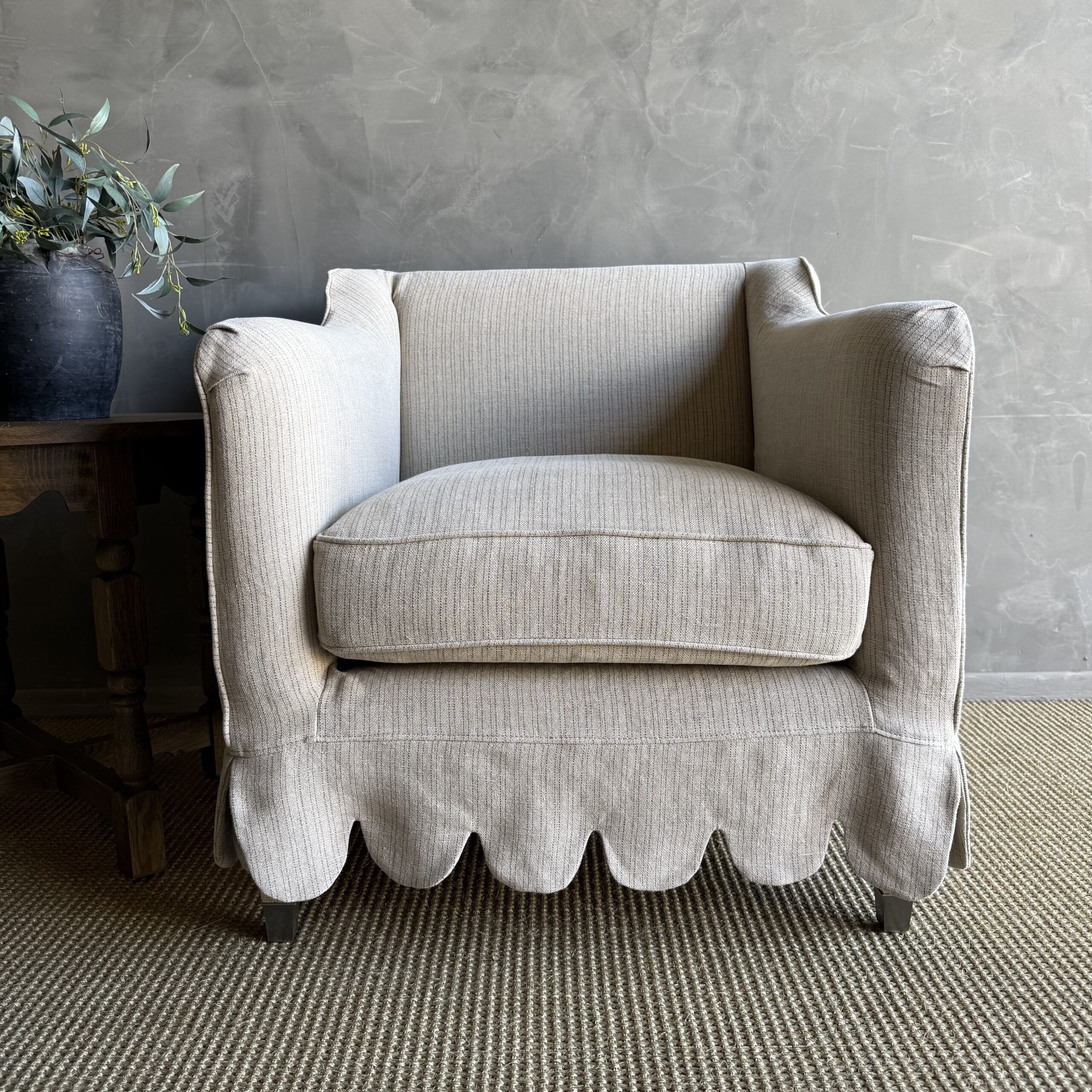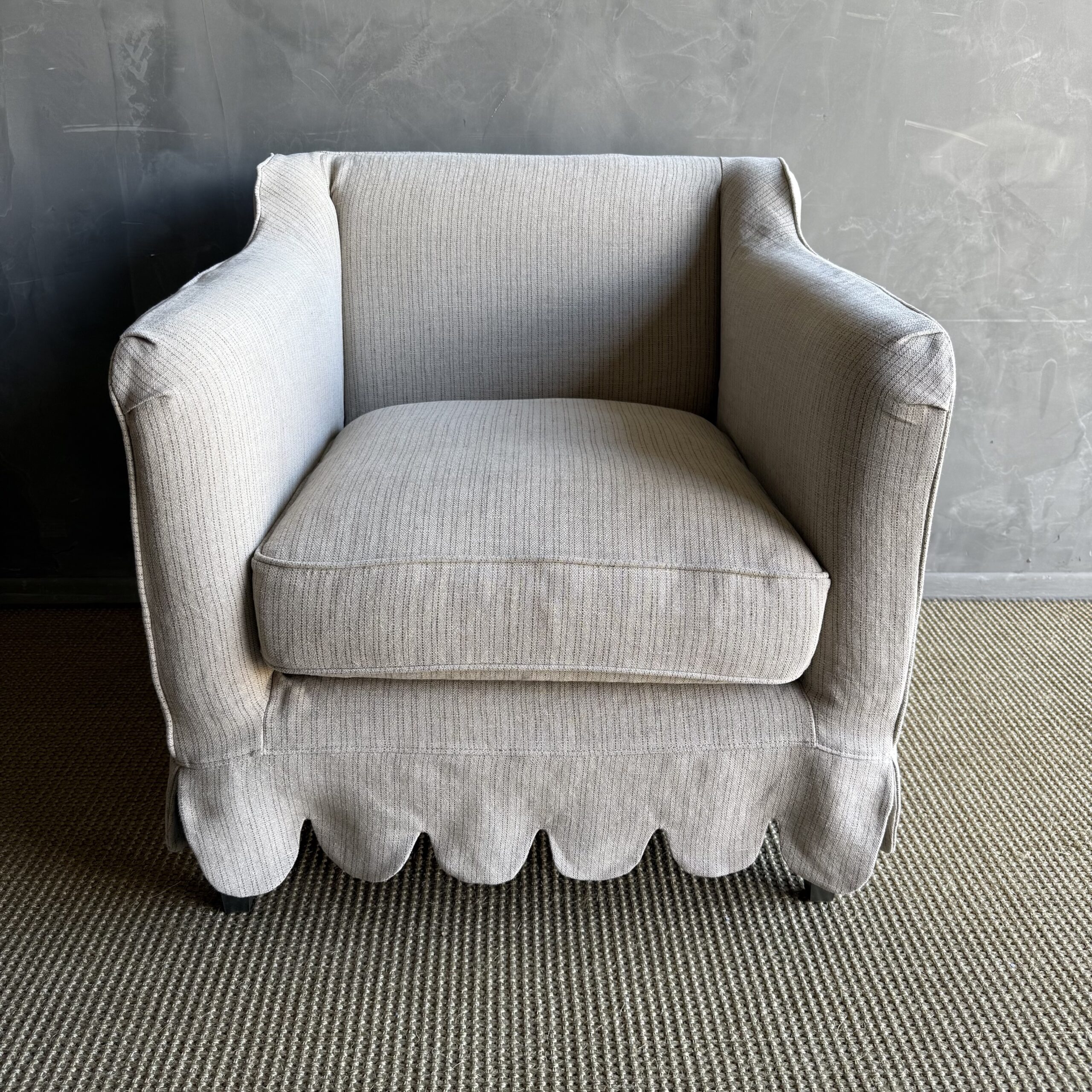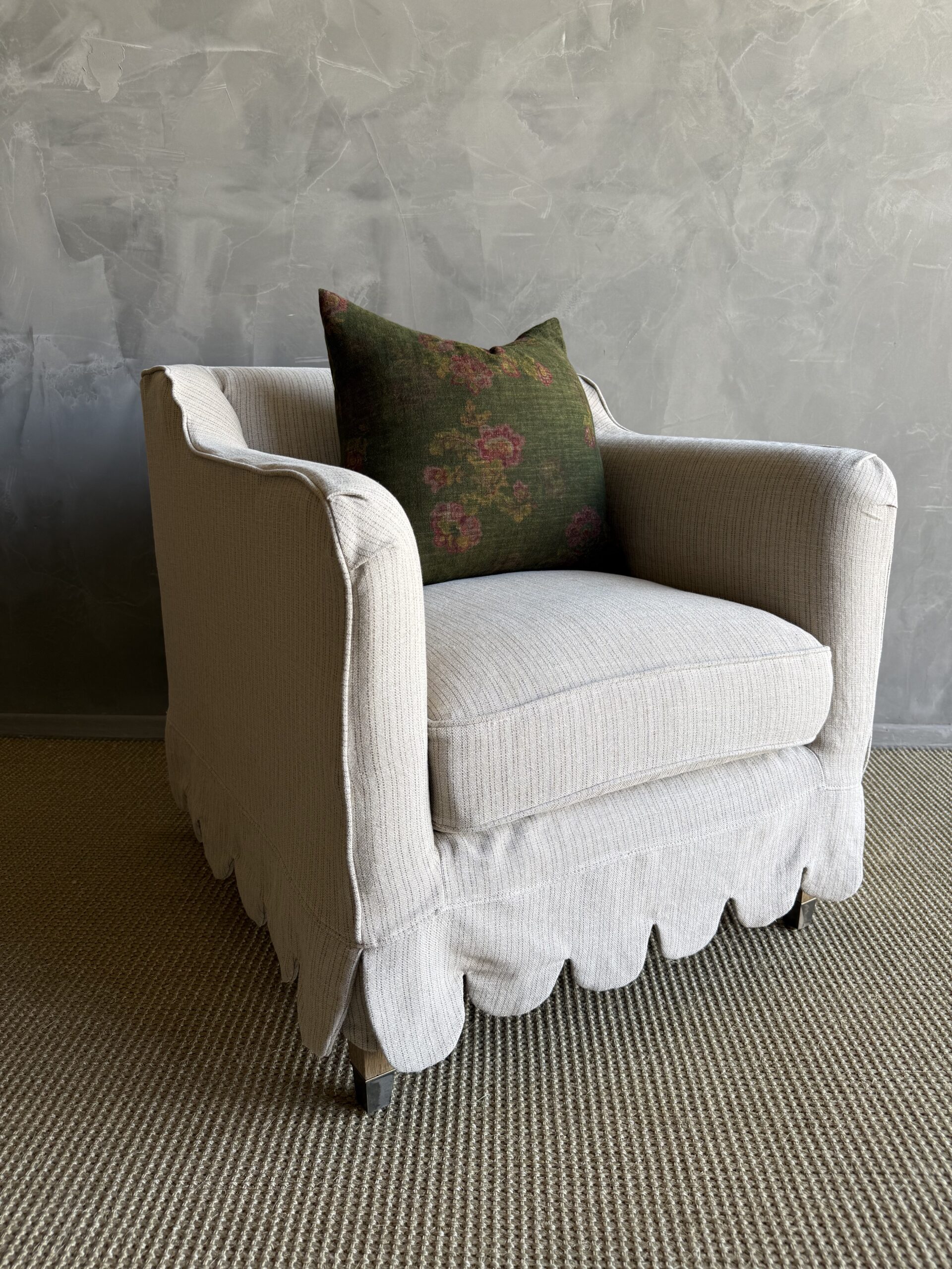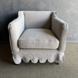 A softly tailored scalloped skirt adds a distinctive design detail, bringing a touch of charm and movement to the chair’s silhouette while maintaining a sophisticated, tailored finish. The seat is designed for exceptional comfort, featuring a down-wrapped foam core cushion that offers the perfect balance of support and softness.