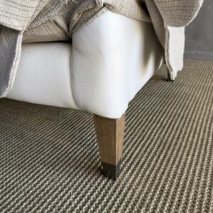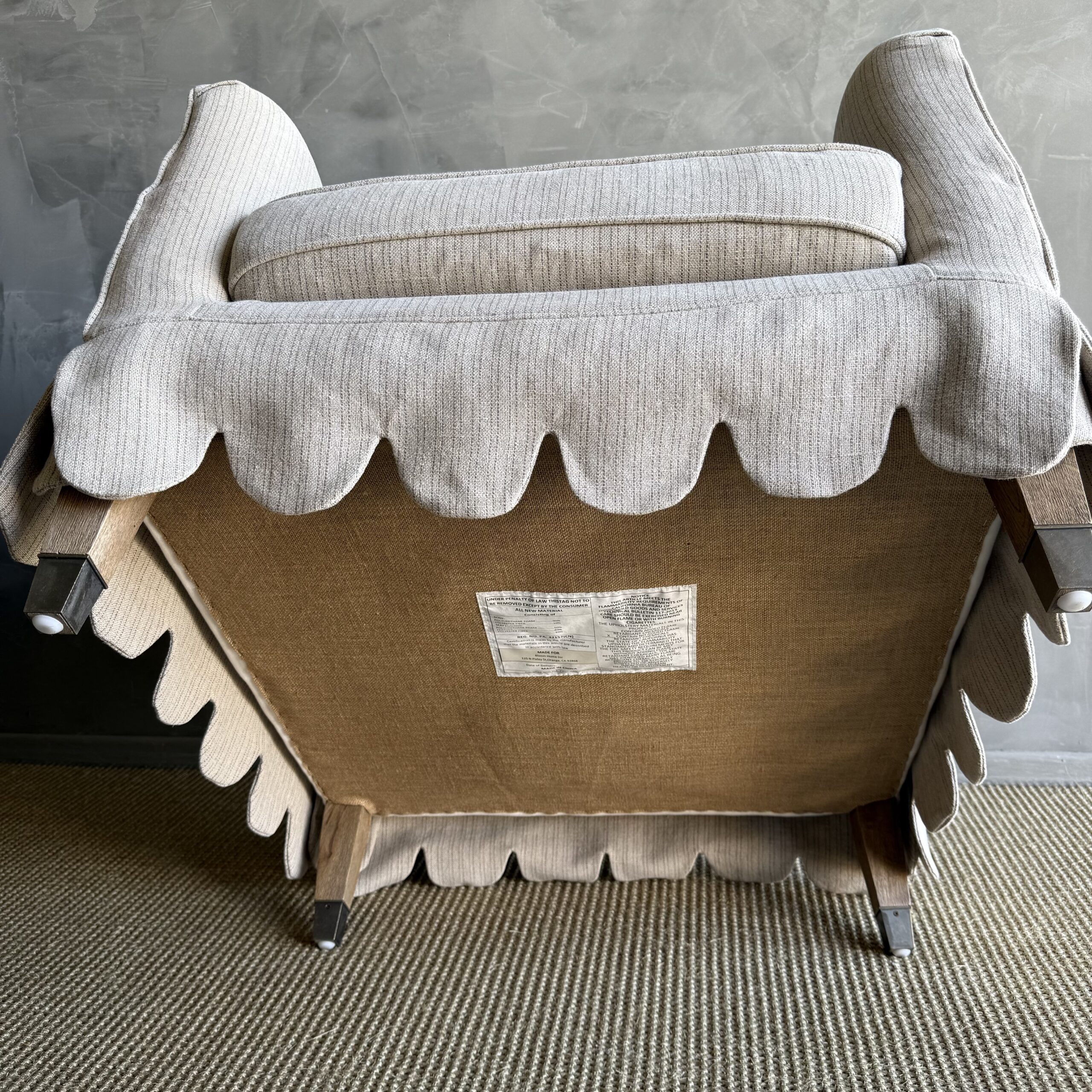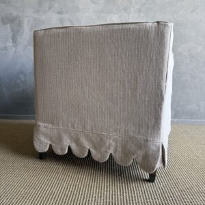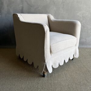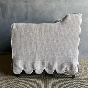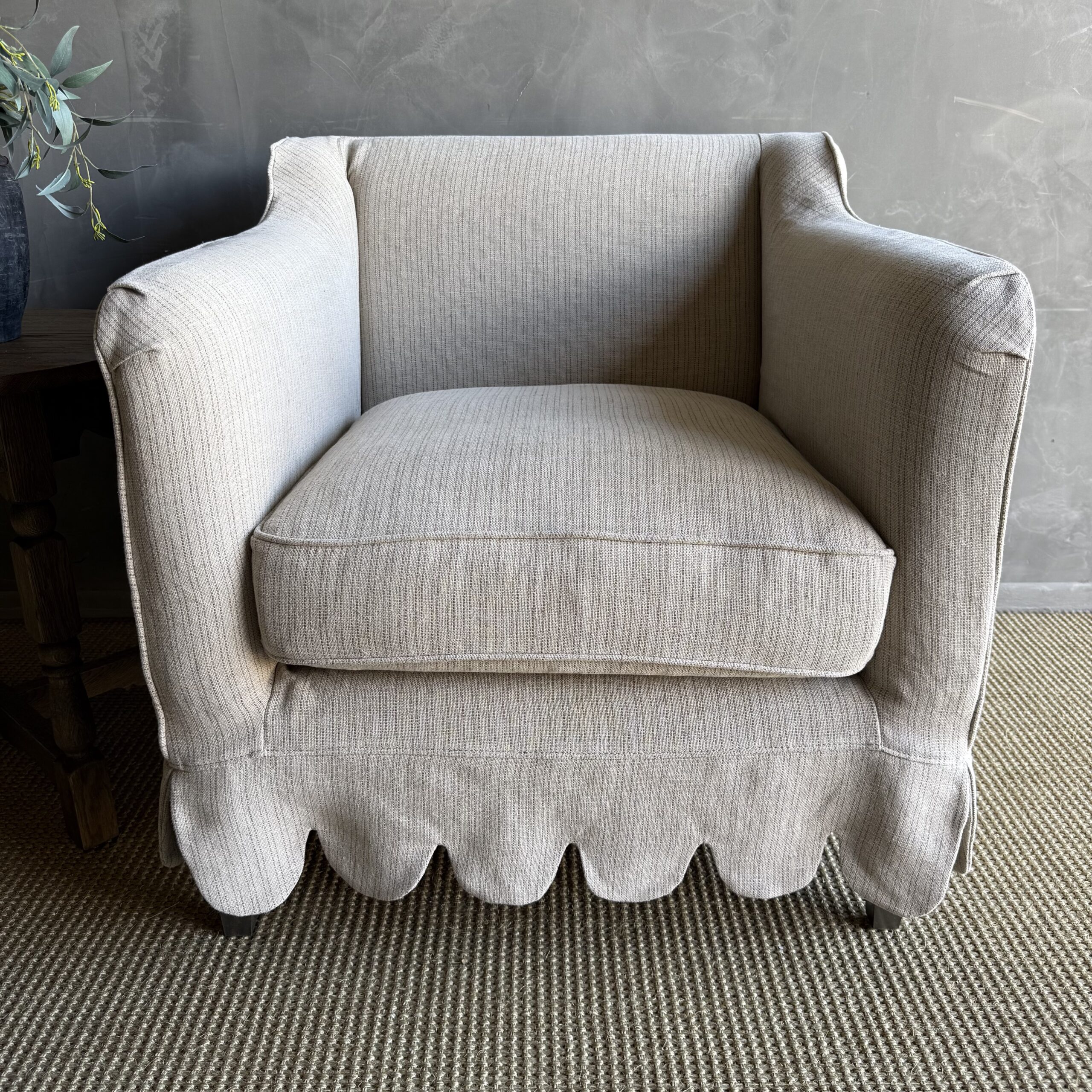 A softly tailored scalloped skirt adds a distinctive design detail, bringing a touch of charm and movement to the chair’s silhouette while maintaining a sophisticated, tailored finish. The seat is designed for exceptional comfort, featuring a down-wrapped foam core cushion that offers the perfect balance of support and softness.