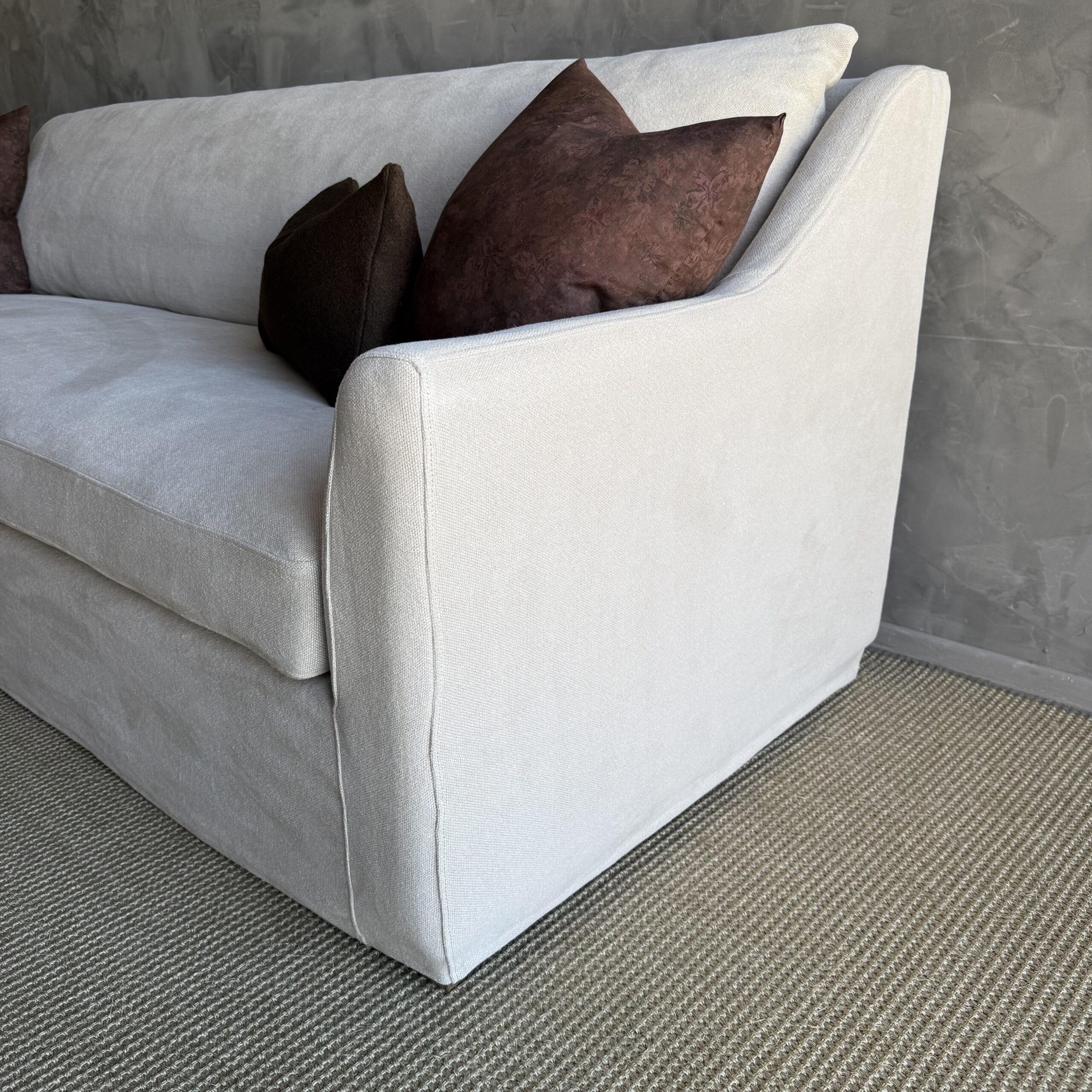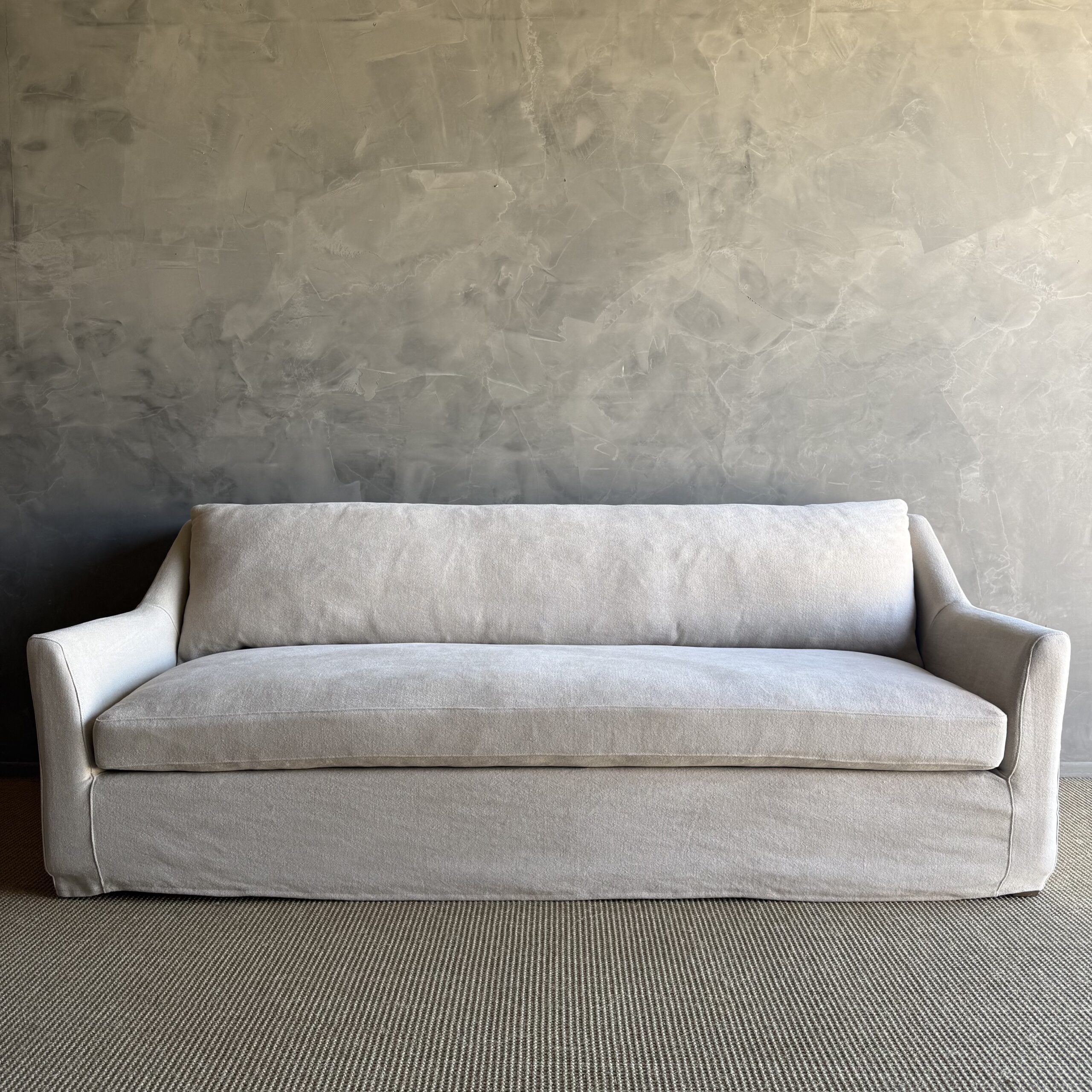 Introducing our slip-covered sofa in natural Flax 100% Hemp, with stone-washed for a relaxed, lived-in look. Sink into the plump down-wrapped seat cushion for ultimate comfort. This versatile sofa can be easily machine washed, though dry cleaning is recommended for longevity. The soothing oatmeal color, reminiscent of natural flax linen, adds warmth to any space. Supported by white oak legs, this sofa boasts a transitional style that effortlessly blends with various decor. Upgrade your living room with our stylish and practical slip-covered sofa, offering both comfort and easy maintenance for your convenience.