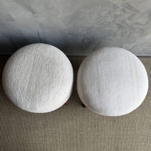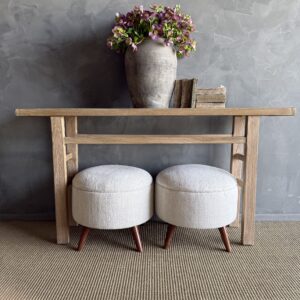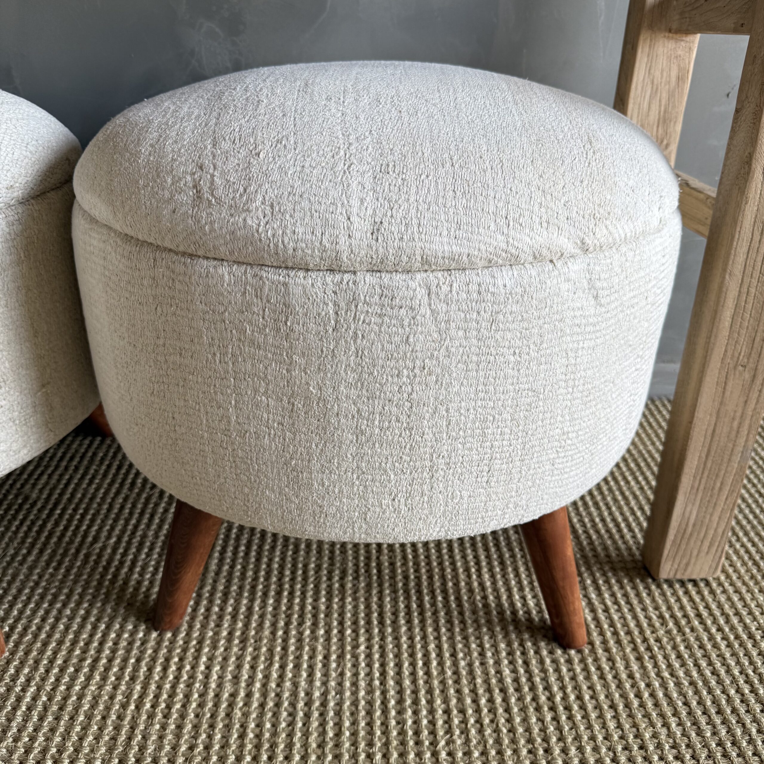 These vintage Turkish rug ottomans brings warmth, texture, and soul into your home. Made using an authentic, handwoven Turkish rug, no two are exactly alike. The beautifully worn fibers showcase subtle variations in color and pattern, paired with four solid wood legs for durability and balance. A charming accent for layered, lived-in interiors.