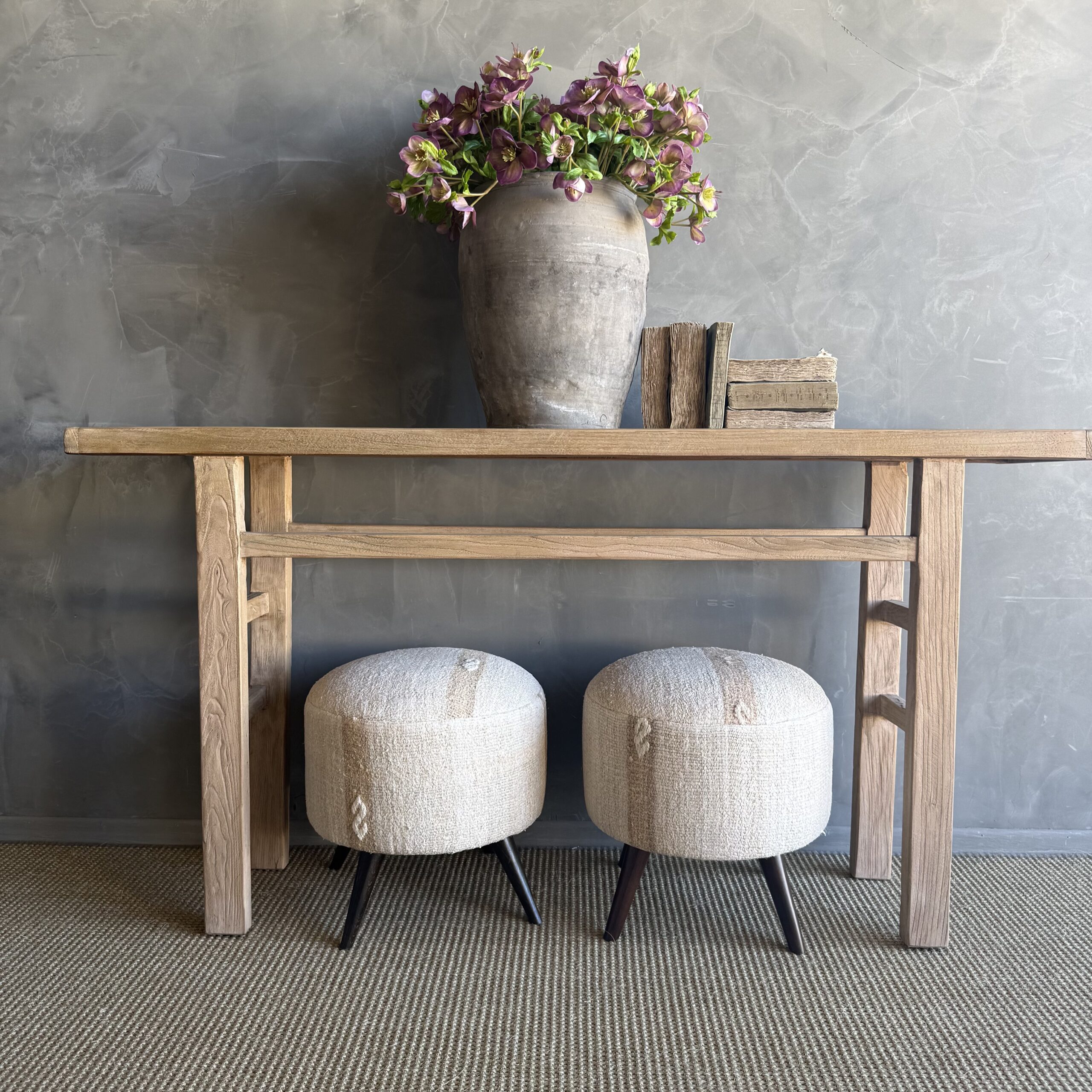 These vintage Turkish rug ottomans bring warmth, texture, and soul into your home. Made using an authentic, handwoven Turkish rug, no two are exactly alike. The beautifully worn fibers showcase subtle variations in color and pattern, paired with four solid wood legs for durability and balance. A charming accent for layered, lived-in interiors.