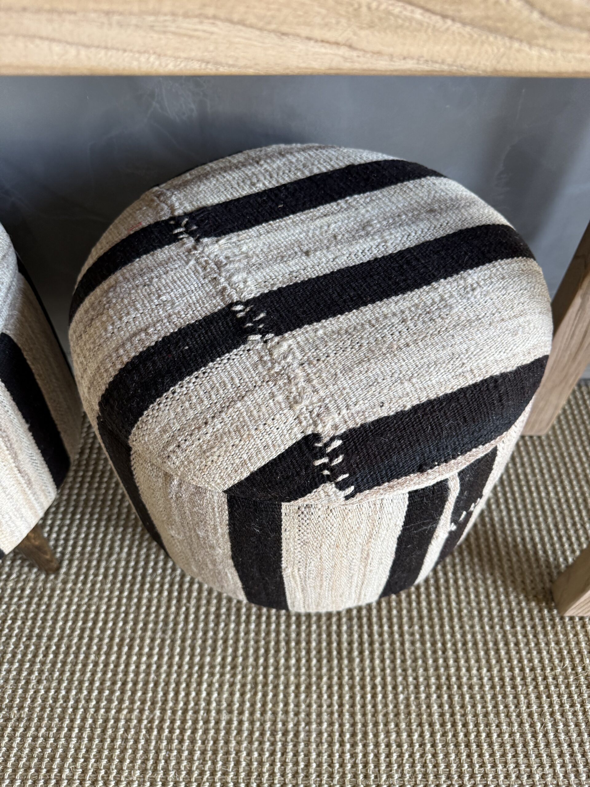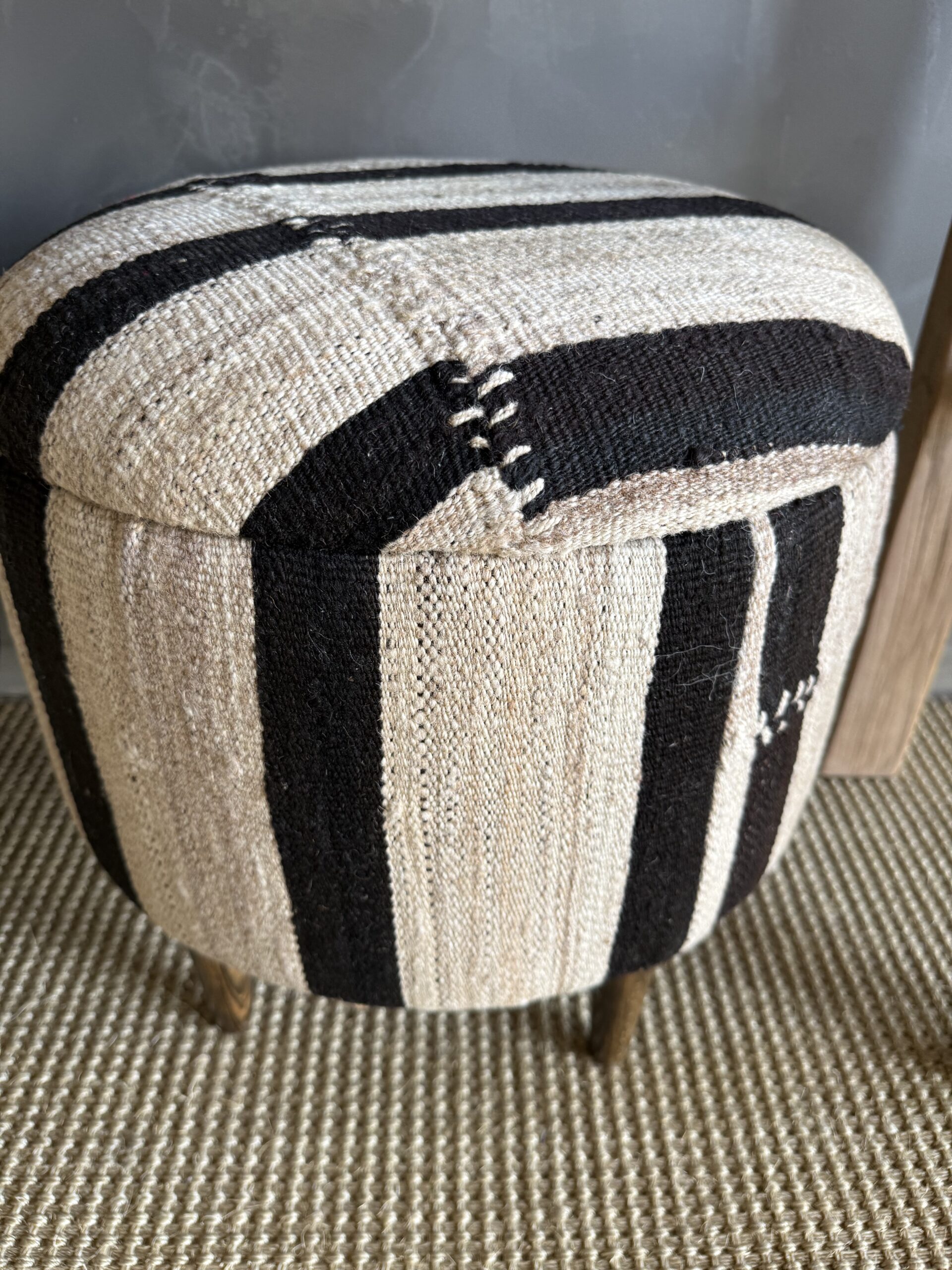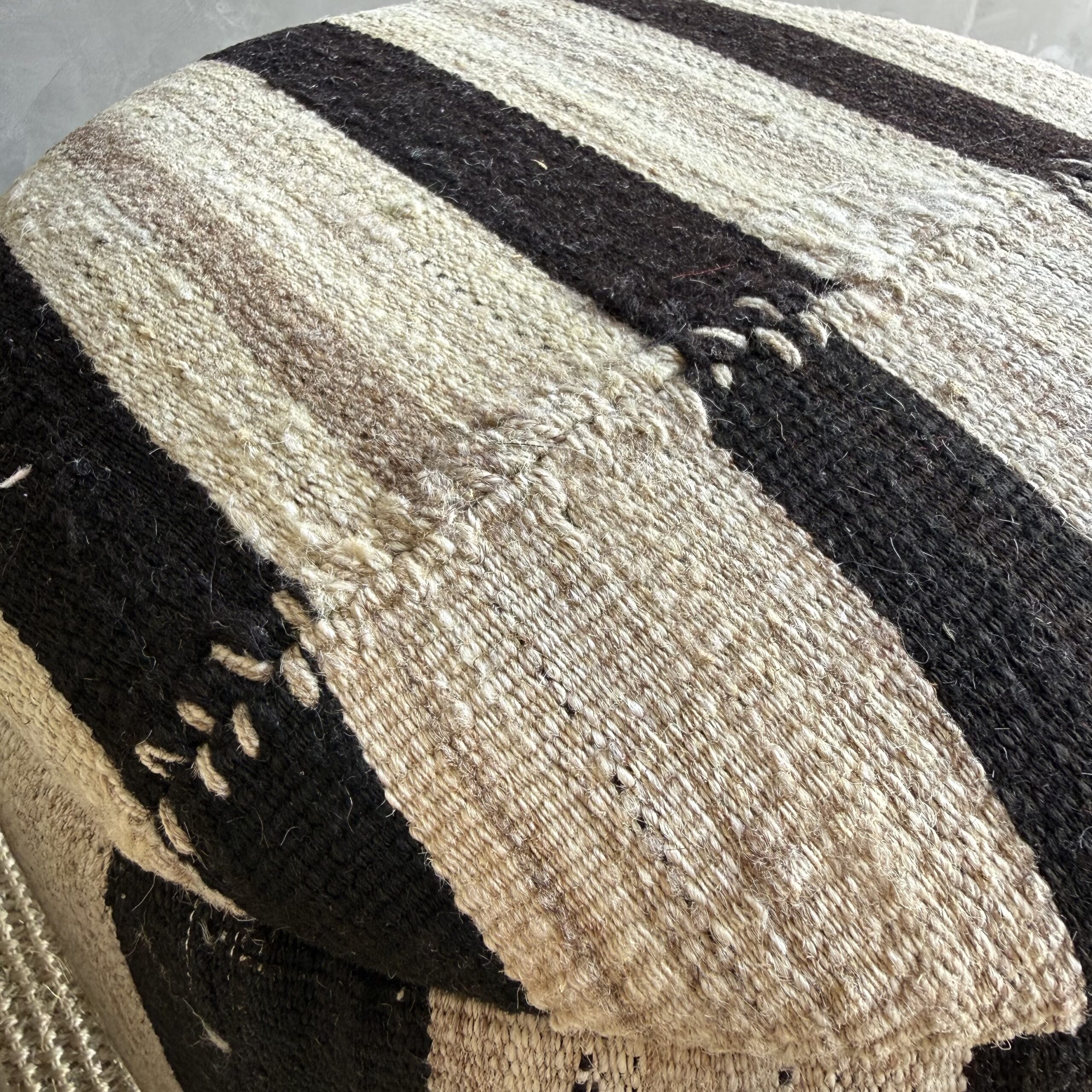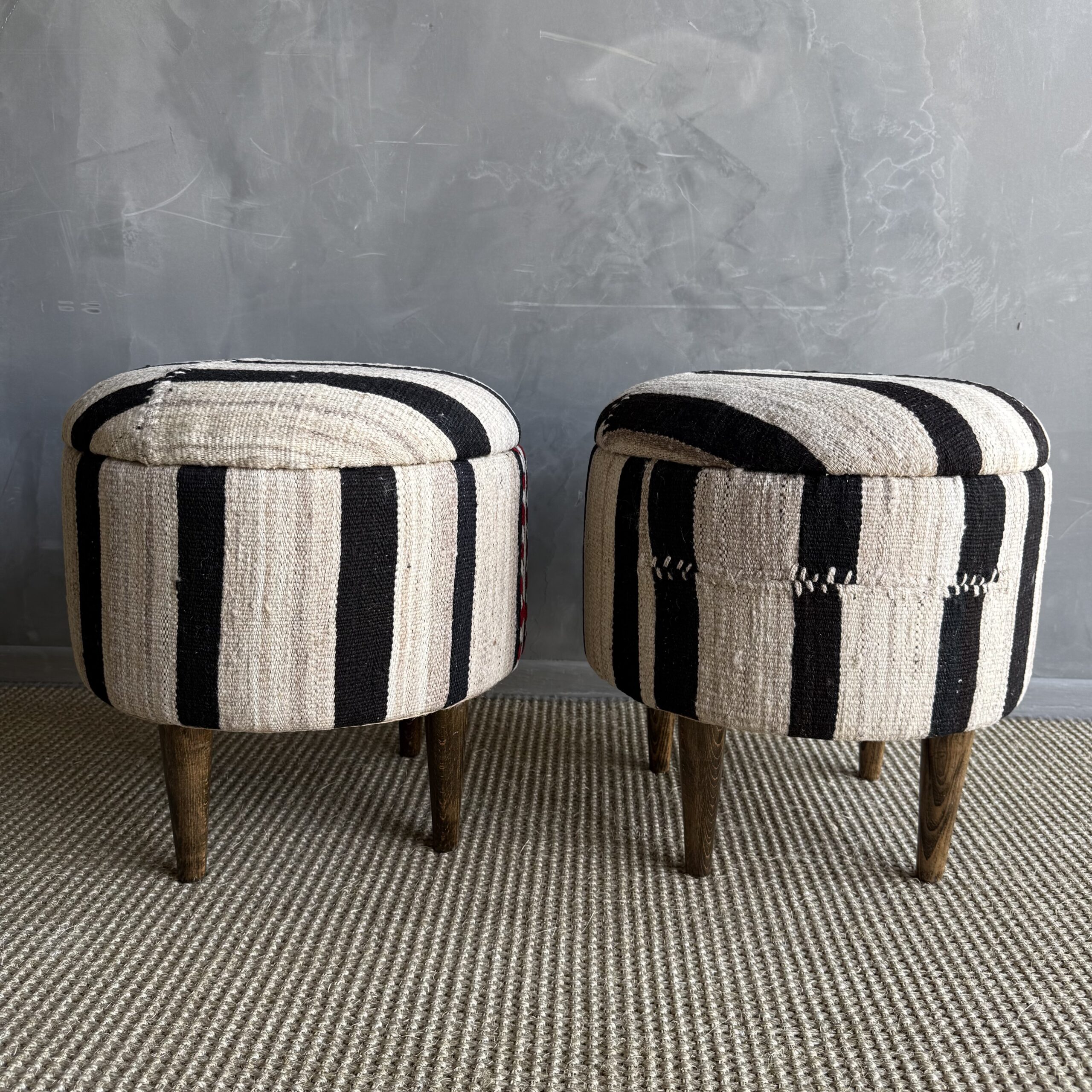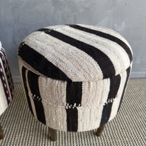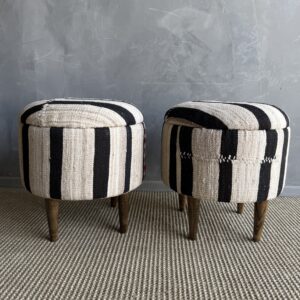 These vintage Turkish rug ottomans brings warmth, texture, and soul into your home. Made using an authentic, handwoven Turkish rug, no two are exactly alike. The beautifully worn fibers showcase subtle variations in color and pattern, paired with four solid wood legs for durability and balance. A charming accent for layered, lived-in interiors.