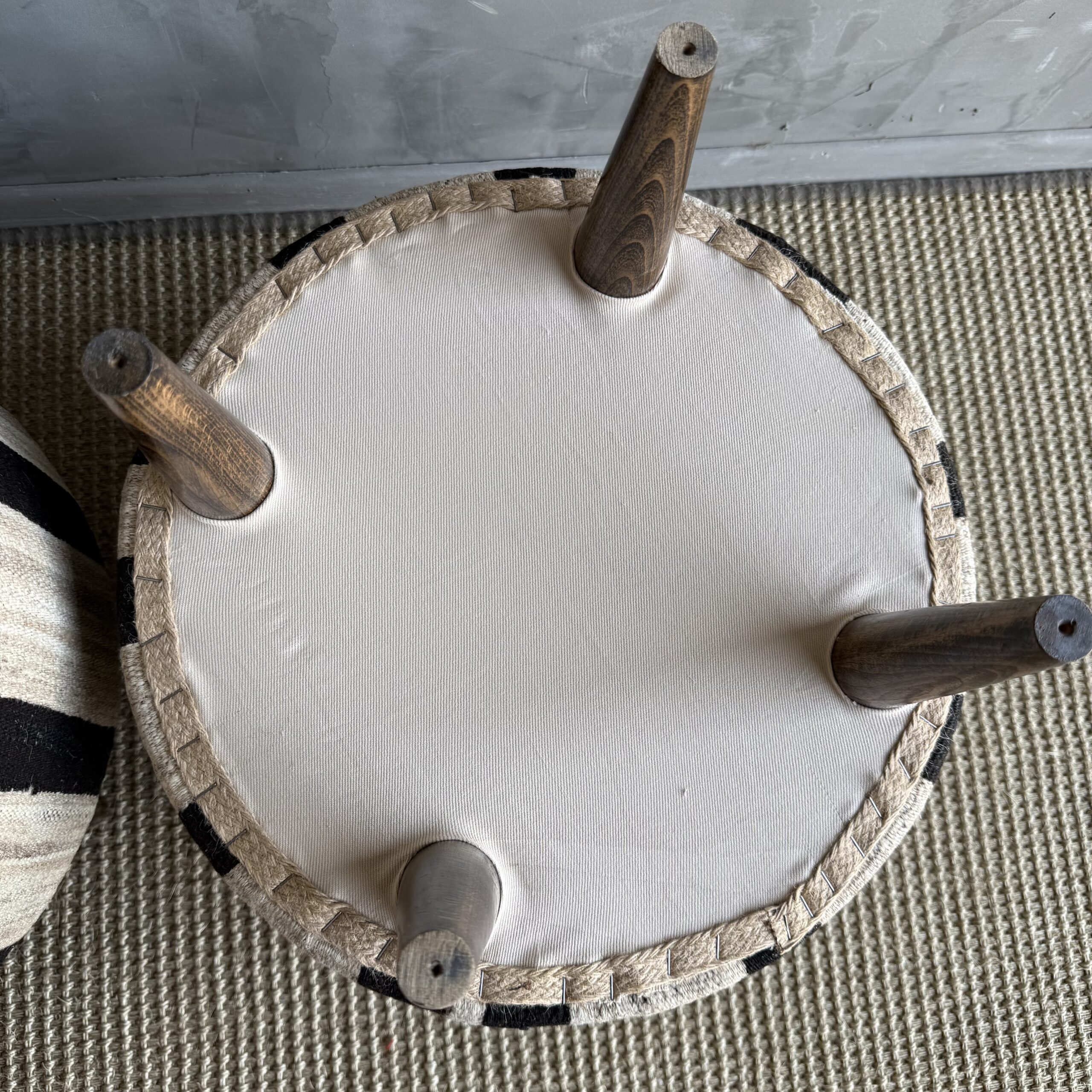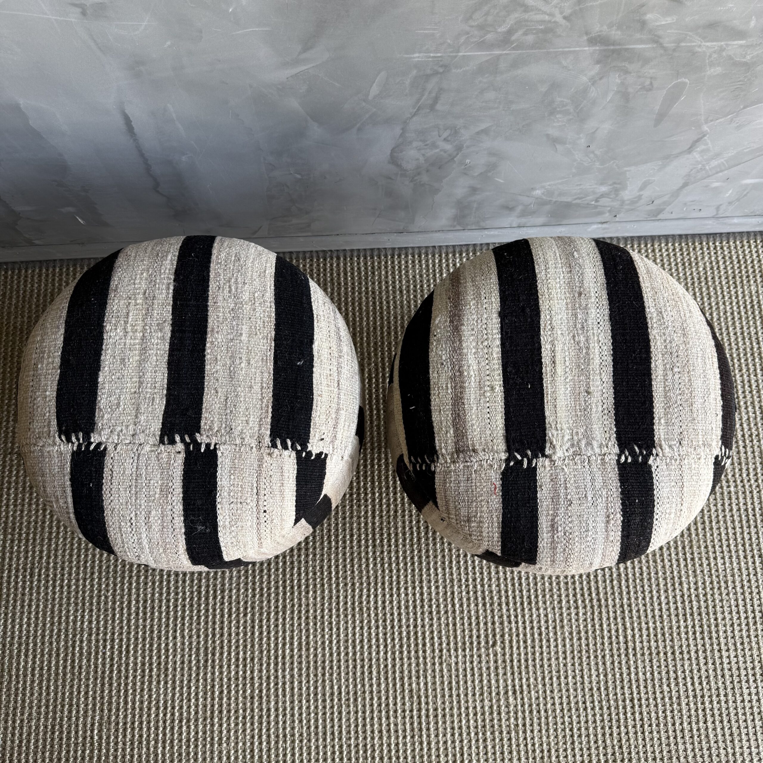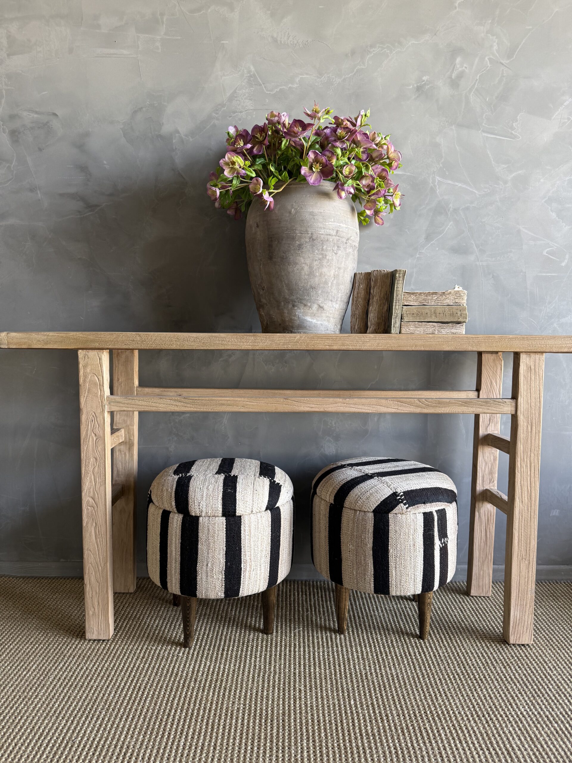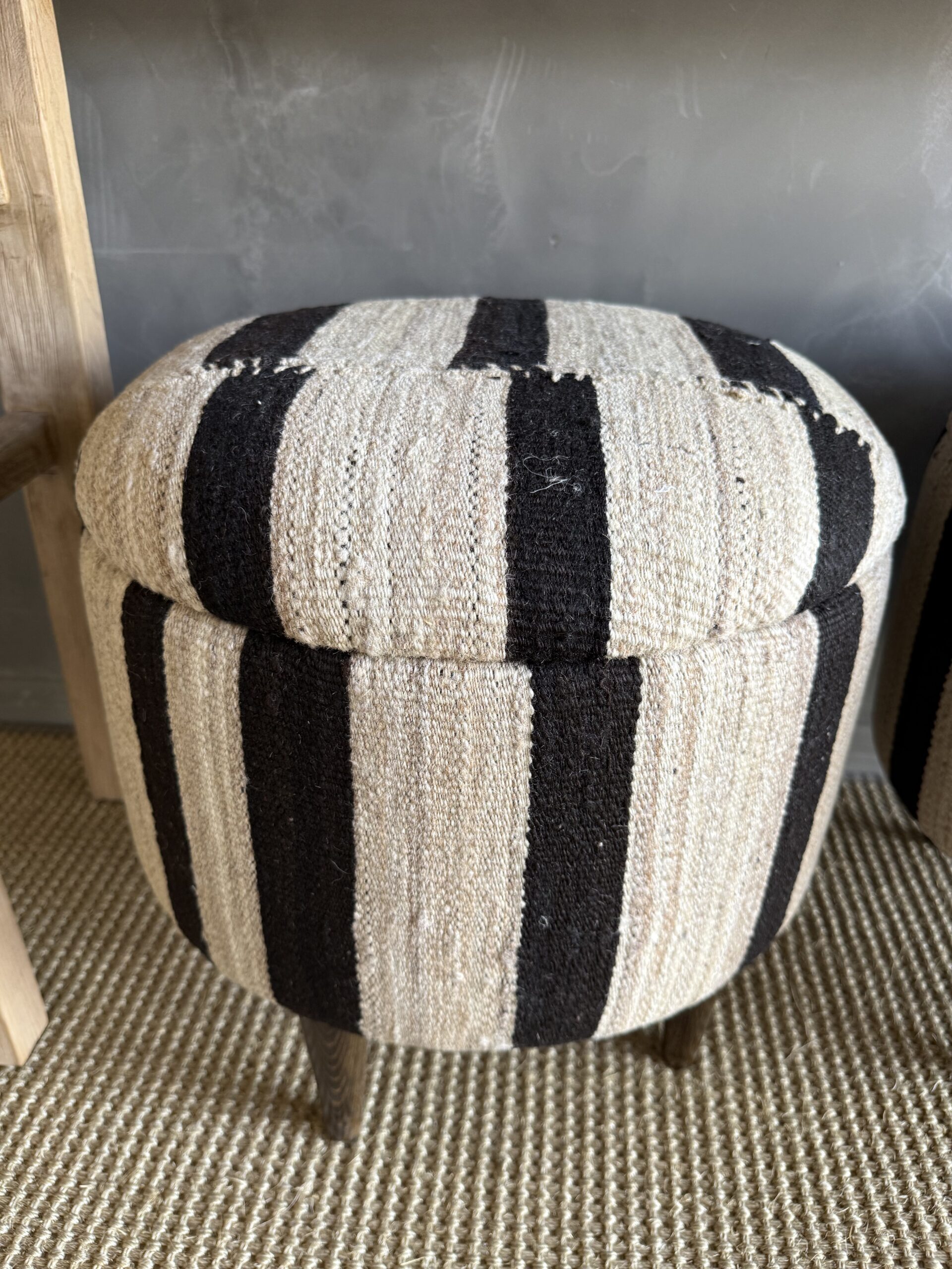 These vintage Turkish rug ottomans brings warmth, texture, and soul into your home. Made using an authentic, handwoven Turkish rug, no two are exactly alike. The beautifully worn fibers showcase subtle variations in color and pattern, paired with four solid wood legs for durability and balance. A charming accent for layered, lived-in interiors.