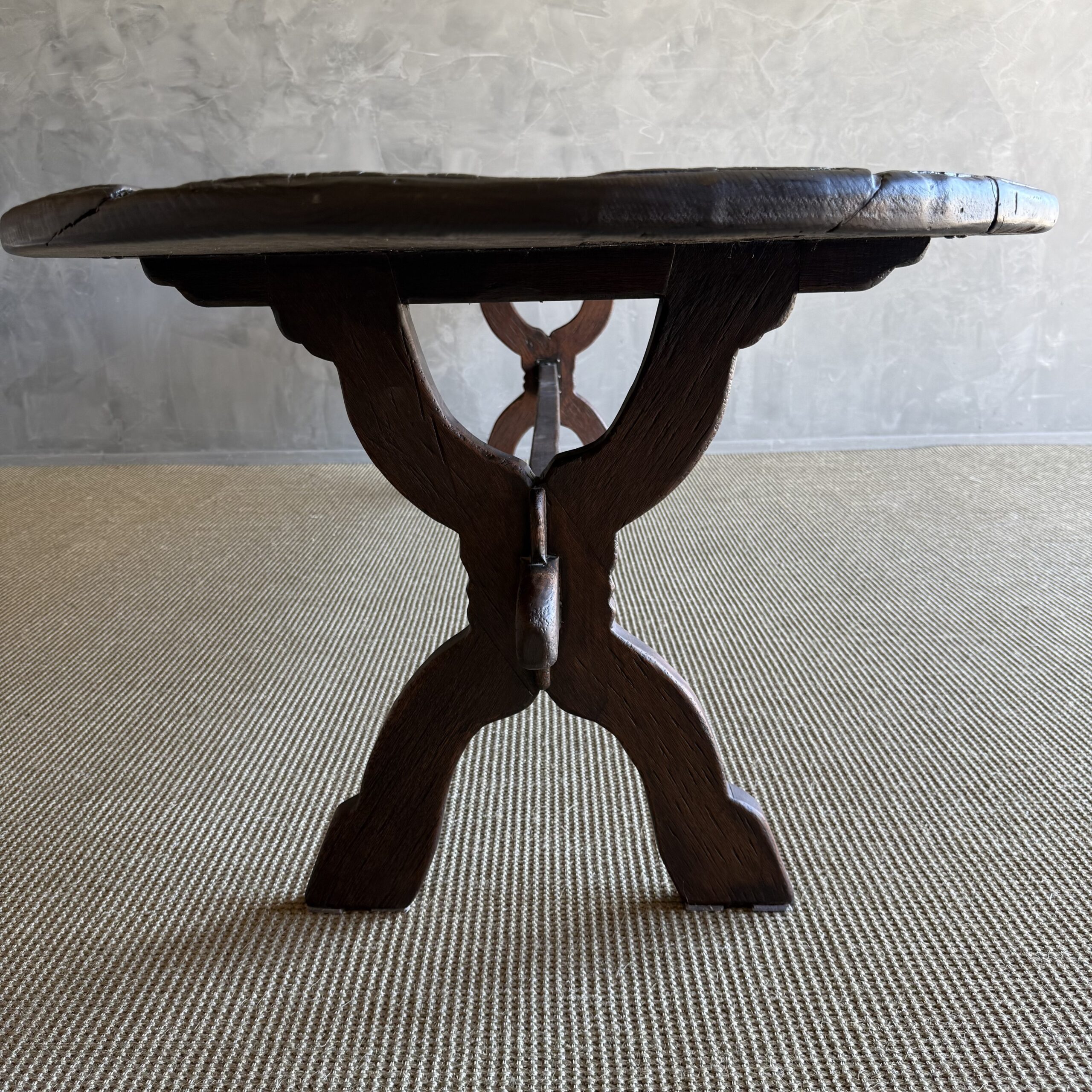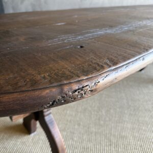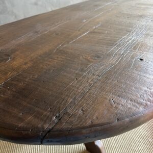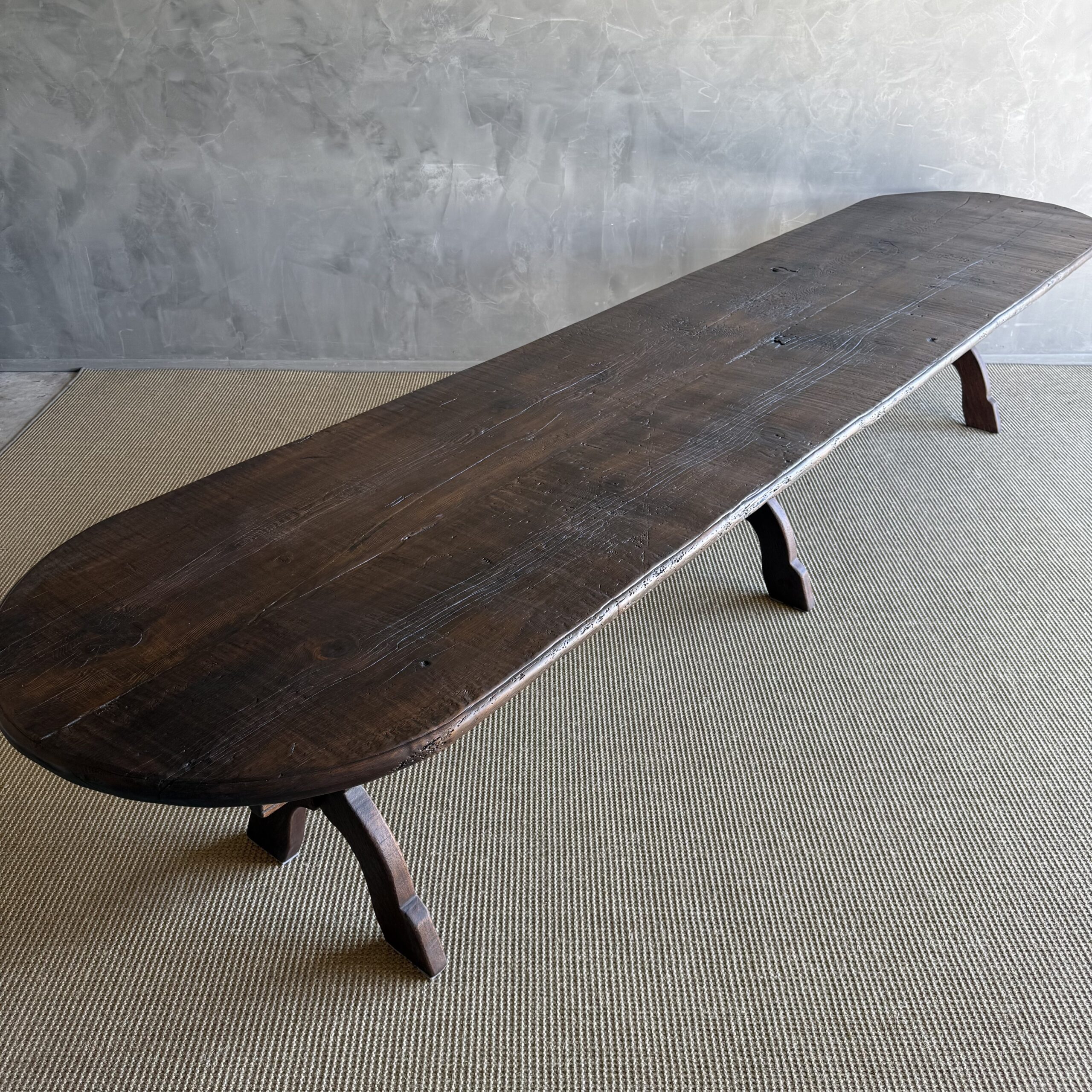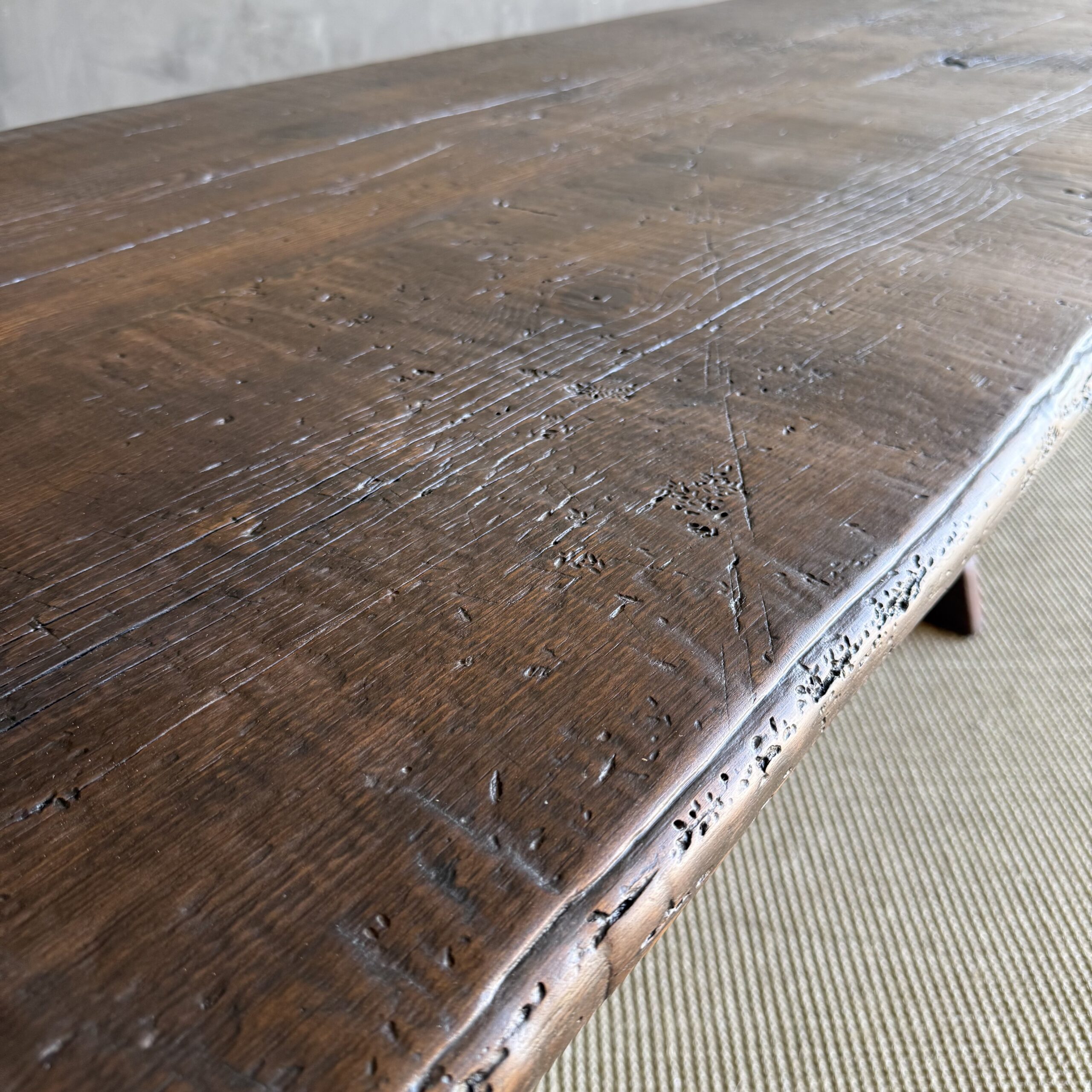 A commanding centerpiece handcrafted from sustainably reclaimed wood, this 13-foot dining table pairs monumental scale with refined craftsmanship. The deep dark-walnut finish enhances the wood’s natural character, bringing out rich, warm tones and a striking contrast in the grain. This table top features just 2 wide plank pieces of reclaimed fir wood, with beautiful patina & texture — knots, subtle weathering, and natural variation — giving the table a lived-in elegance that’s both rustic and sophisticated.