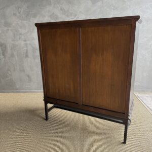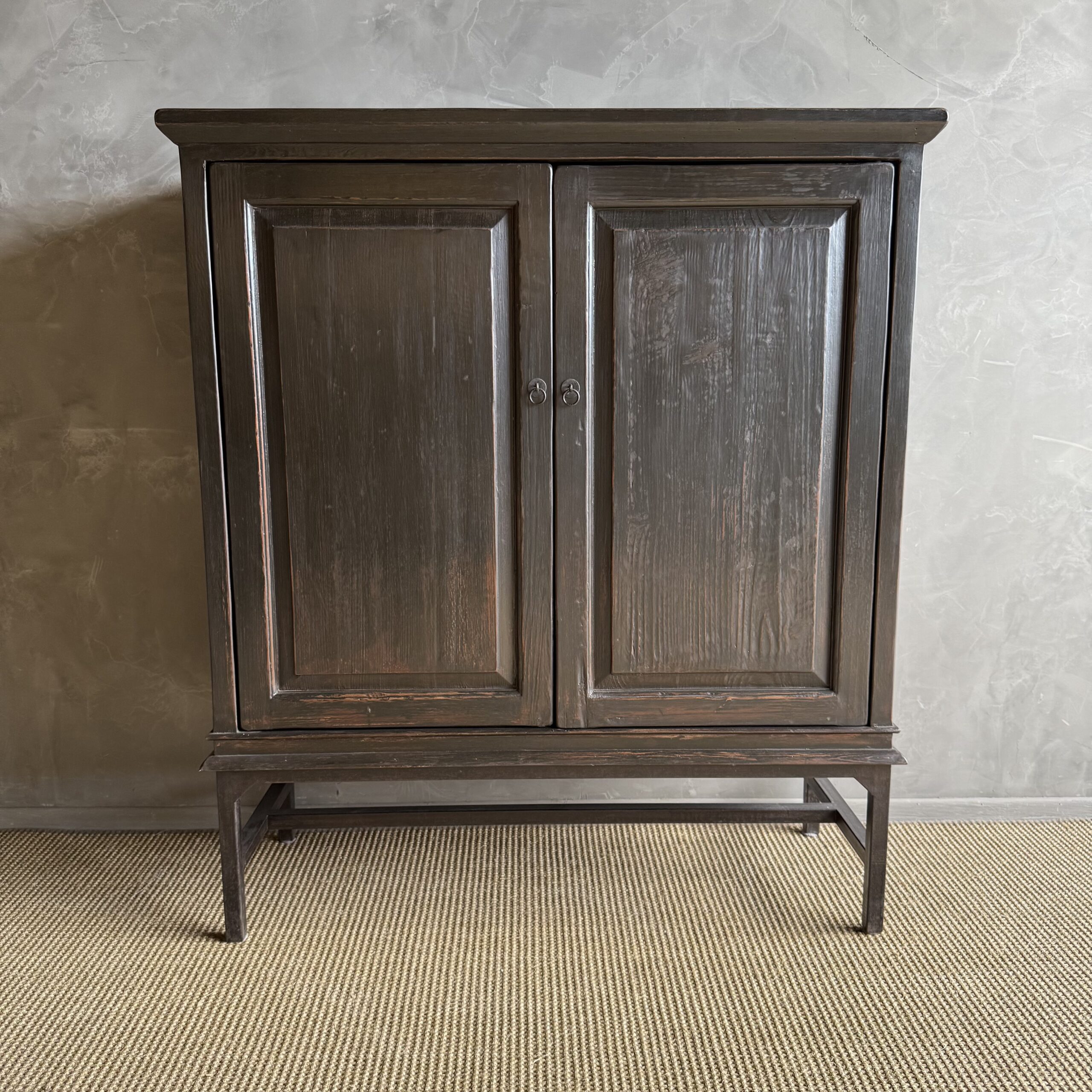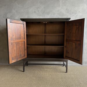 Reclaimed wood dry bar, cabinet with metal base. Very solid and heavy, doors open and close with ease.