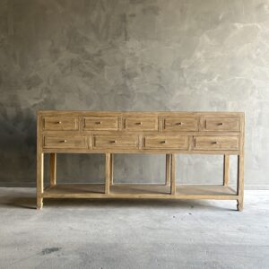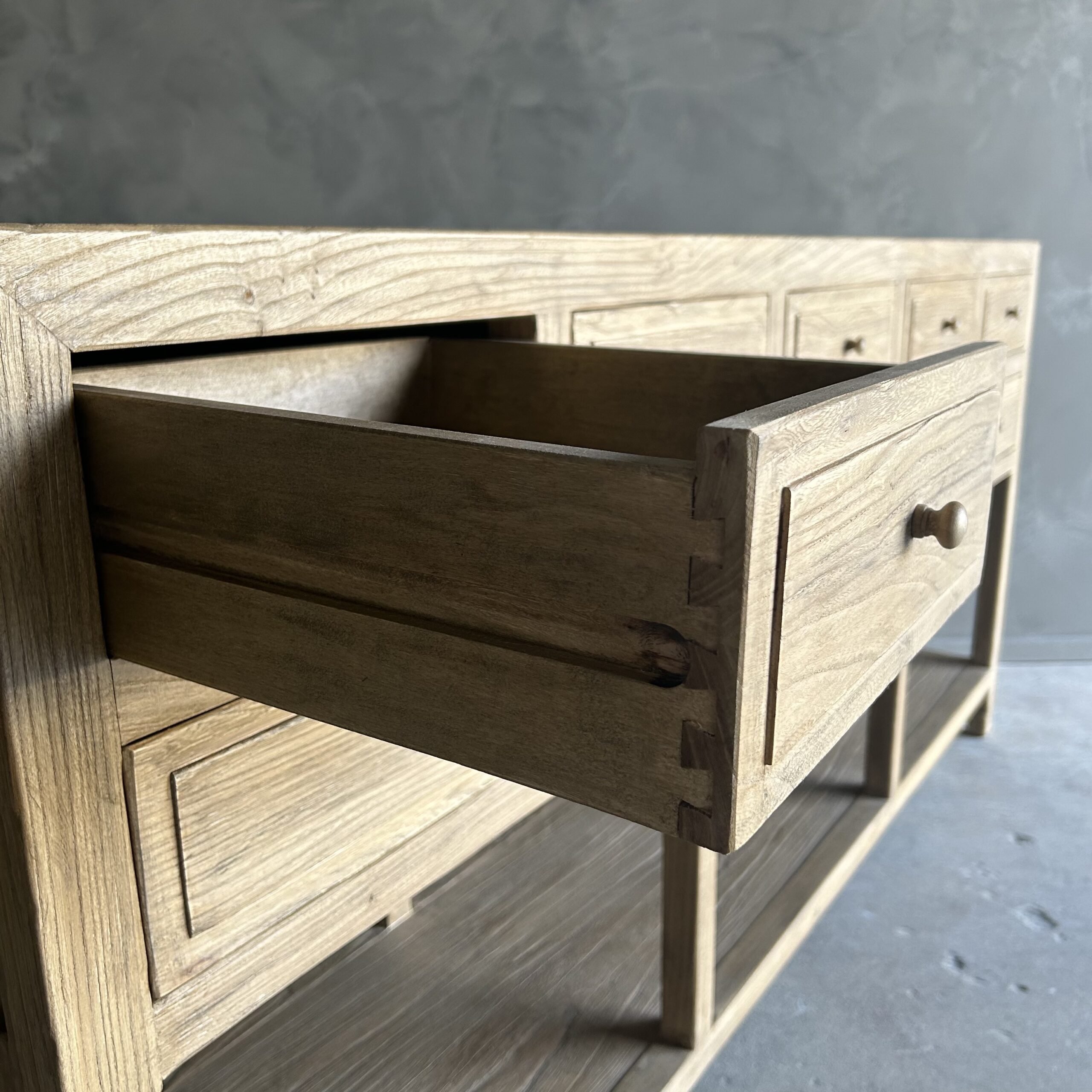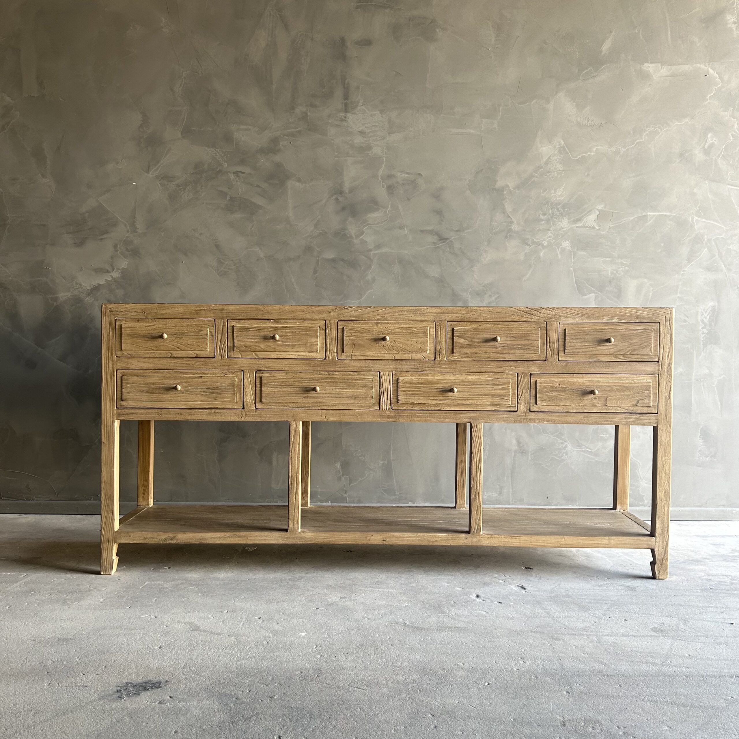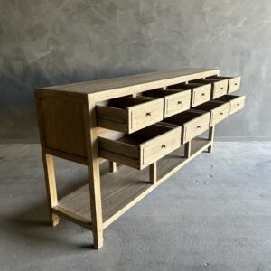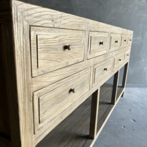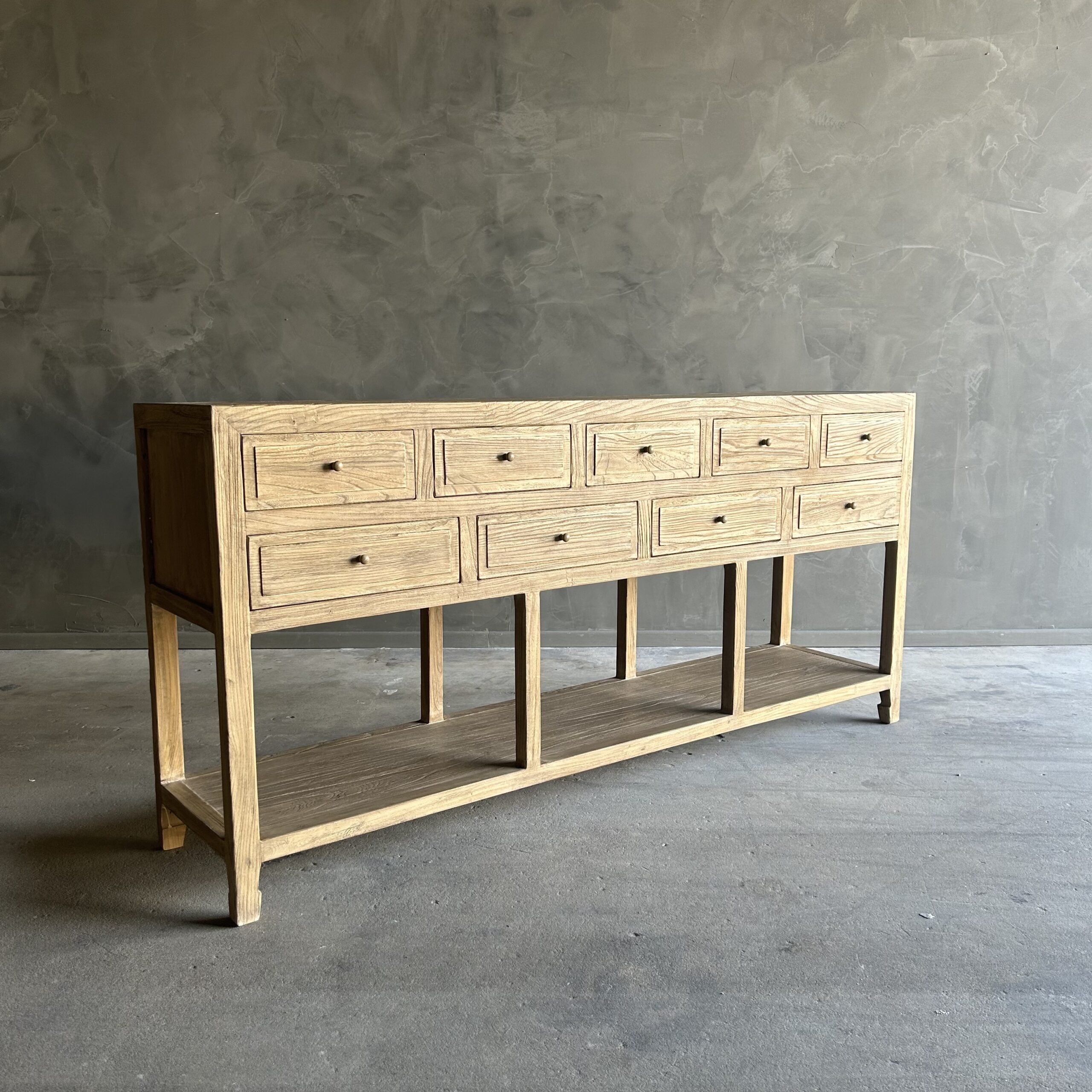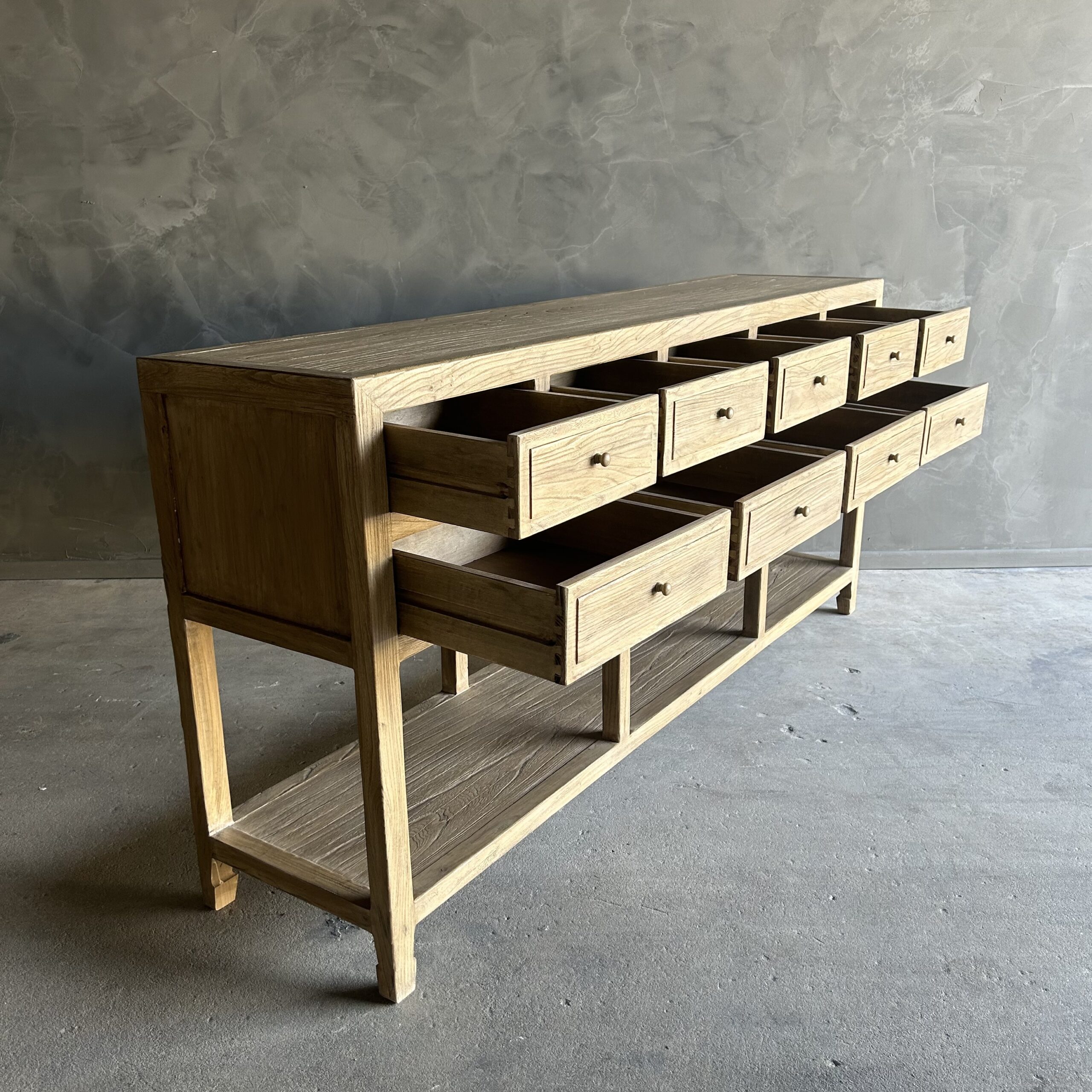Our custom made console is a perfect blend of style and functionality. Crafted with reclaimed wood in a natural finish, this console will add a timeless look to any space. With its abundance of drawers, it serves as an excellent entry piece or server, providing storage for all your essentials. All drawers feature dovetail construction, and open and close with ease.