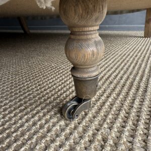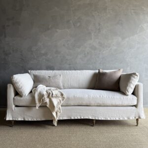 Stone Washed Linen A heavy 18 oz weighted linen, in a neutral greige linen. Our linen is stone washed to give a soft hand and relaxed look. The seat is a down / feather wrapped foam, in medium firm density. There is a zipper to remove the cover if needed. The legs are solid oak, finished in our weathered brown and antique brass colored casters.