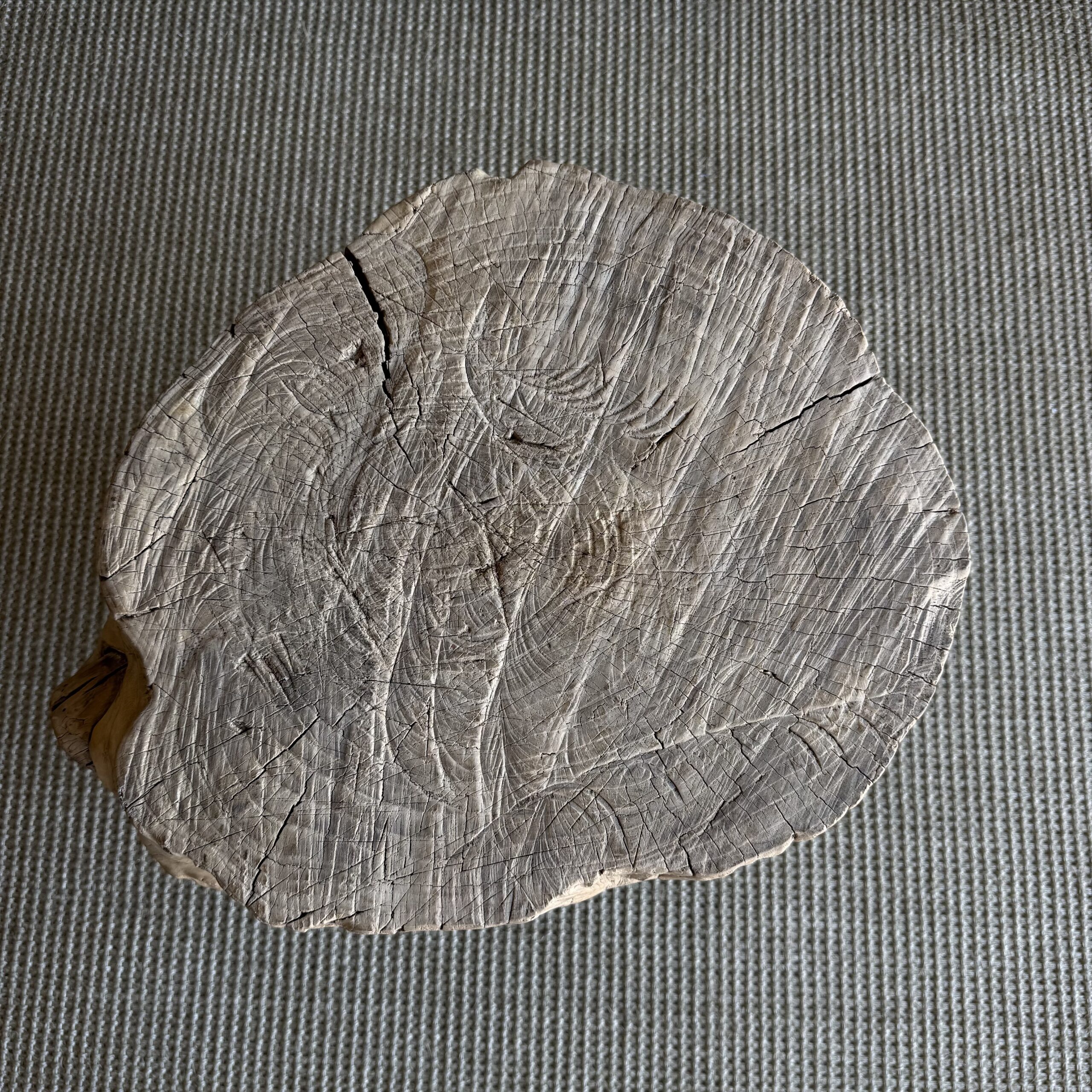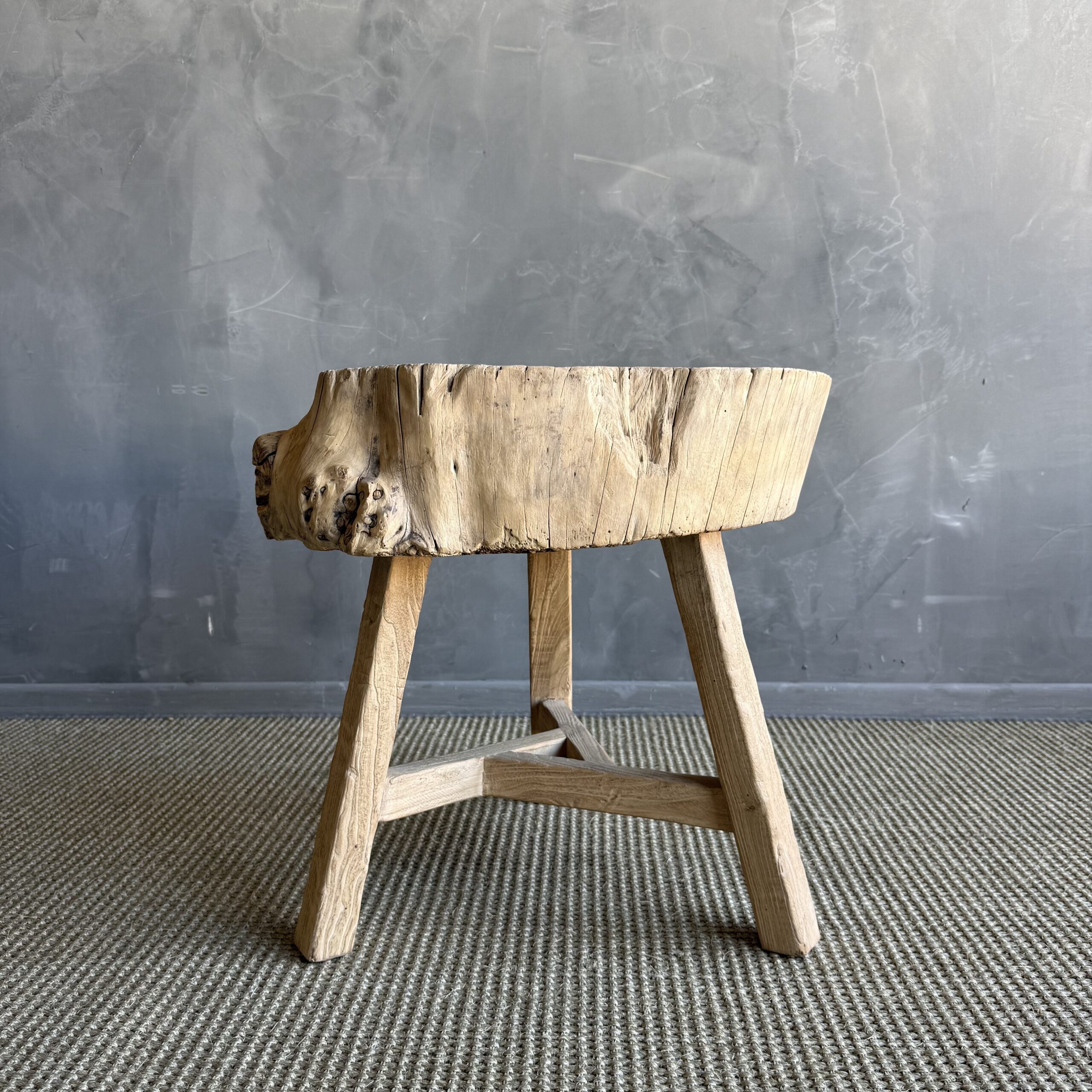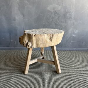 This solid stump slice was turned into a side table or stool. The solid thick top has a beautiful movement with unique characteristics. A natural live edge to show shape and form of what was. Solid and sturdy, perfect earthy organic piece to add to your home.