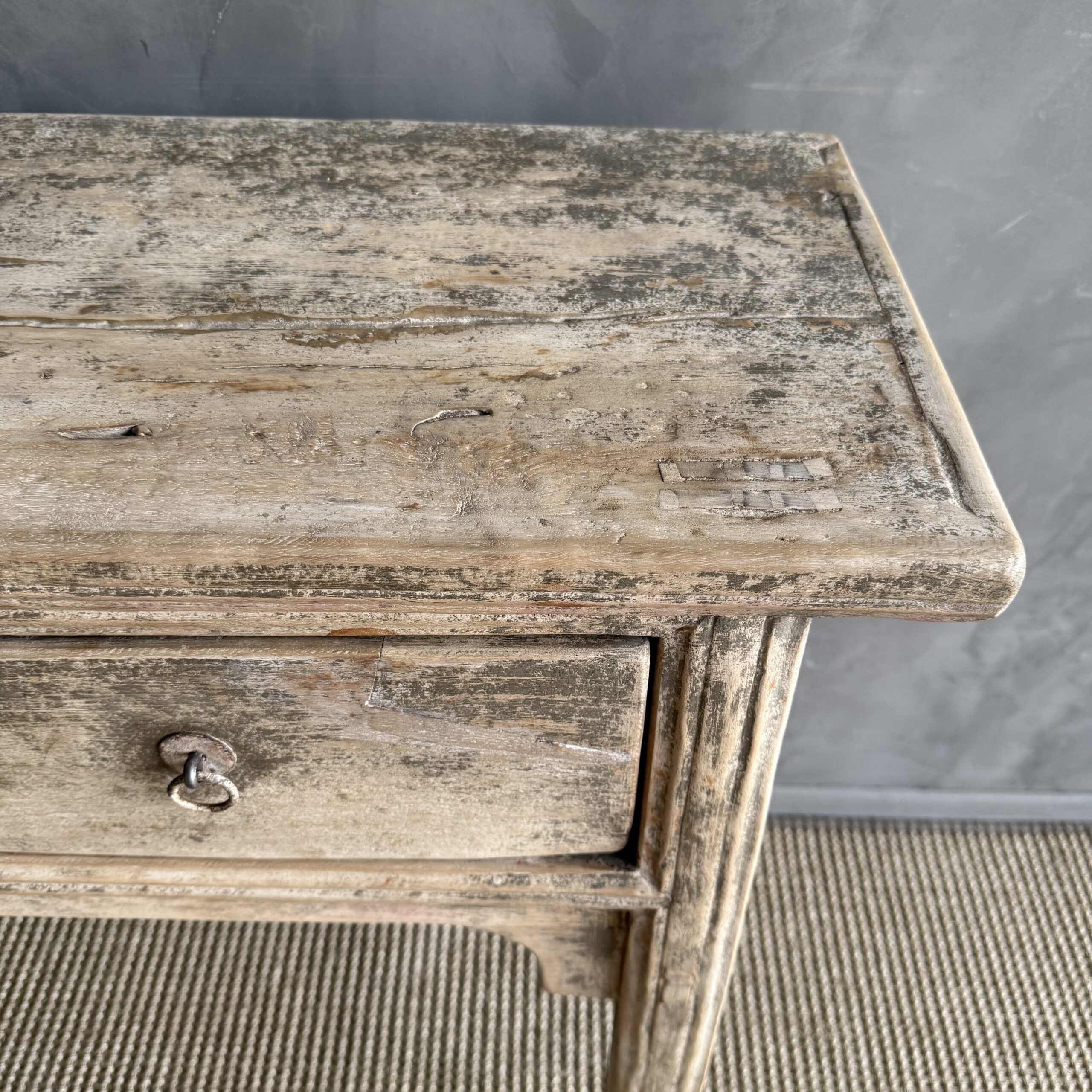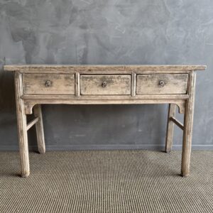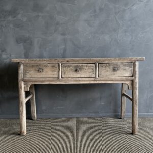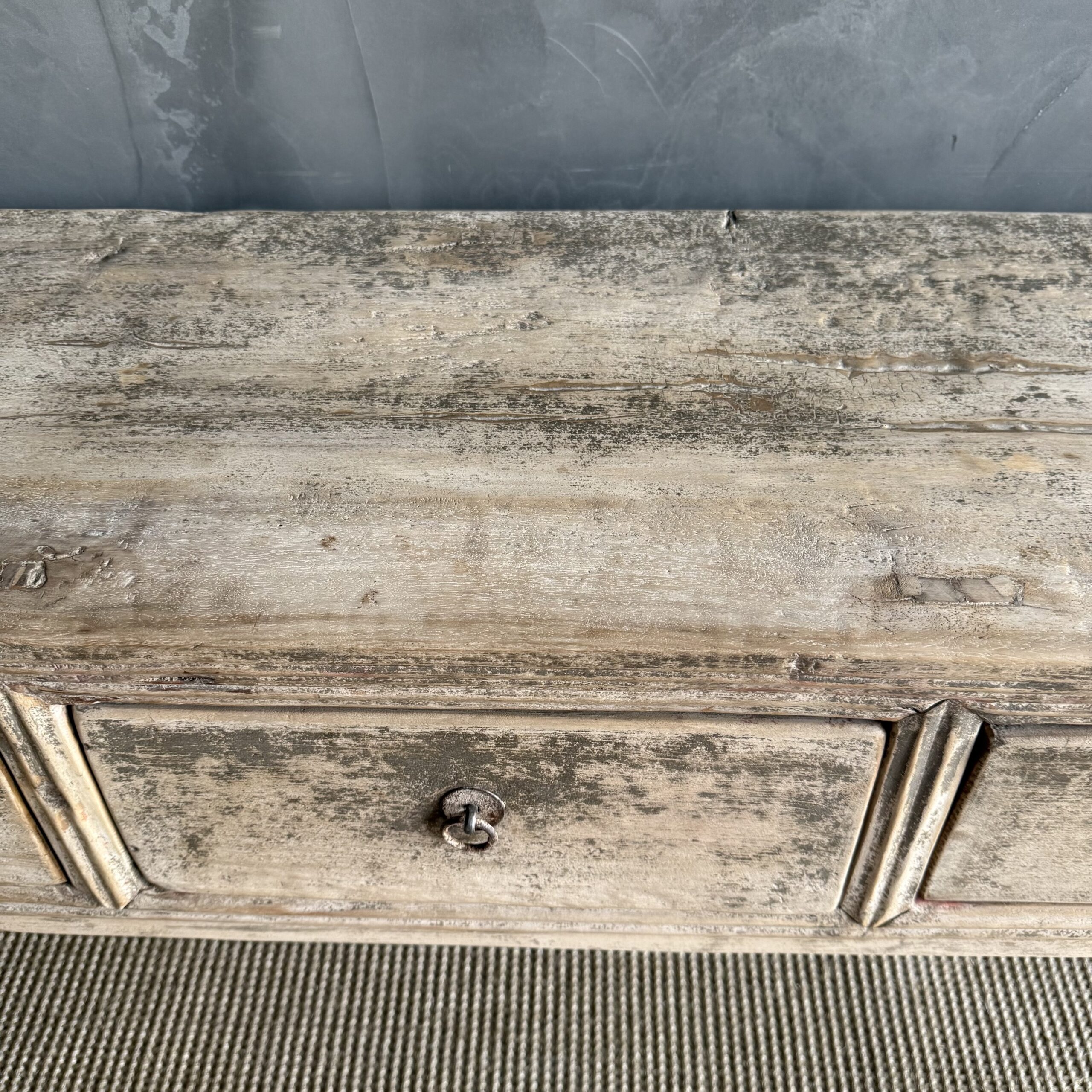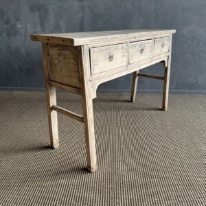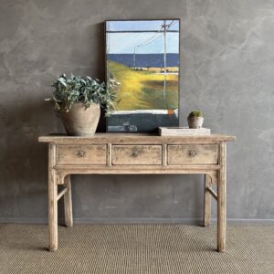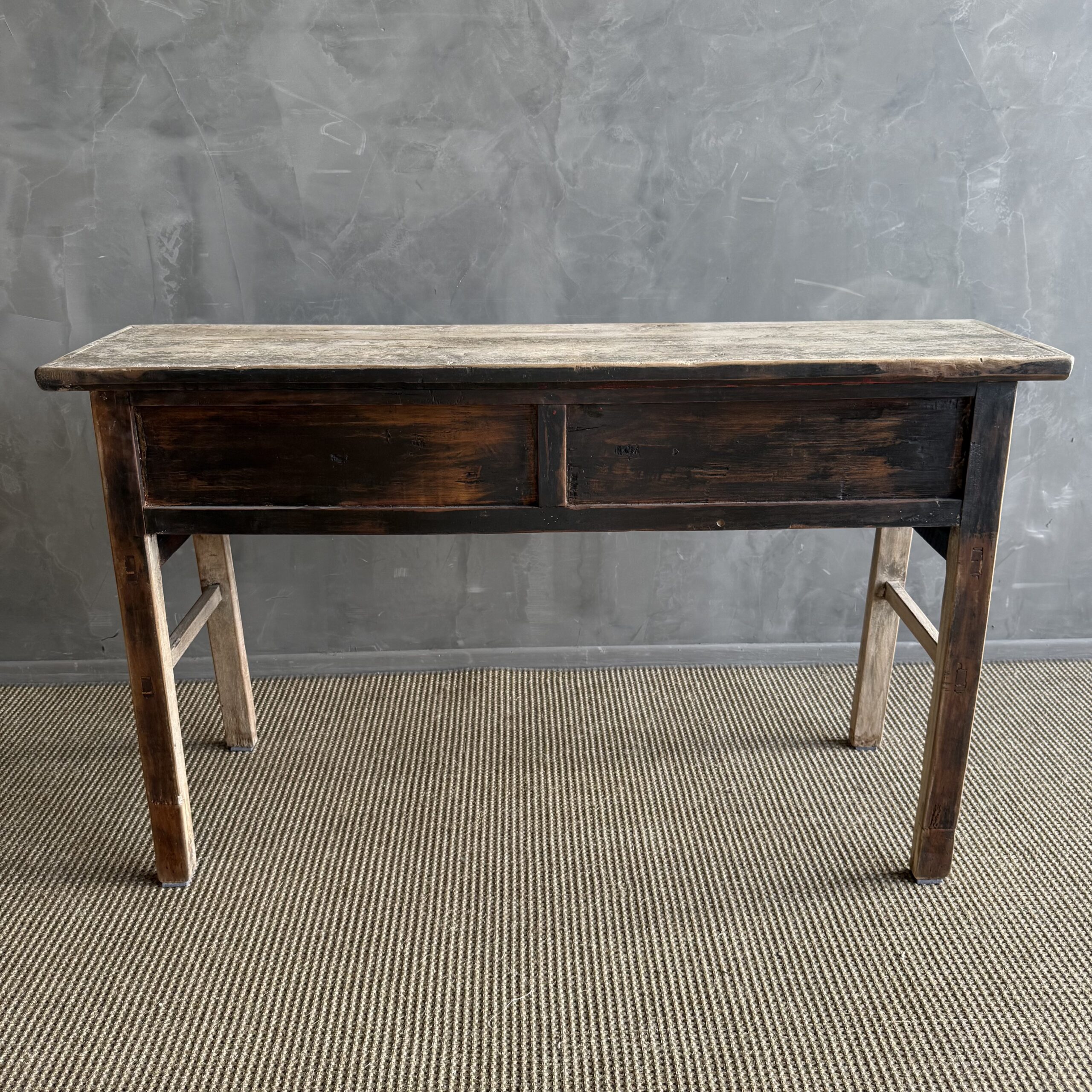 This charming vintage elm wood console is a one-of-a-kind piece with beautiful age and patina that adds character to any space. Its patina painted elm wood finish showcases the natural beauty of the wood, while the solid elm wood original hardware gives it a rustic charm. This unique console is perfect for a mountain, lake house, coastal or bringing a touch of nature indoors. With its timeless design and exceptional craftsmanship, this vintage elm wood console is sure to be a conversation starter and a focal point in your home.