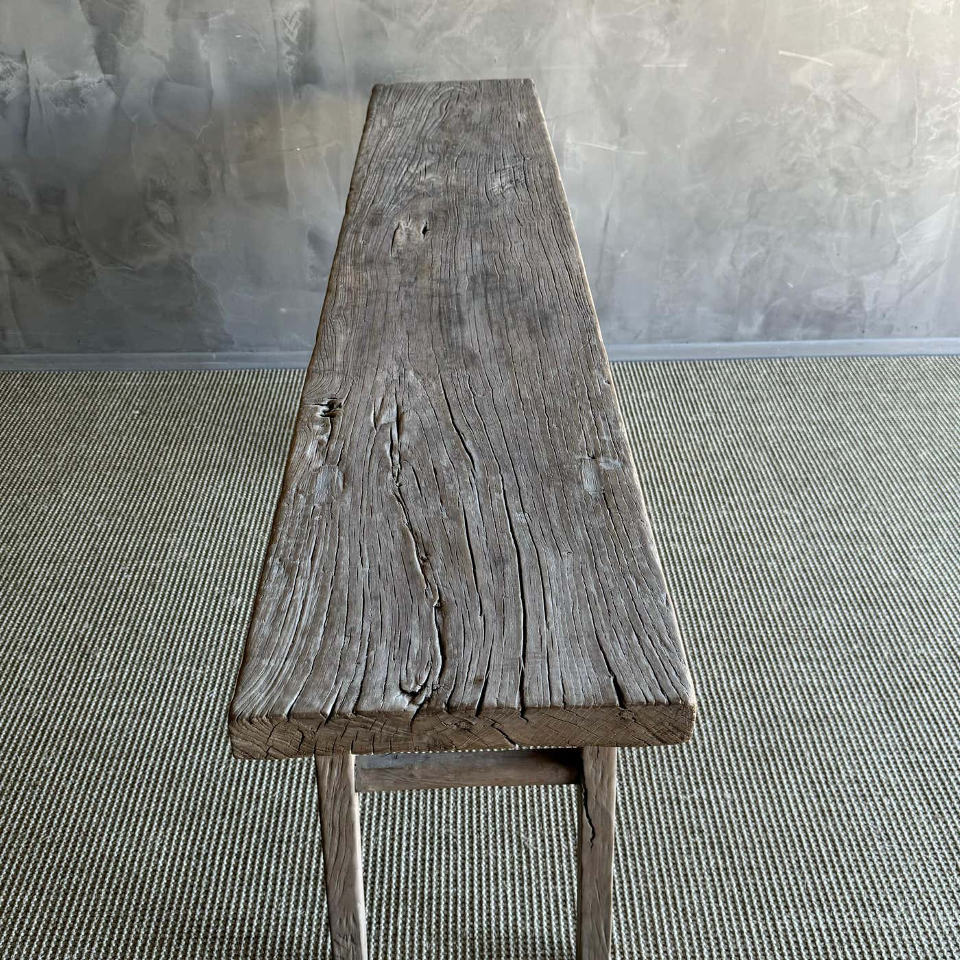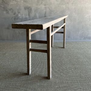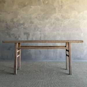 vintage elm wood console table. Crafted from authentic elm wood, this console table boasts a beautiful original natural wood patina that adds character and charm to any room. Embracing the wabi-sabi aesthetic, this piece brings a sense of imperfection and simplicity that enhances the uniqueness of your home decor. Whether placed in the entryway, living room, or hallway, this vintage elm wood console table is a versatile and stylish addition that exudes a sense of history and warmth. Elevate your home with this statement piece that brings an effortless blend of rustic elegance and natural beauty.