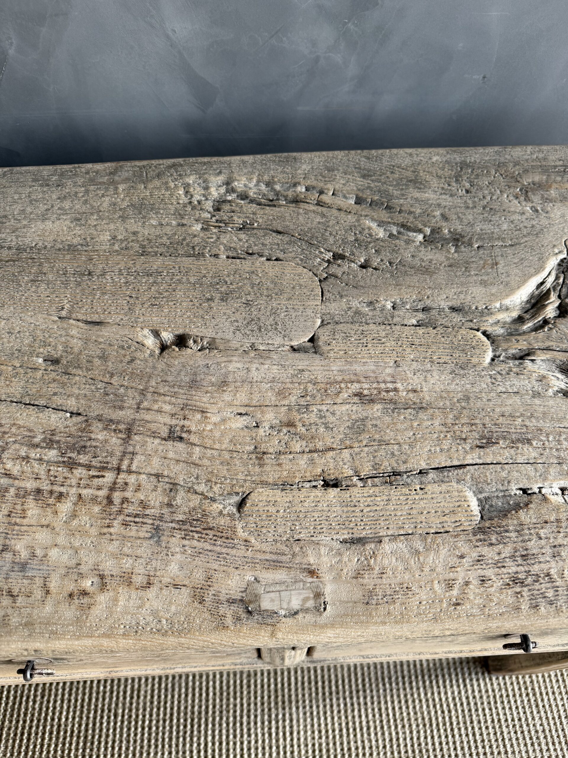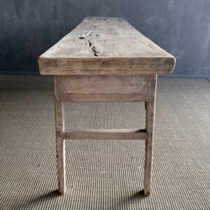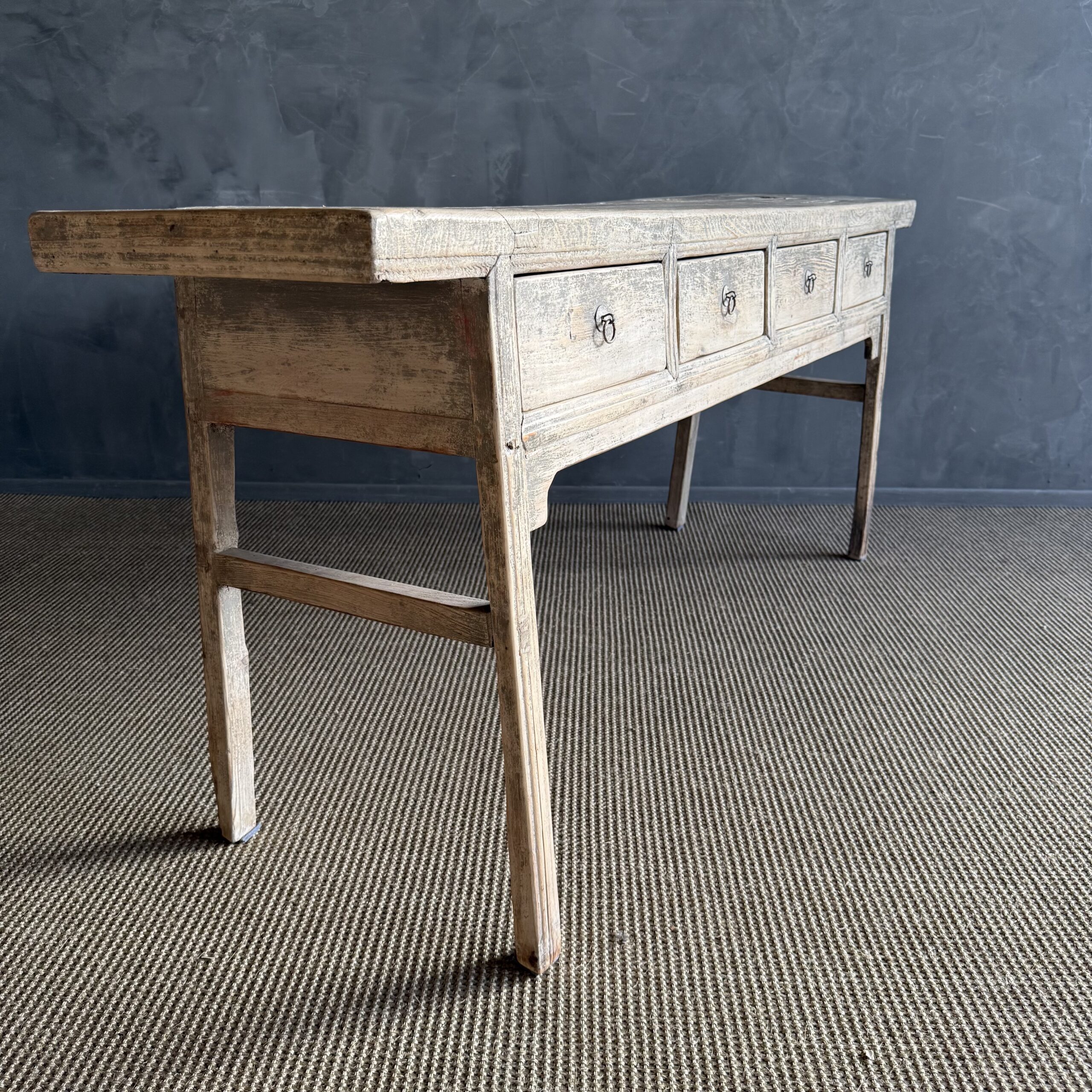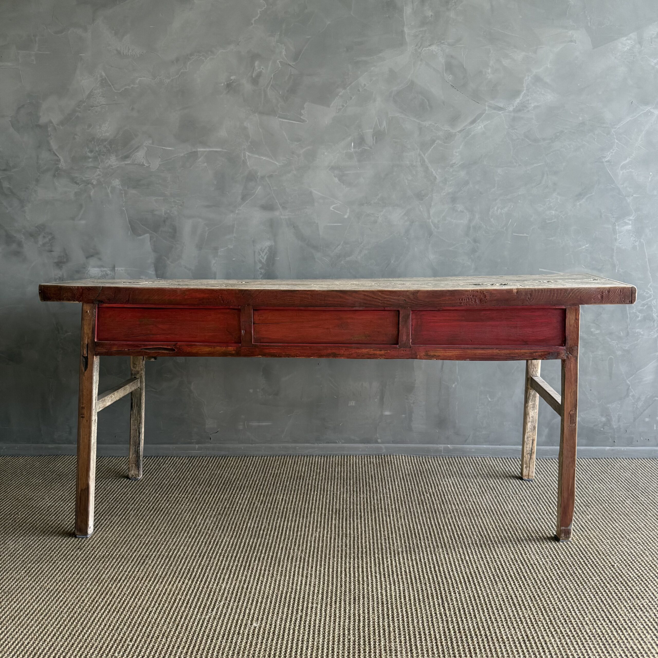 This charming vintage elm wood console is a one-of-a-kind piece with beautiful age and patina that adds character to any space. Its patina painted elm wood finish showcases the natural beauty of the wood, while the solid elm wood original hardware gives it a rustic charm. This unique console is perfect for a mountain, lake house, coastal or bringing a touch of nature indoors. With its timeless design and exceptional craftsmanship, this vintage elm wood console is sure to be a conversation starter and a focal point in your home.