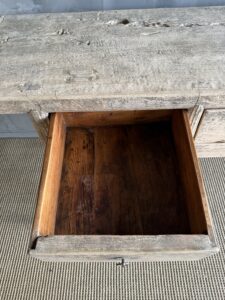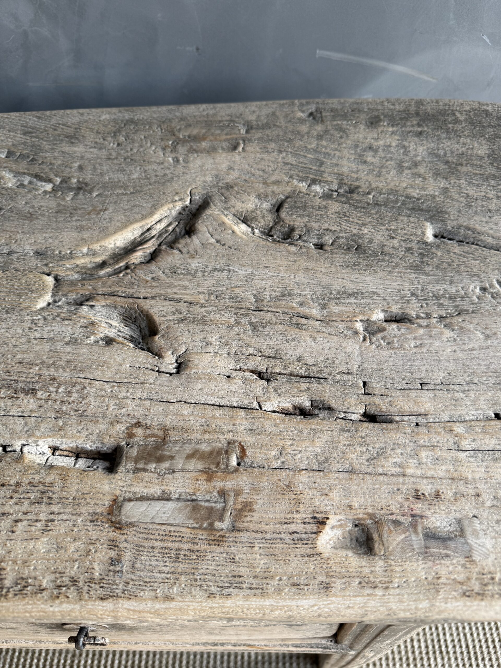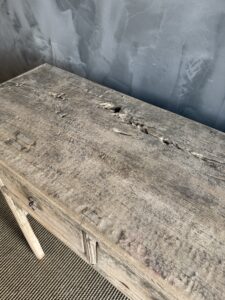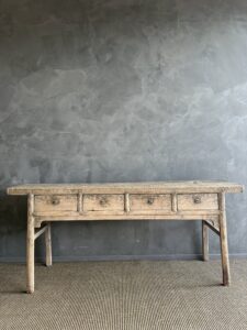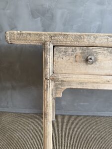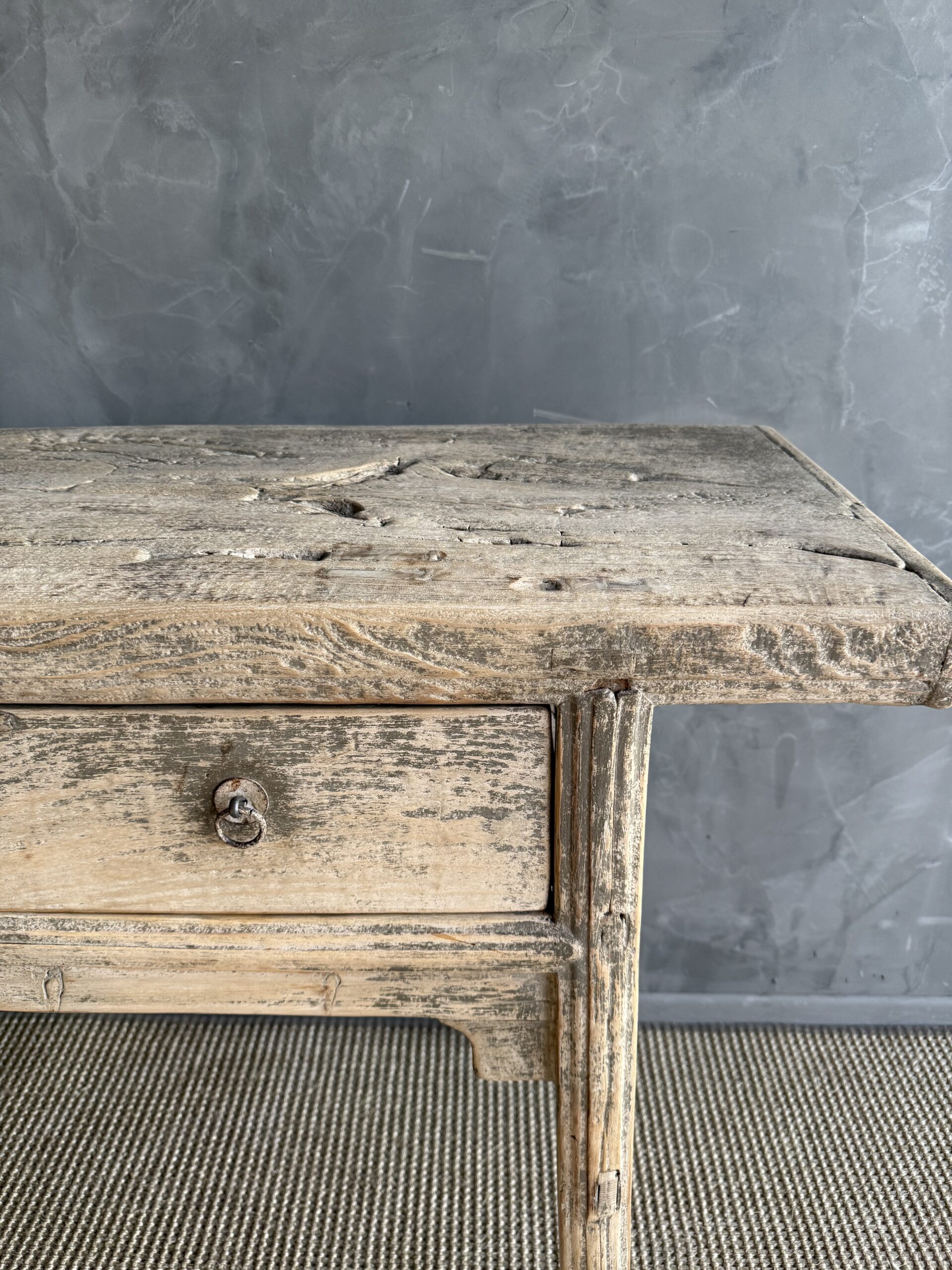 This charming vintage elm wood console is a one-of-a-kind piece with beautiful age and patina that adds character to any space. Its patina painted elm wood finish showcases the natural beauty of the wood, while the solid elm wood original hardware gives it a rustic charm. This unique console is perfect for a mountain, lake house, coastal or bringing a touch of nature indoors. With its timeless design and exceptional craftsmanship, this vintage elm wood console is sure to be a conversation starter and a focal point in your home.