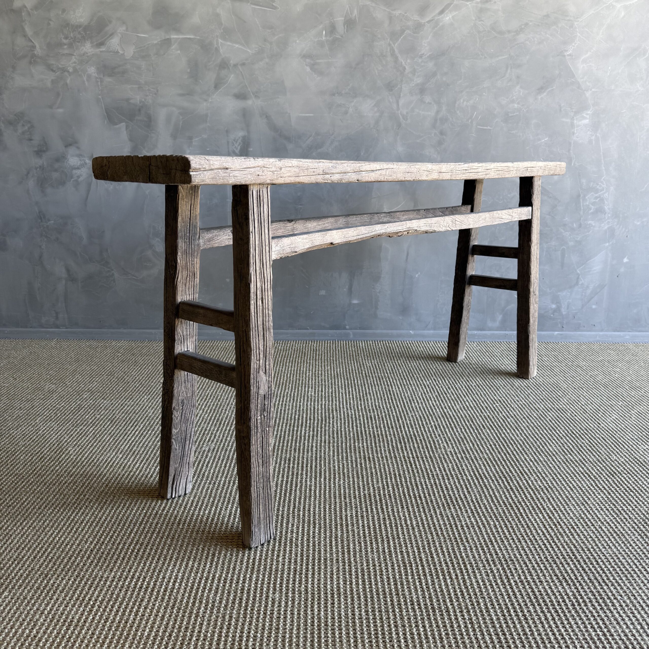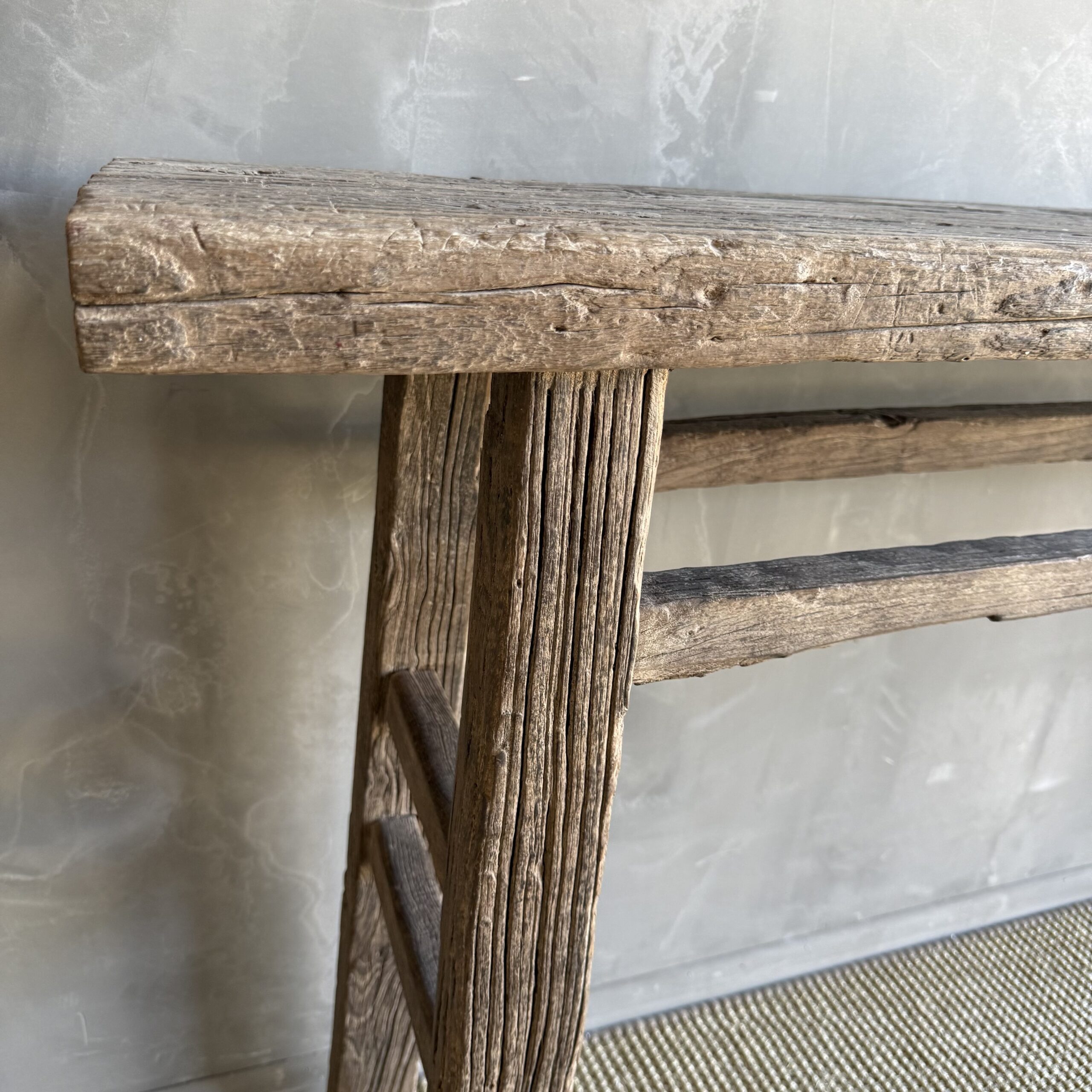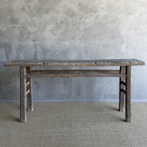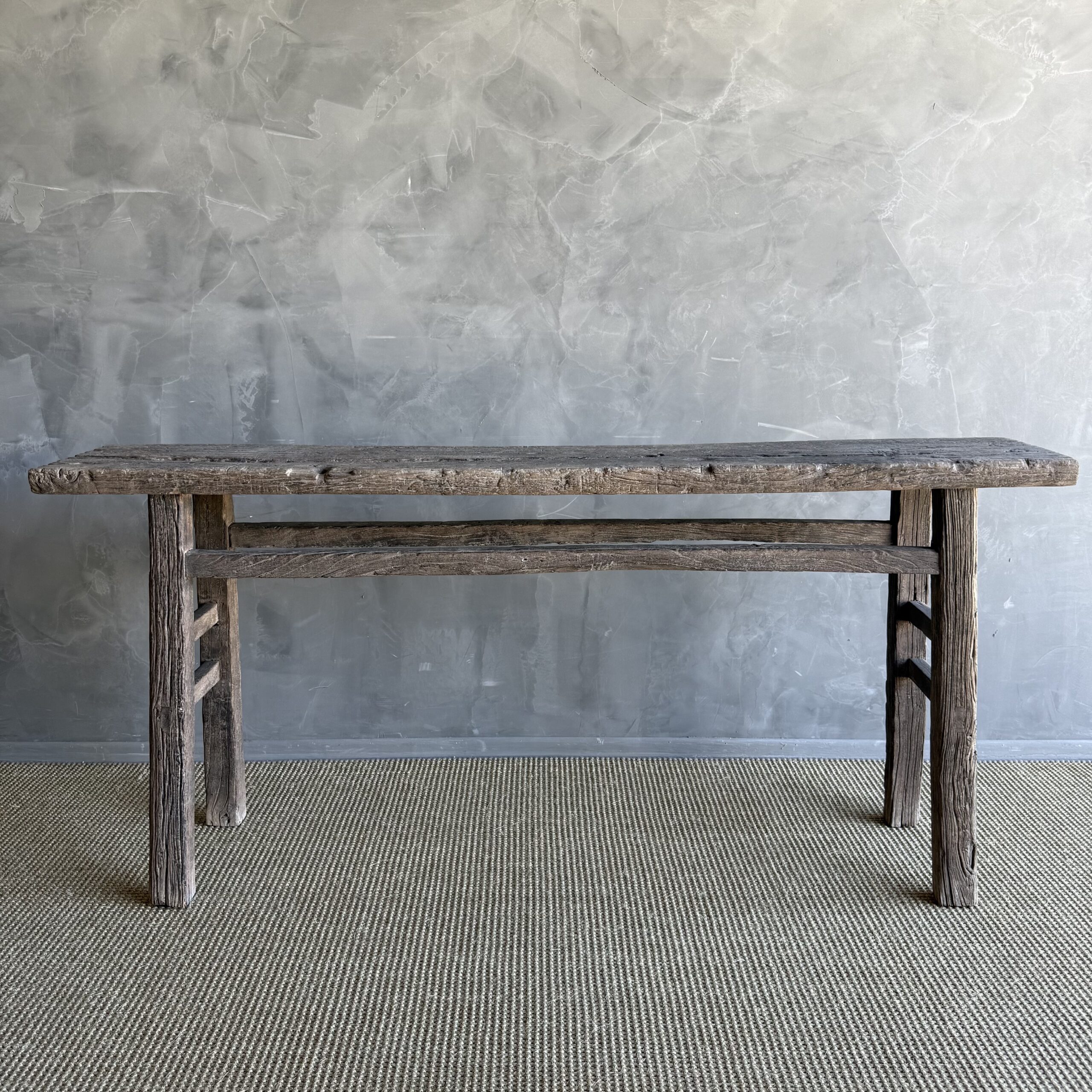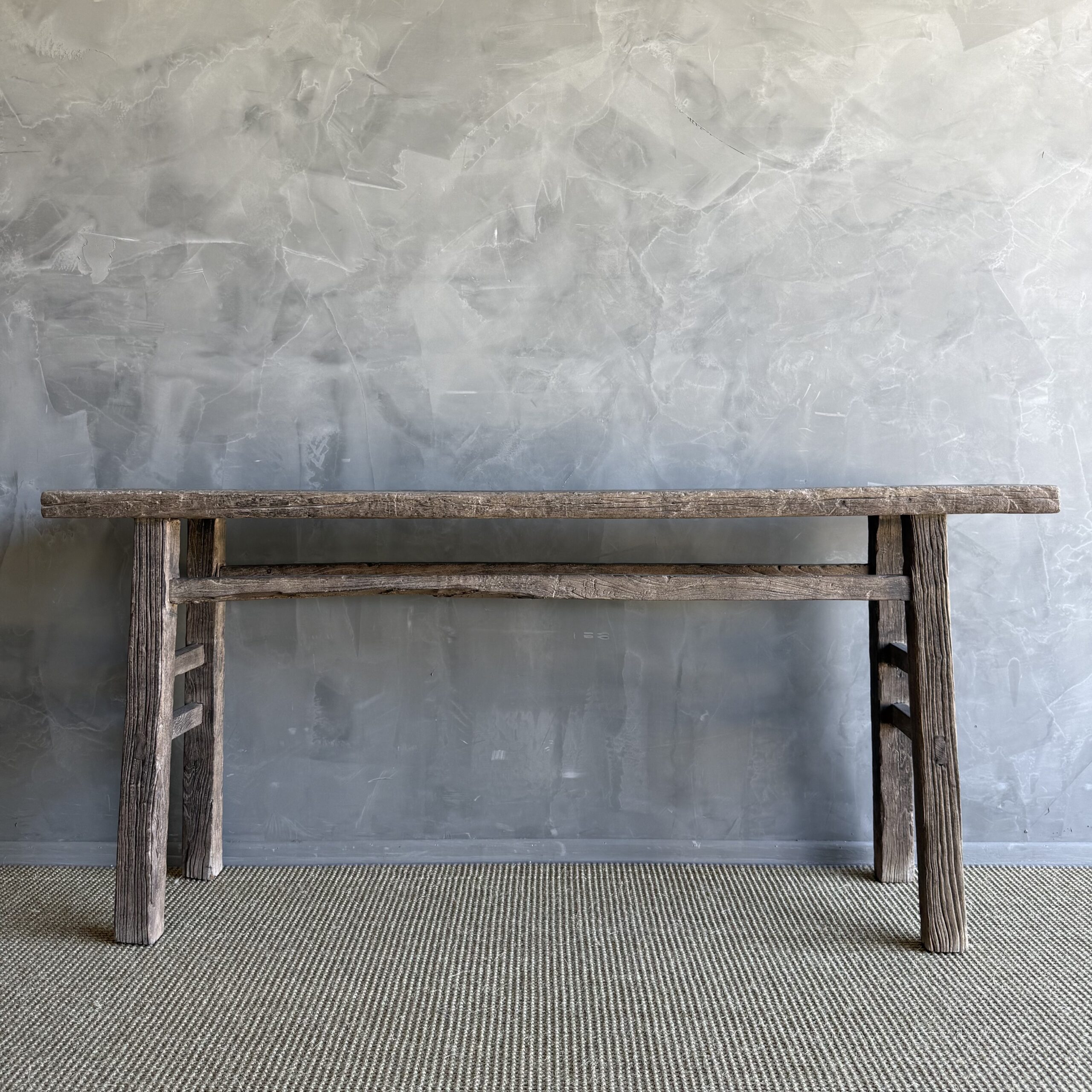 Vintage elm wood console table, featuring authentic elm wood with original natural wood patina. This rare find will bring a touch of wabi sabi aesthetic to your home, adding a unique and timeless charm to your space. Handcrafted with attention to detail, this console table combines history and character, providing a one-of-a-kind piece that will elevate any room it graces. Embrace the beauty of imperfection and celebrate the richness of the past with this exquisite vintage elm wood console table.