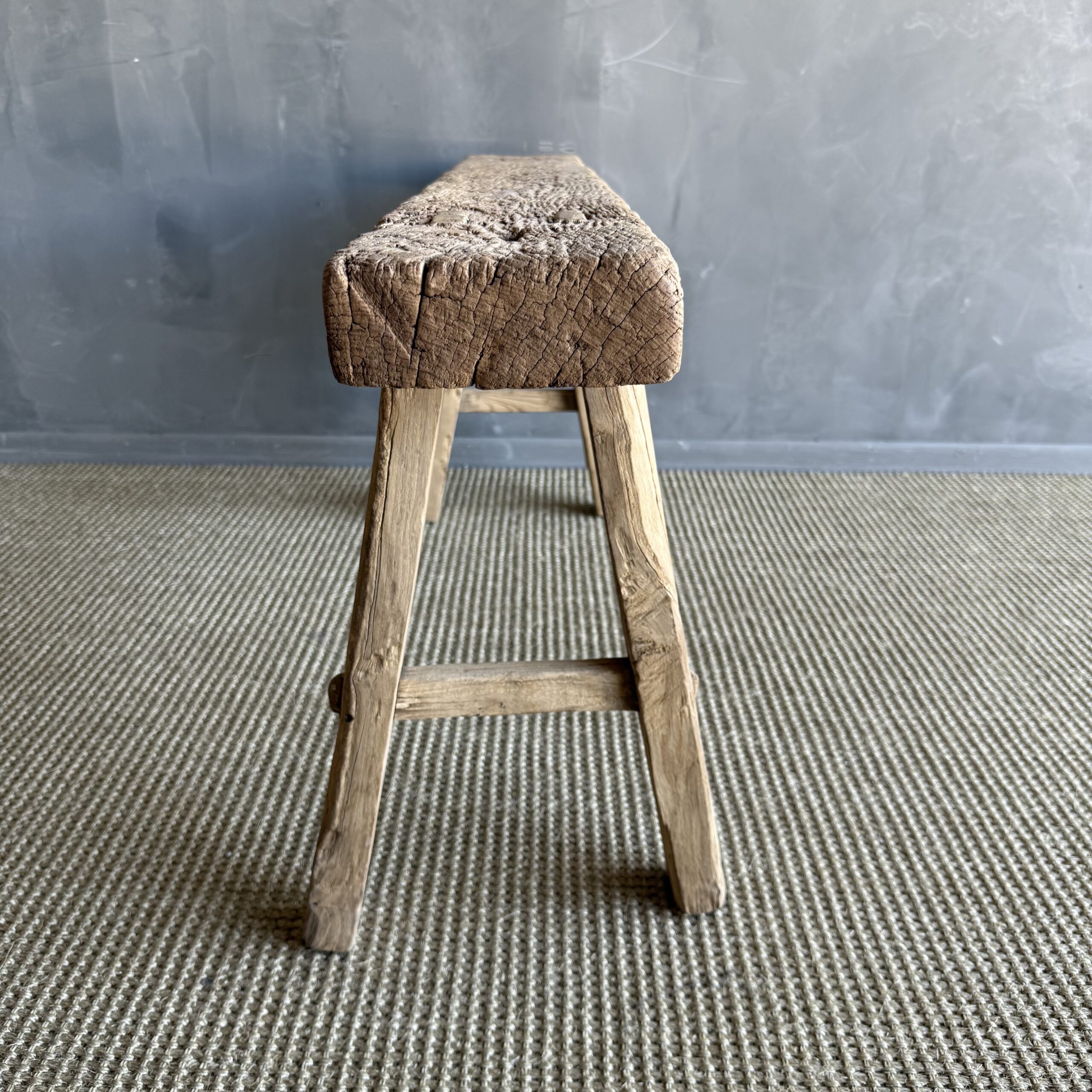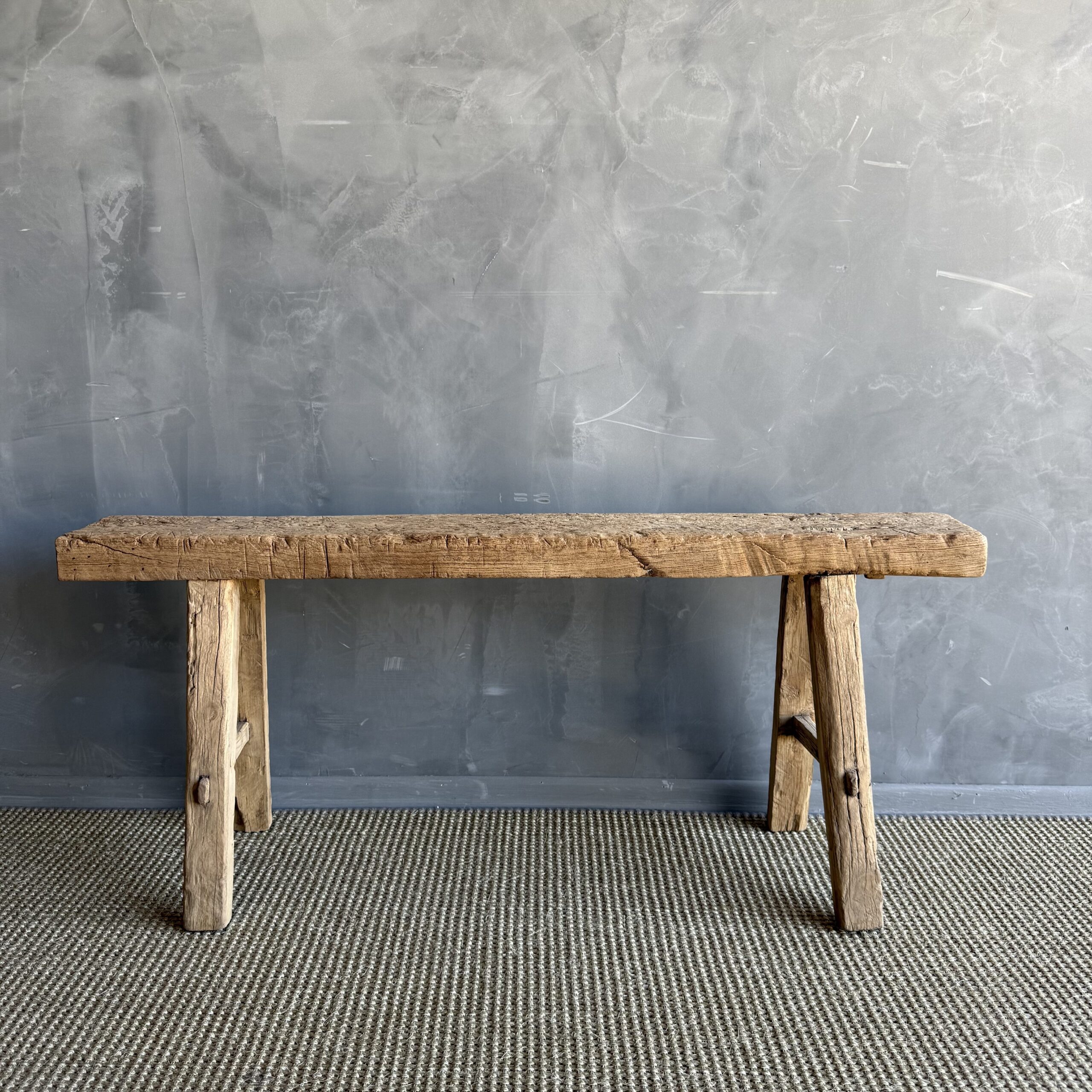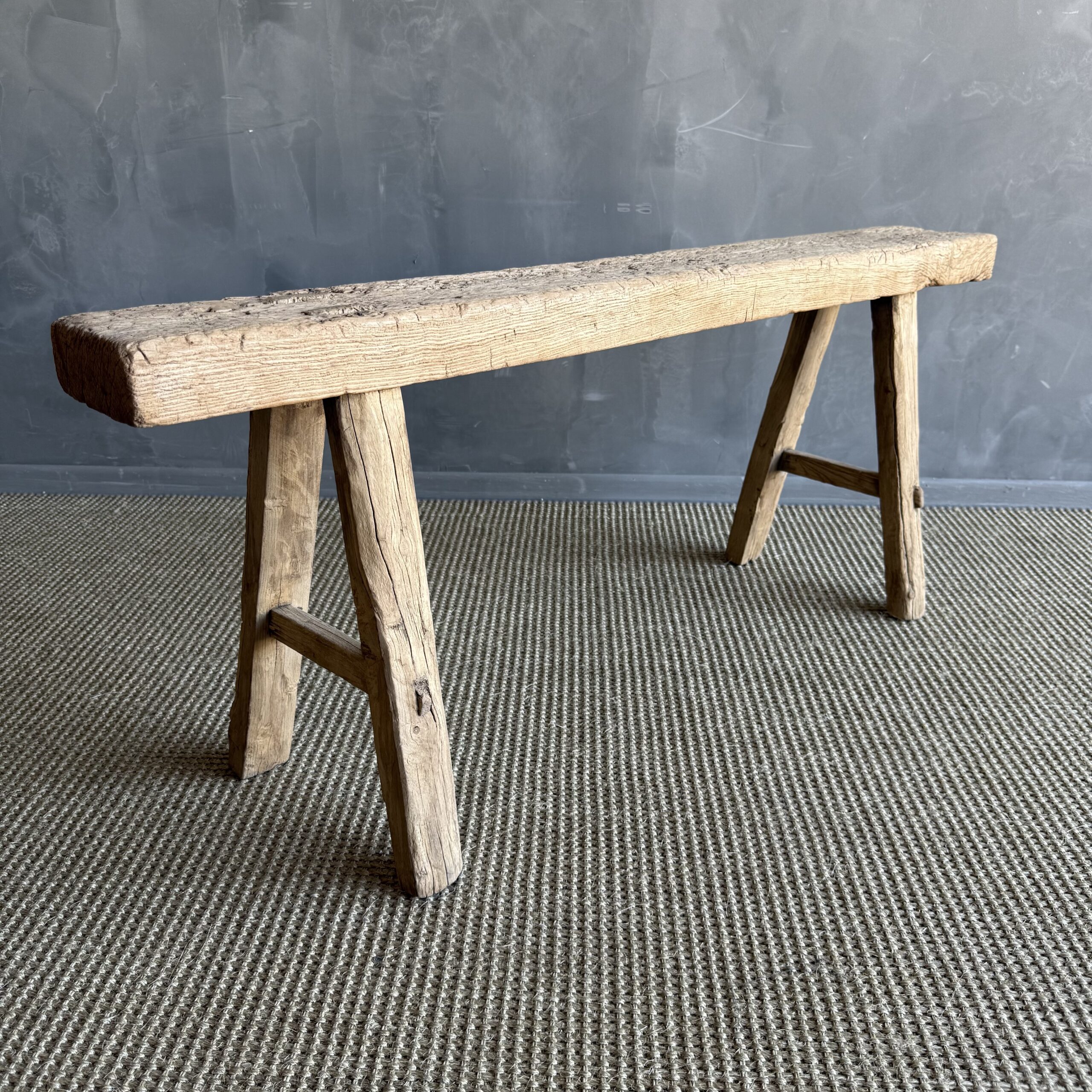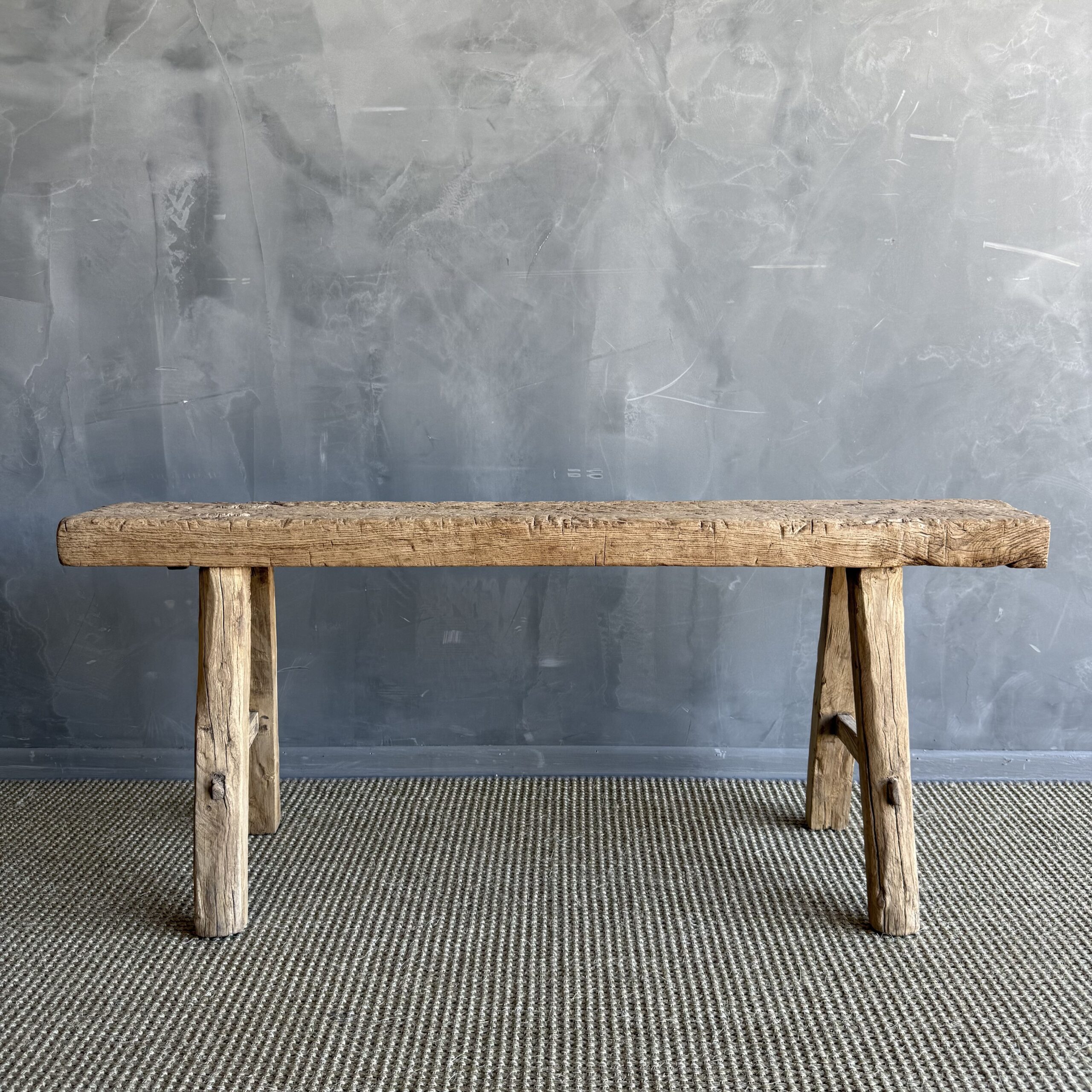 Vintage elm skinny bench. Crafted from reclaimed elm wood, this bench is not only solid and sturdy but also exudes a charming rustic charm. Perfect for adding character to any room, this bench is ideal for placing at the end of a bed, in the entryway, or in a hall space. The vintage elm wood gives it a unique character that will elevate the style of any room. Don’t miss out on the opportunity to bring a piece of history into your home with this stunning vintage find!