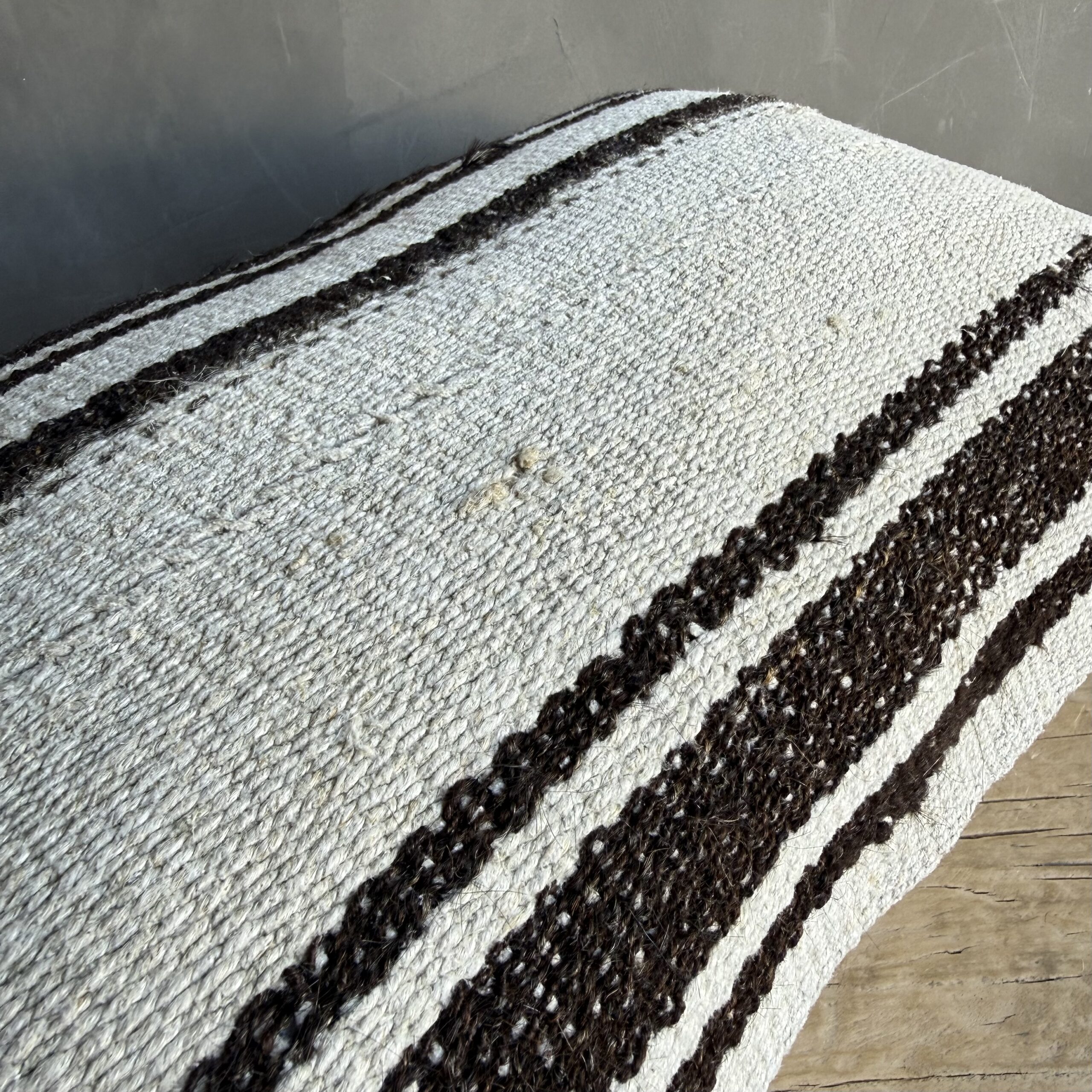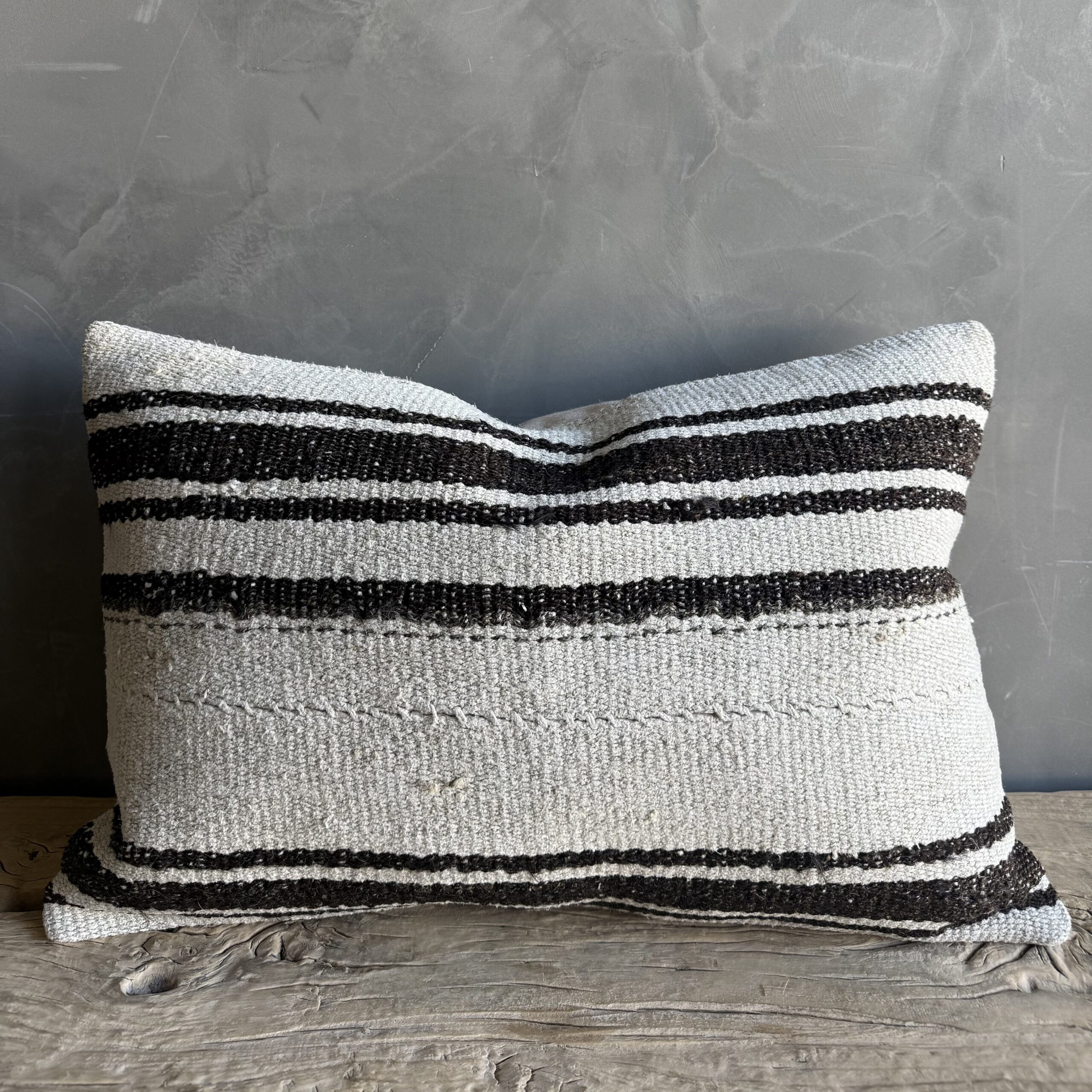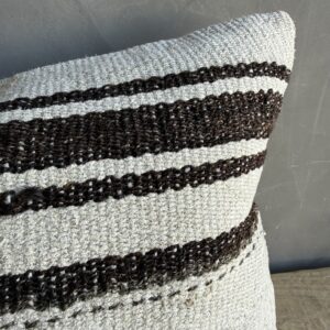 Creamy white hemp rug pillow with stripes. Soft hand, linen blend backing with zipper closure. Spot cleaning is recommended, or dry clean. These rugs have been professionally cleaned prior to construction. These durable pillows will last for years, and are great for high use areas.