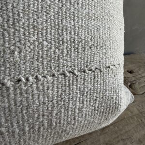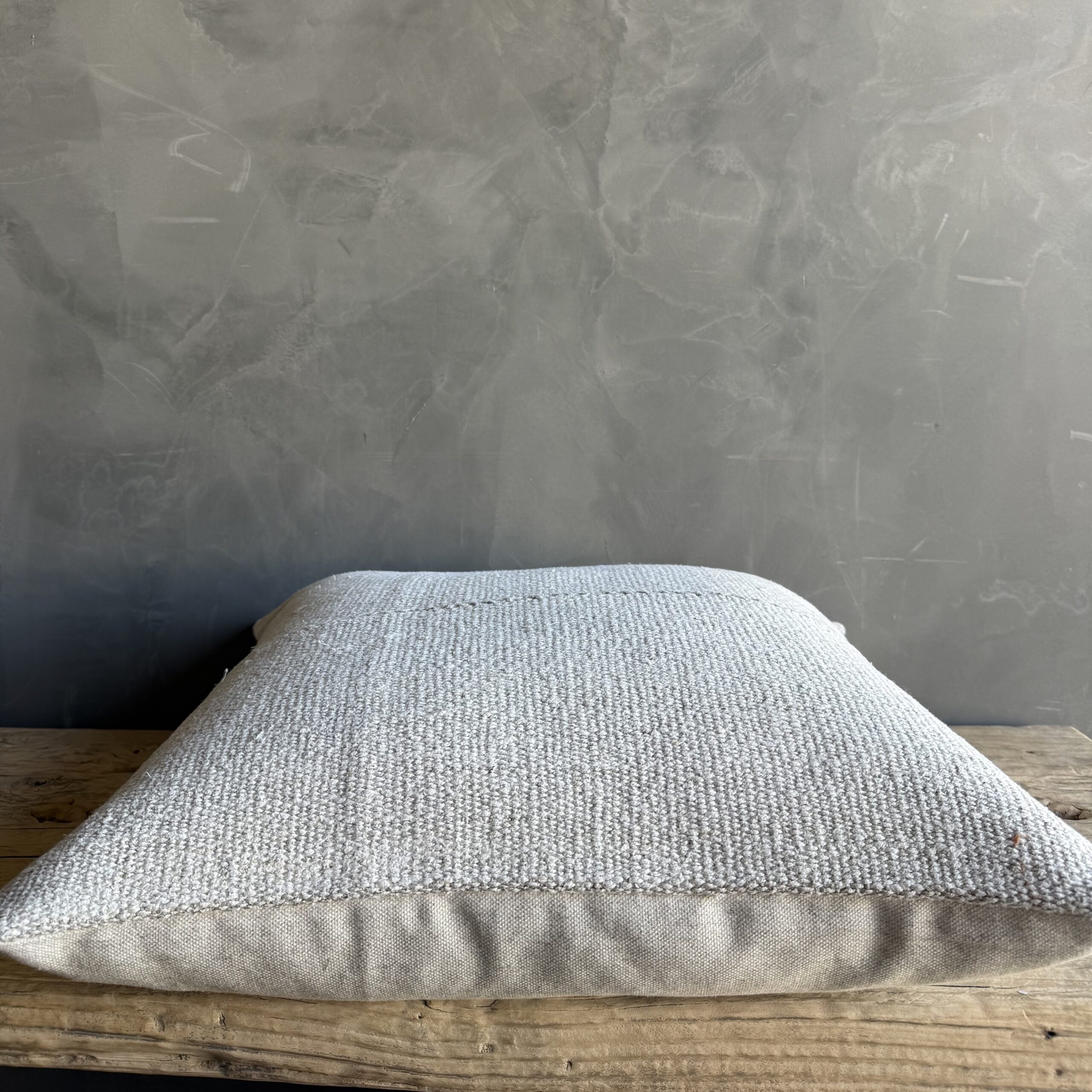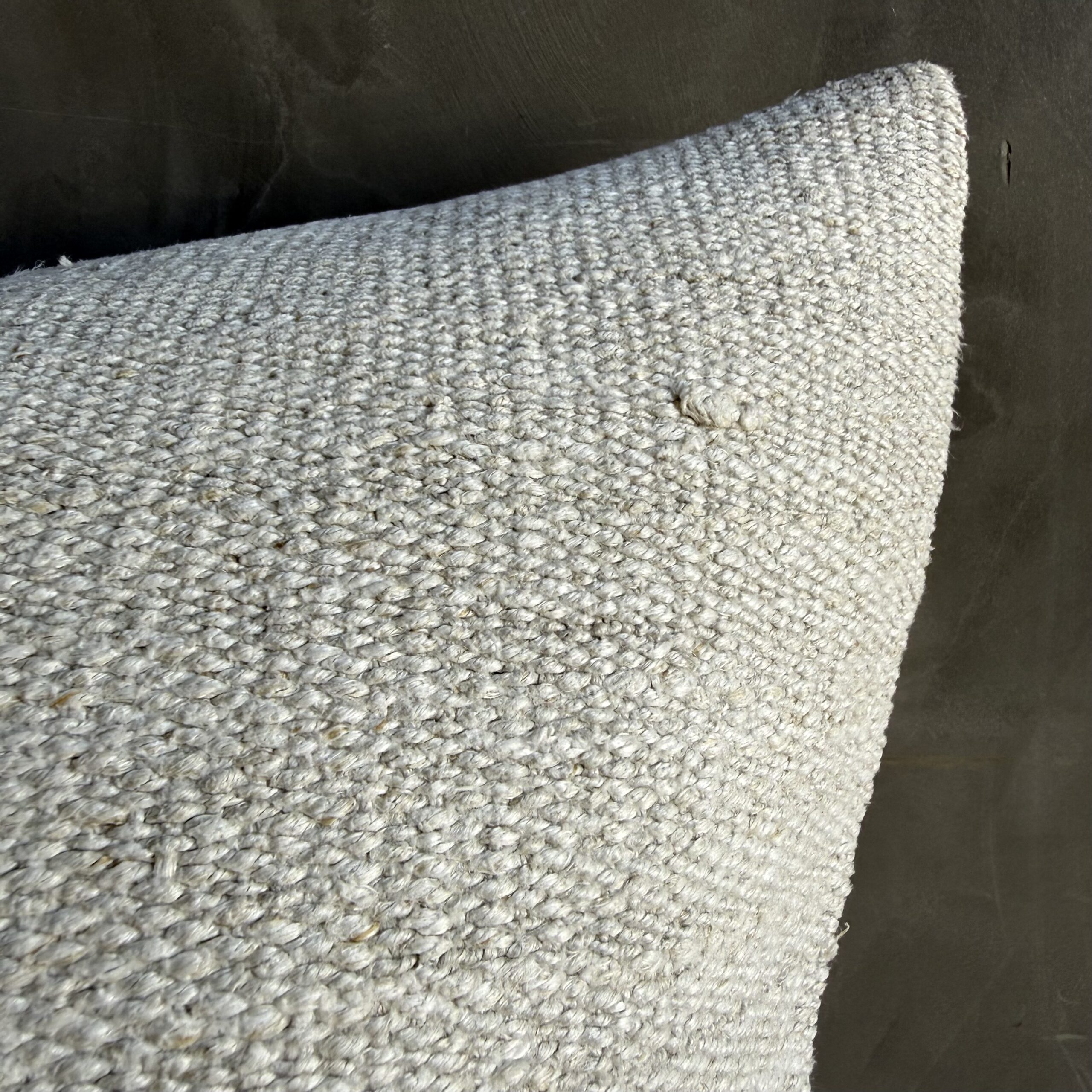 Creamy white hemp rug pillow with original seams. Soft hand, linen blend backing with zipper closure. Spot cleaning is recommended, or dry clean. These rugs have been professionally cleaned prior to construction. These durable pillows will last for years, and are great for high use areas.