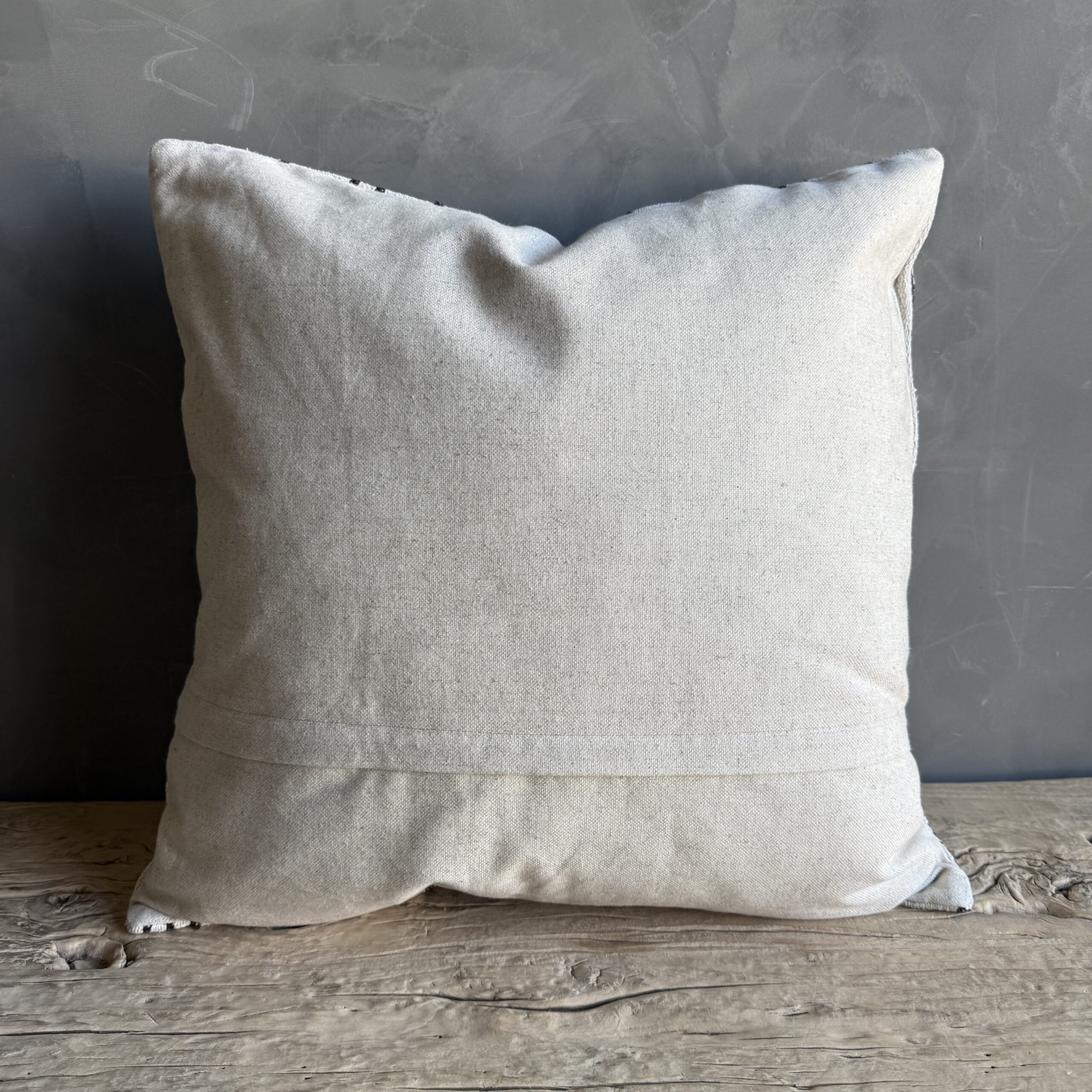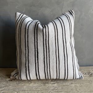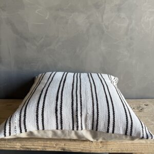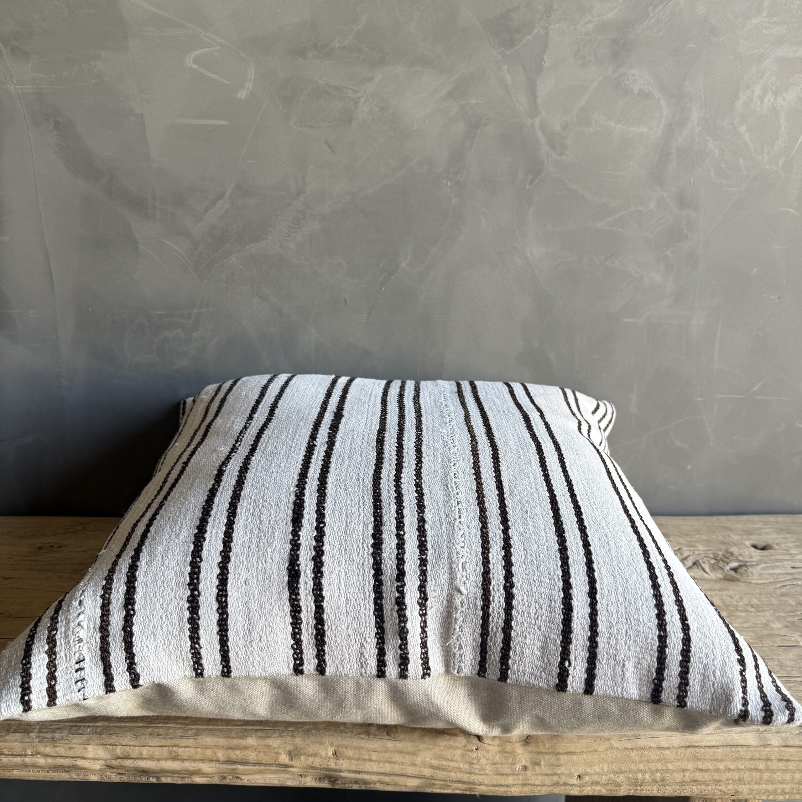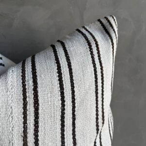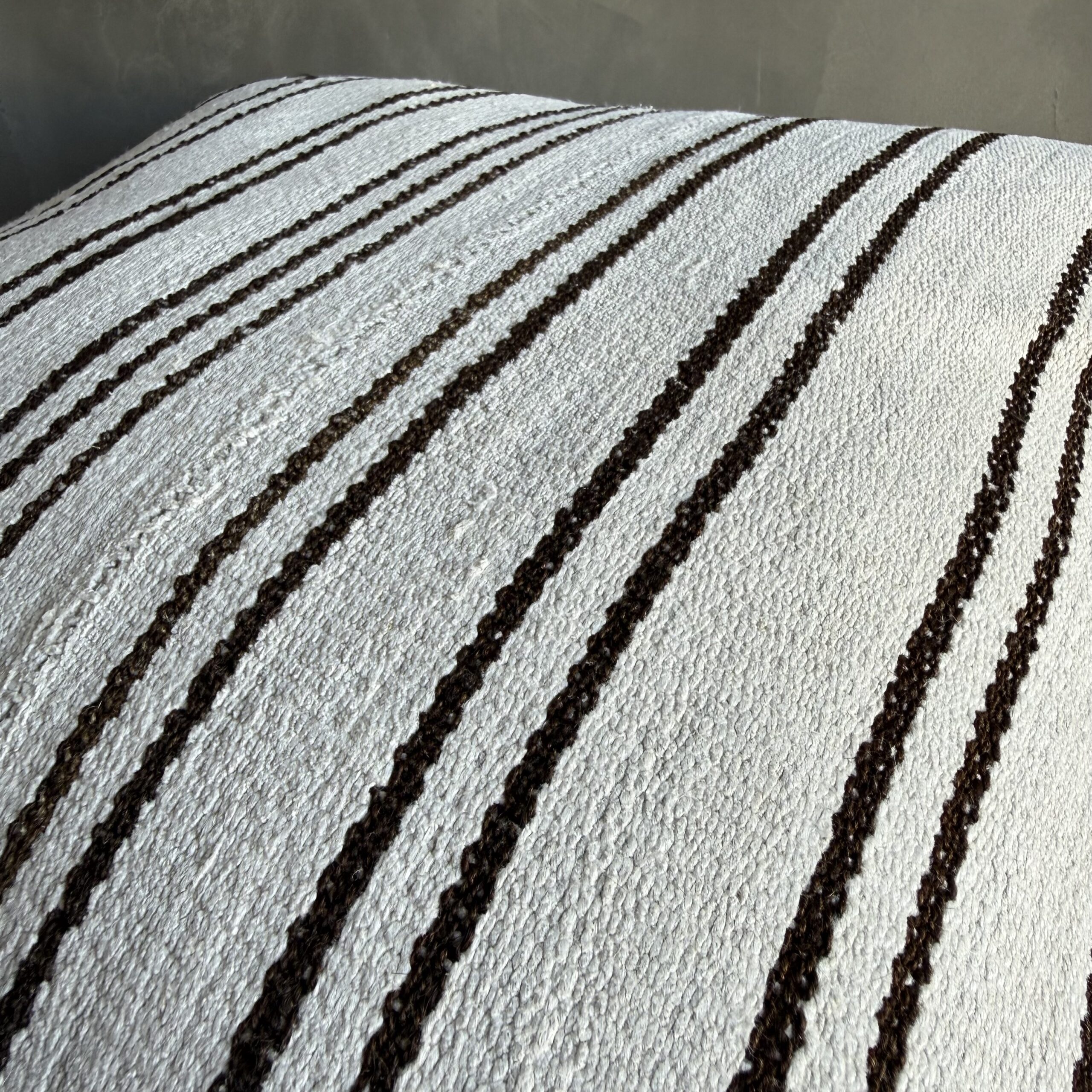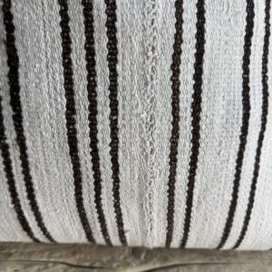 Creamy white hemp rug pillow with stripes. Soft hand, linen blend backing with zipper closure. Spot cleaning is recommended, or dry clean. These rugs have been professionally cleaned prior to construction. These durable pillows will last for years, and are great for high use areas.