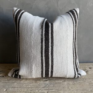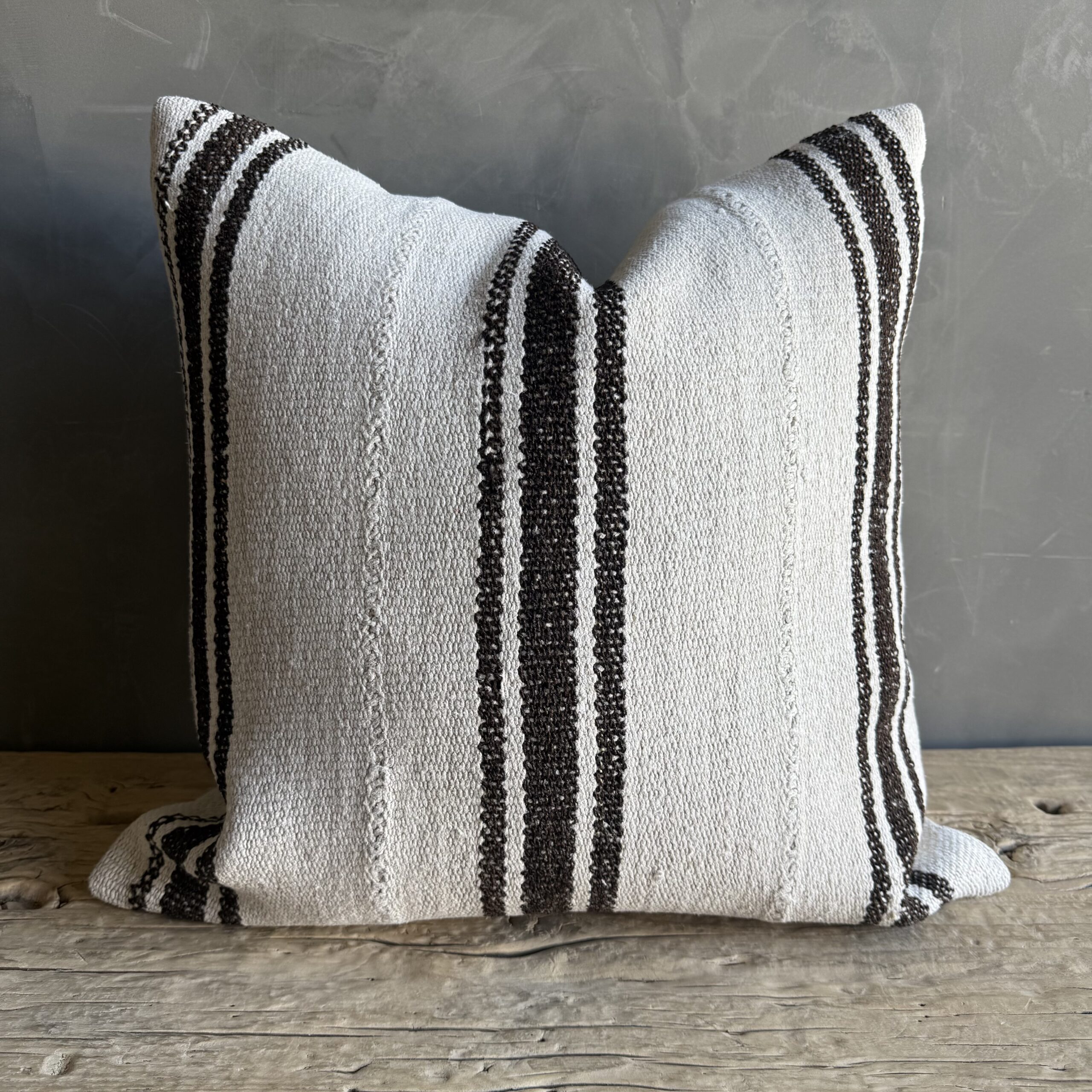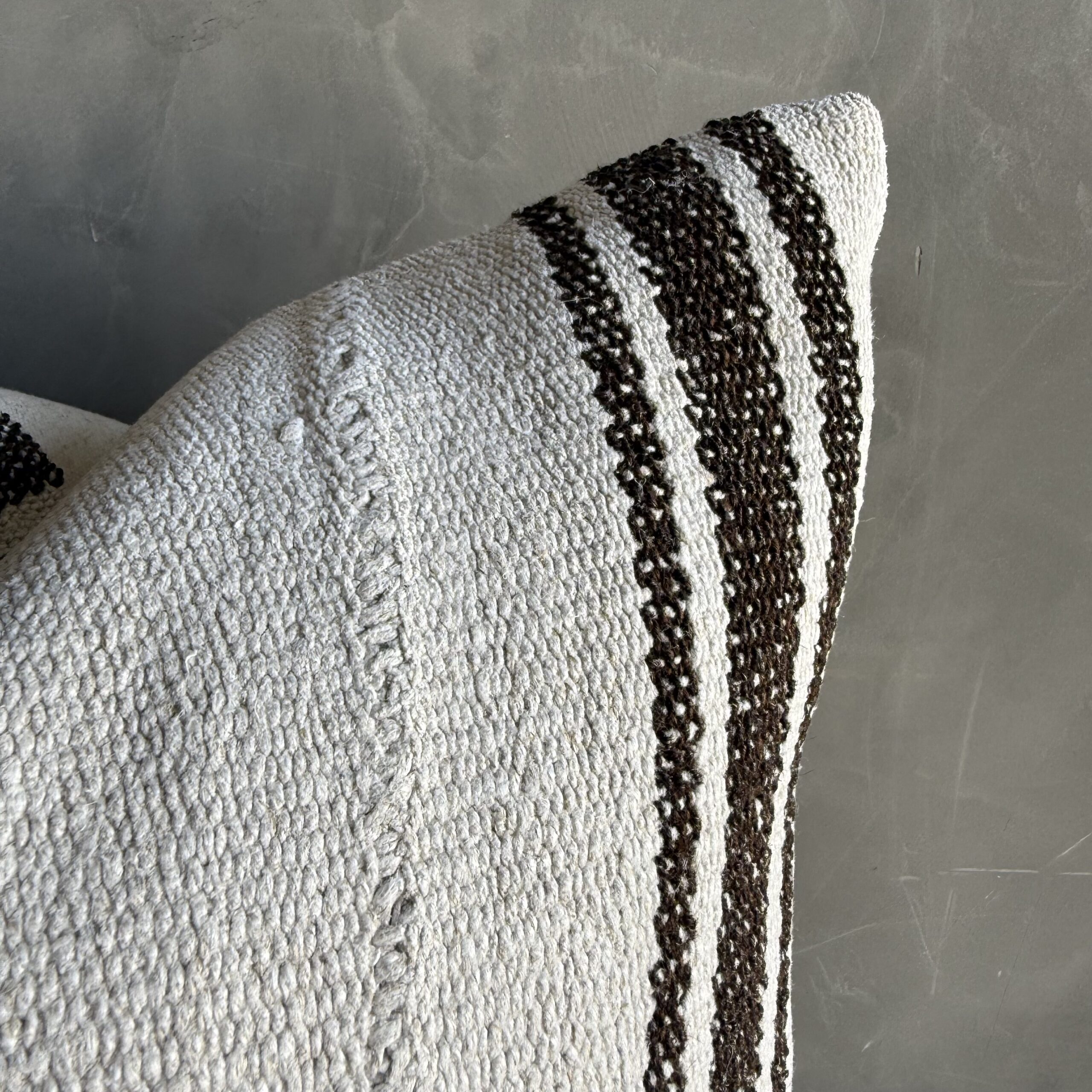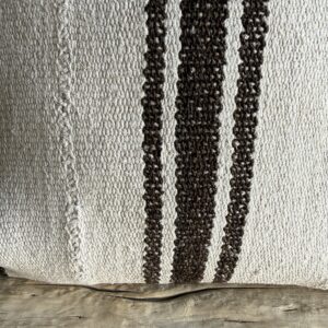 Creamy white hemp rug pillow with stripes. Soft hand, linen blend backing with zipper closure. Spot cleaning is recommended, or dry clean. These rugs have been professionally cleaned prior to construction. These durable pillows will last for years, and are great for high use areas.