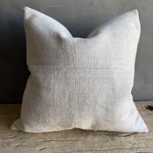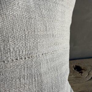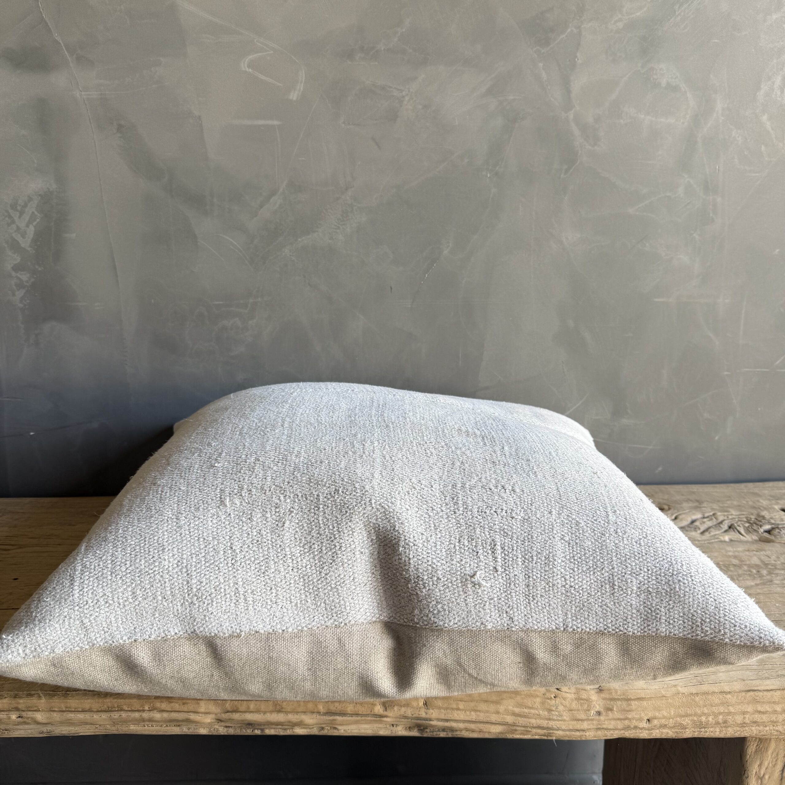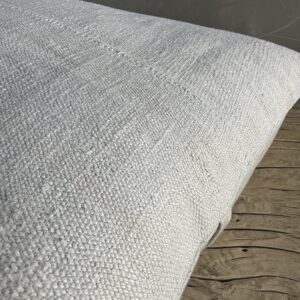 Creamy white hemp rug pillow with original seams. Soft hand, linen blend backing with zipper closure. Spot cleaning is recommended, or dry clean. These rugs have been professionally cleaned prior to construction. These durable pillows will last for years, and are great for high use areas.