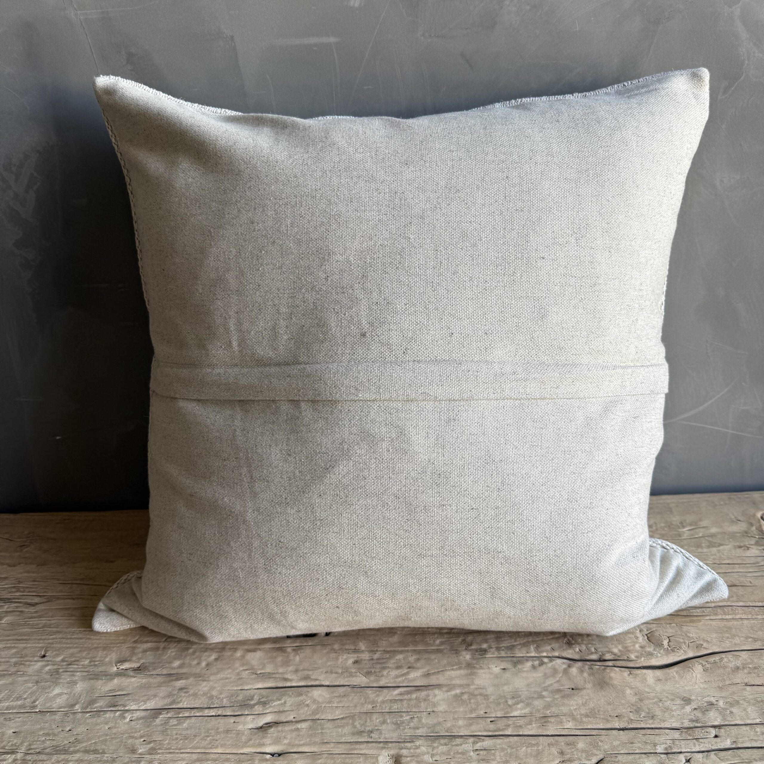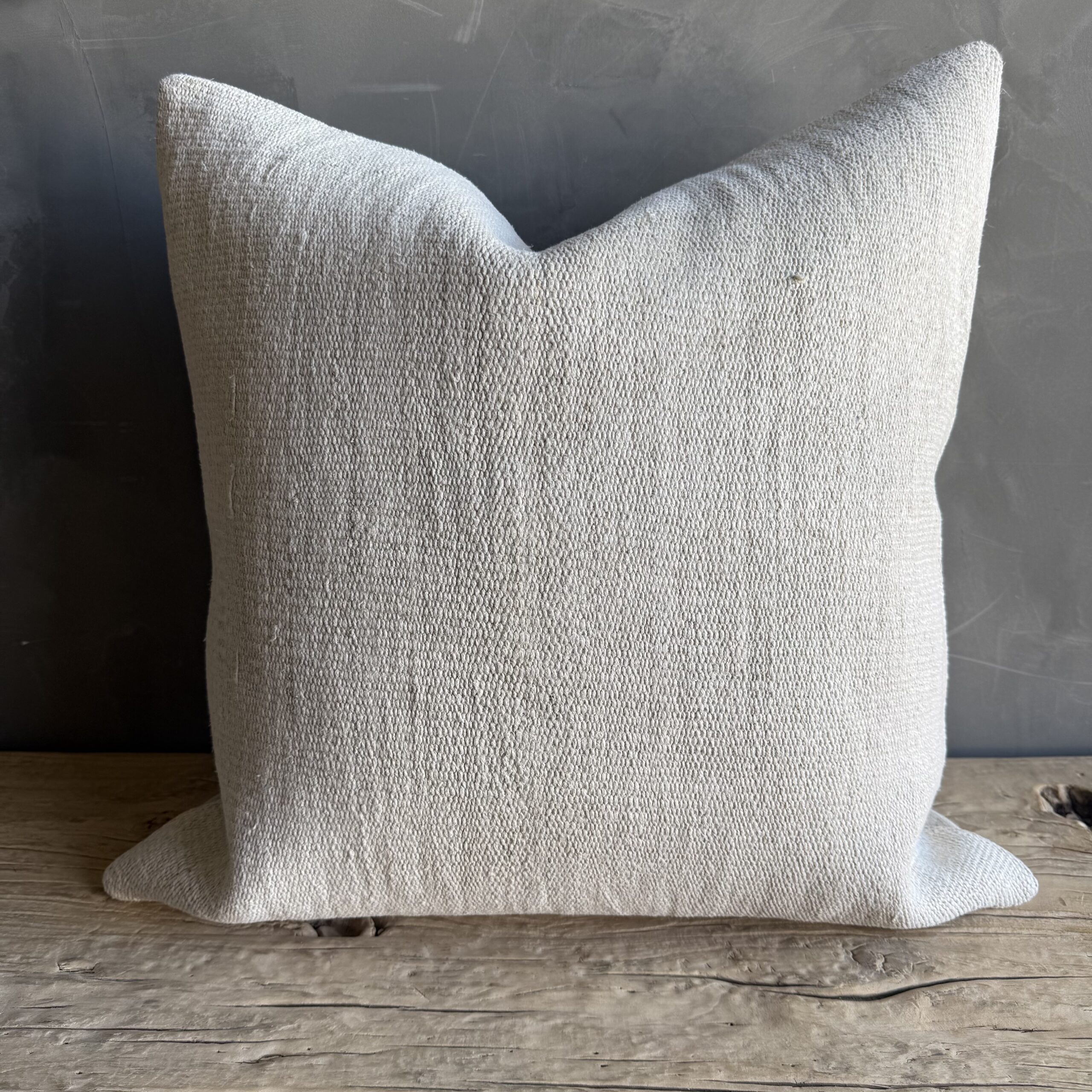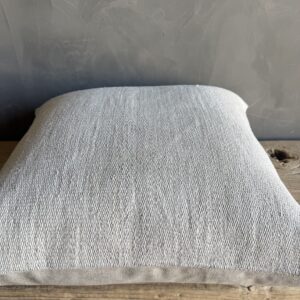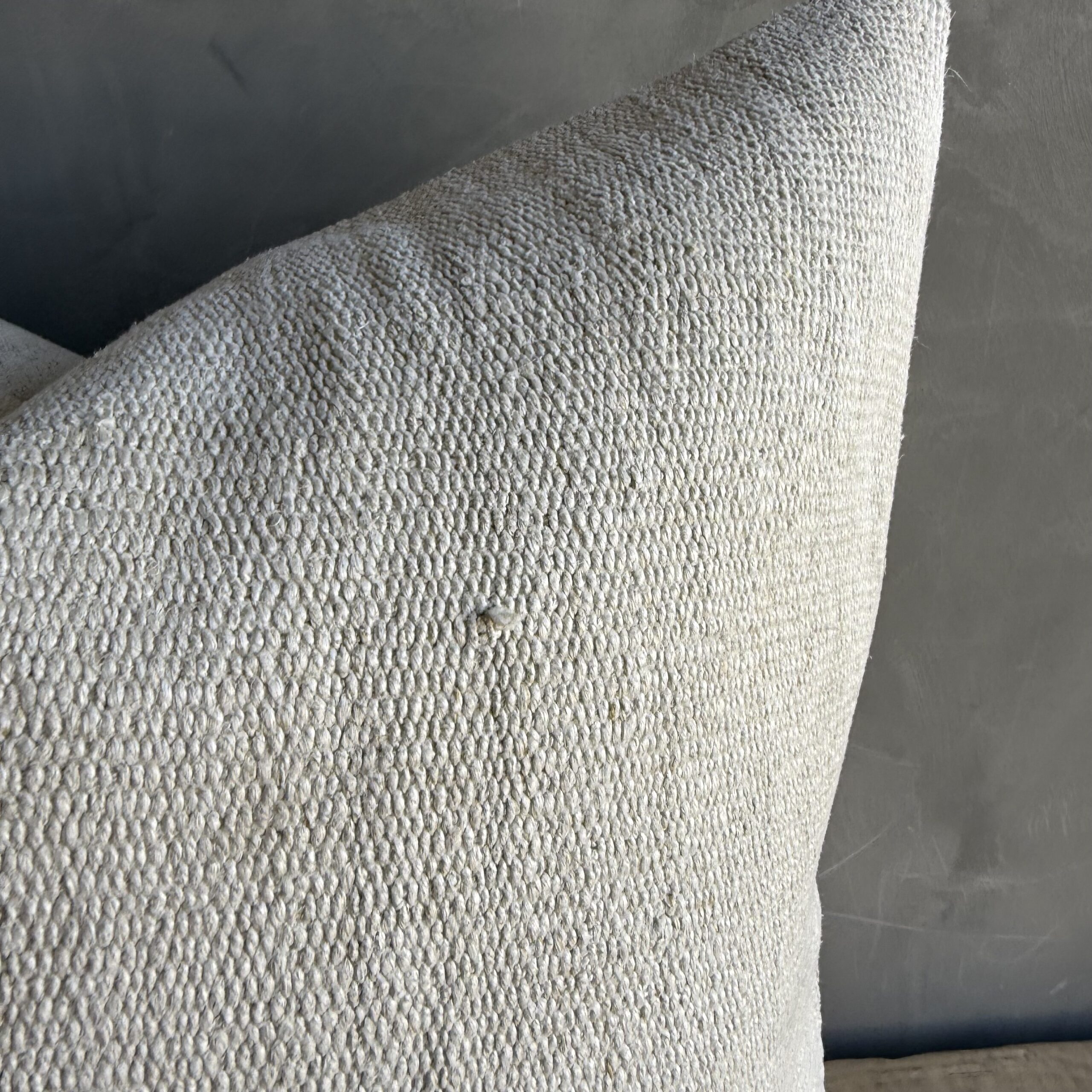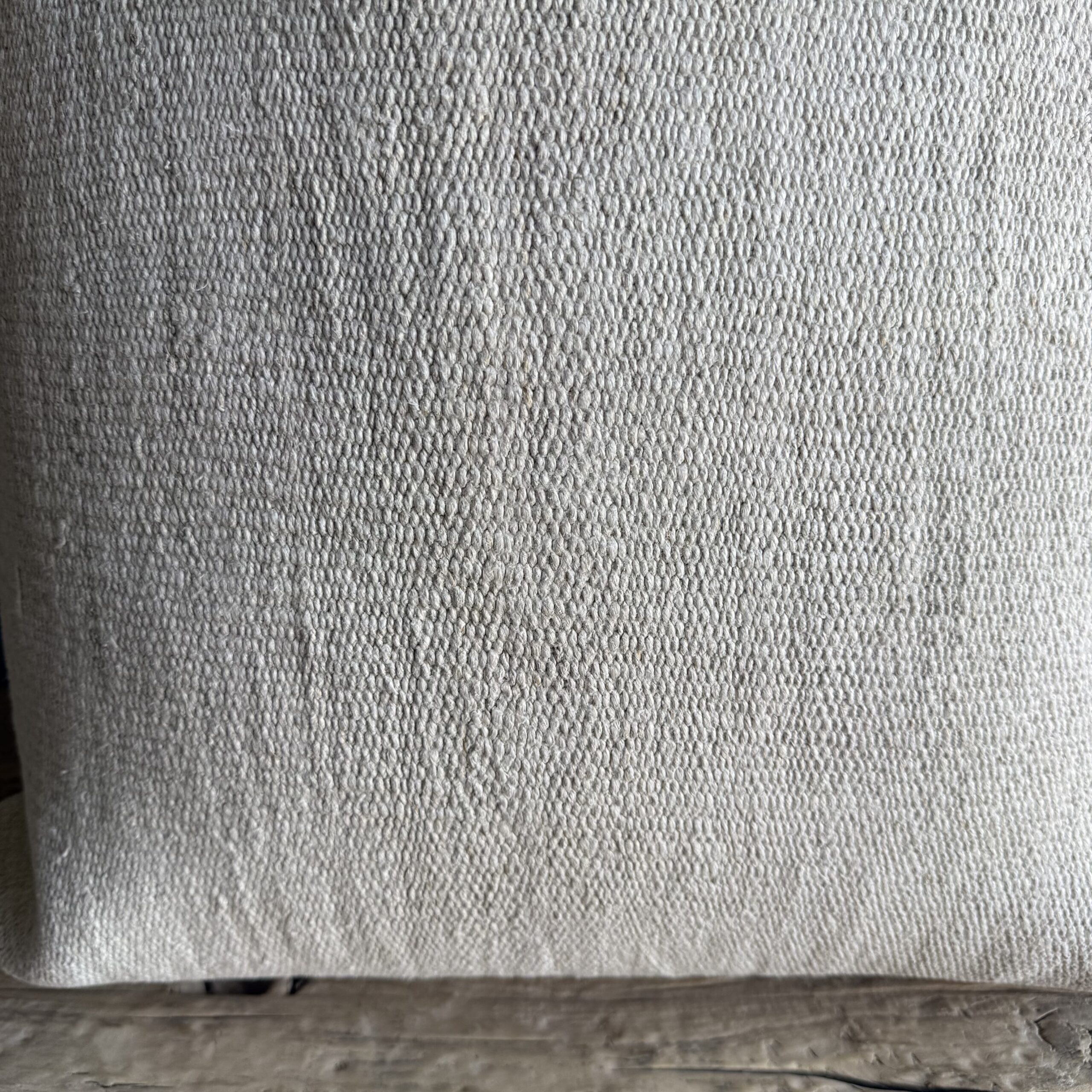 Creamy white hemp rug pillow with original seams. Soft hand, linen blend backing with zipper closure. Spot cleaning is recommended, or dry clean. These rugs have been professionally cleaned prior to construction. These durable pillows will last for years, and are great for high use areas.