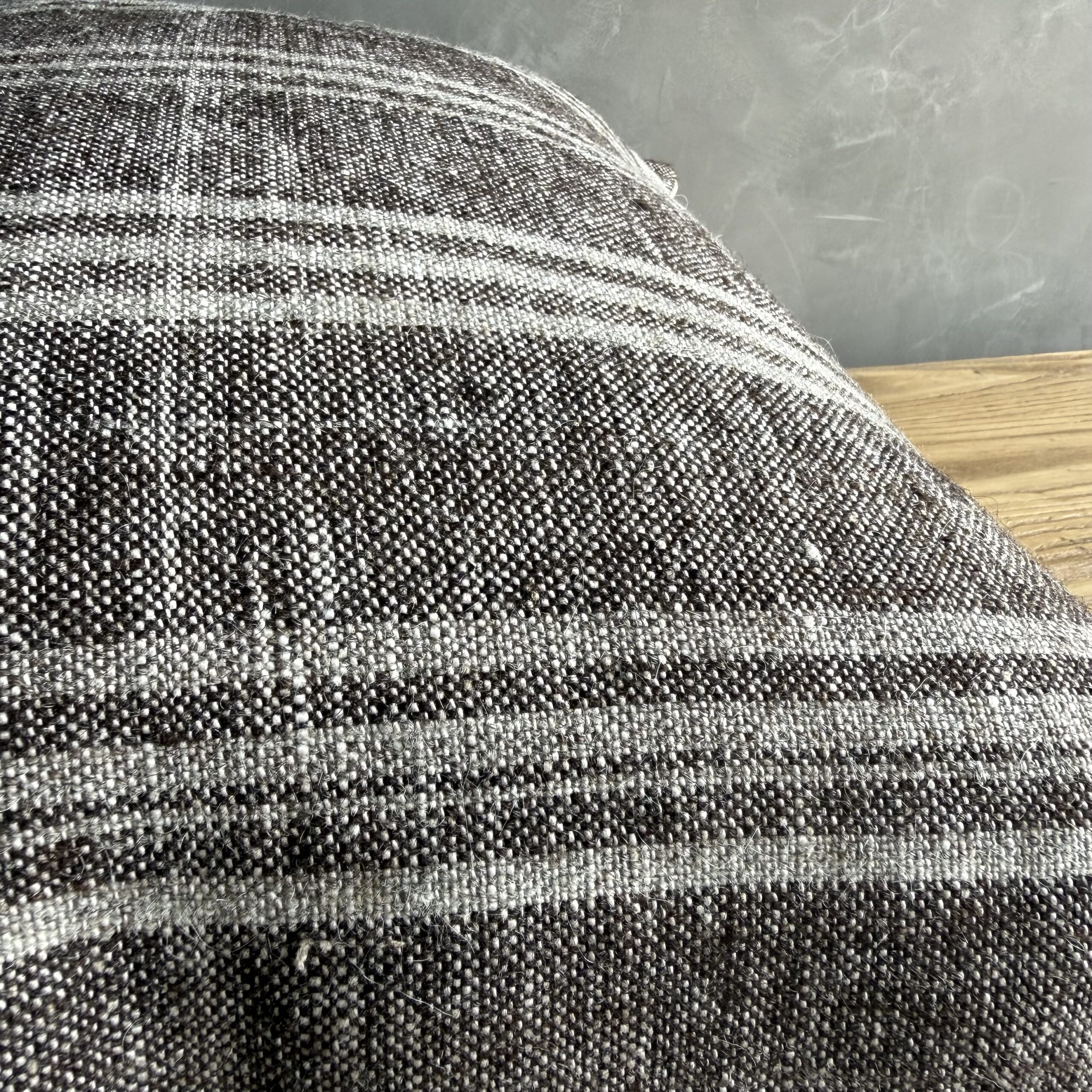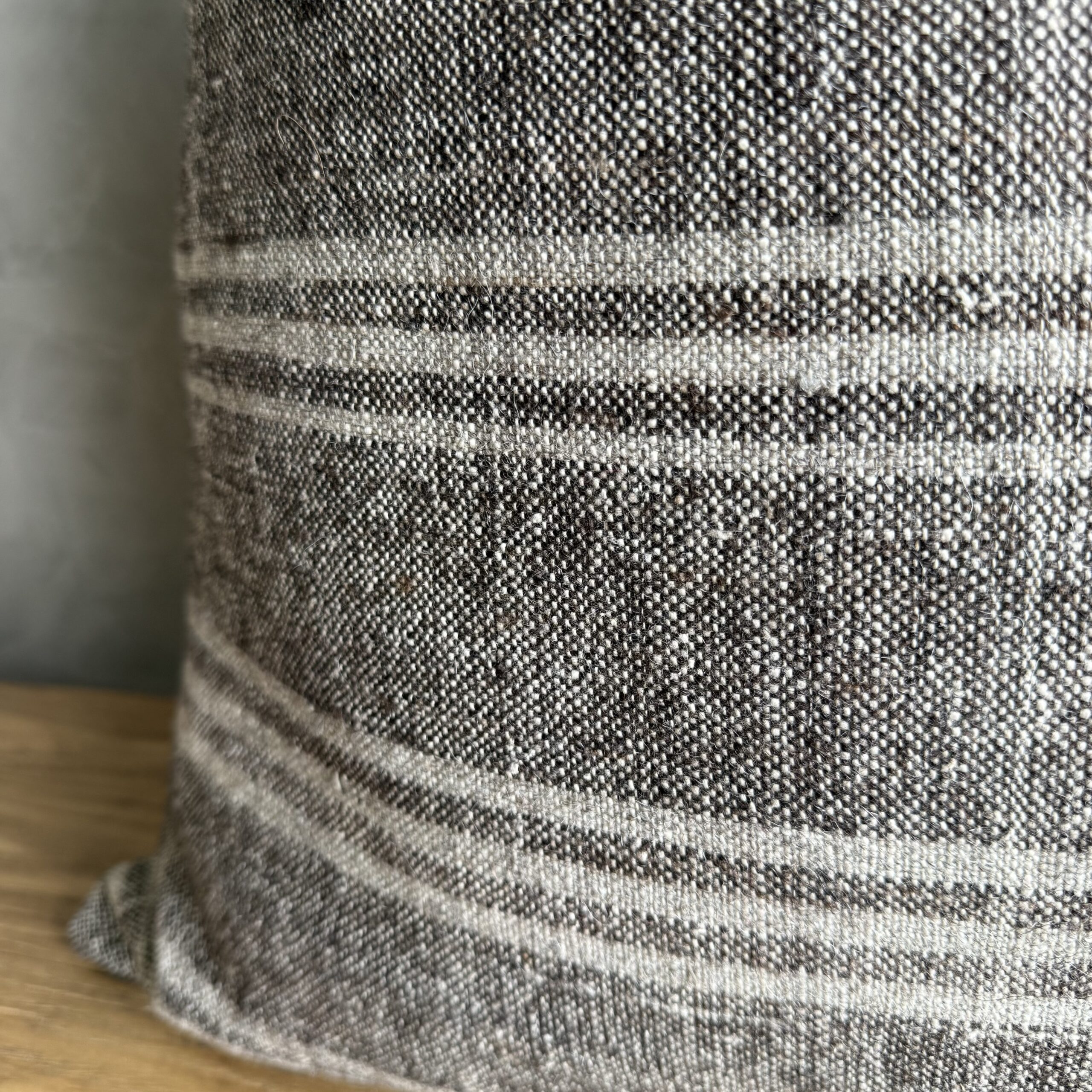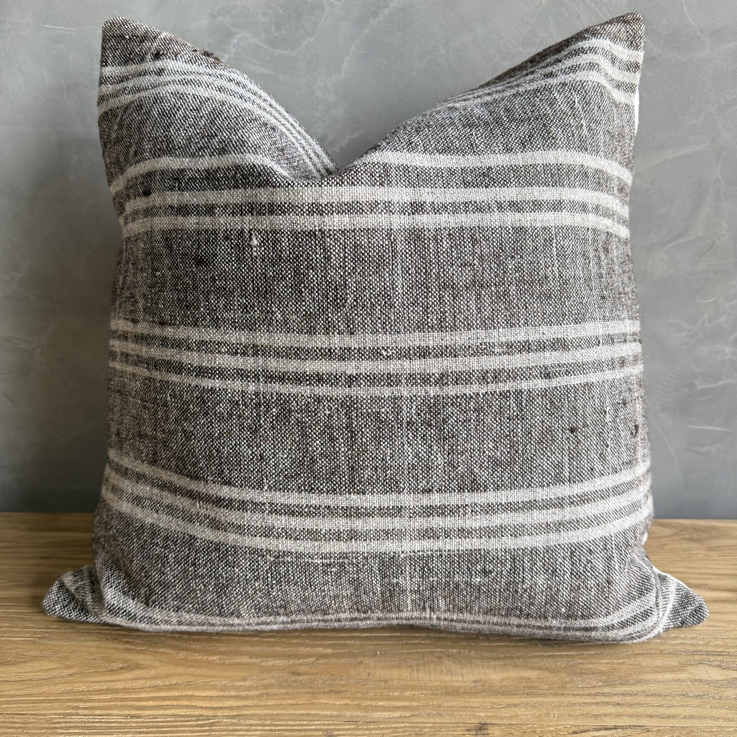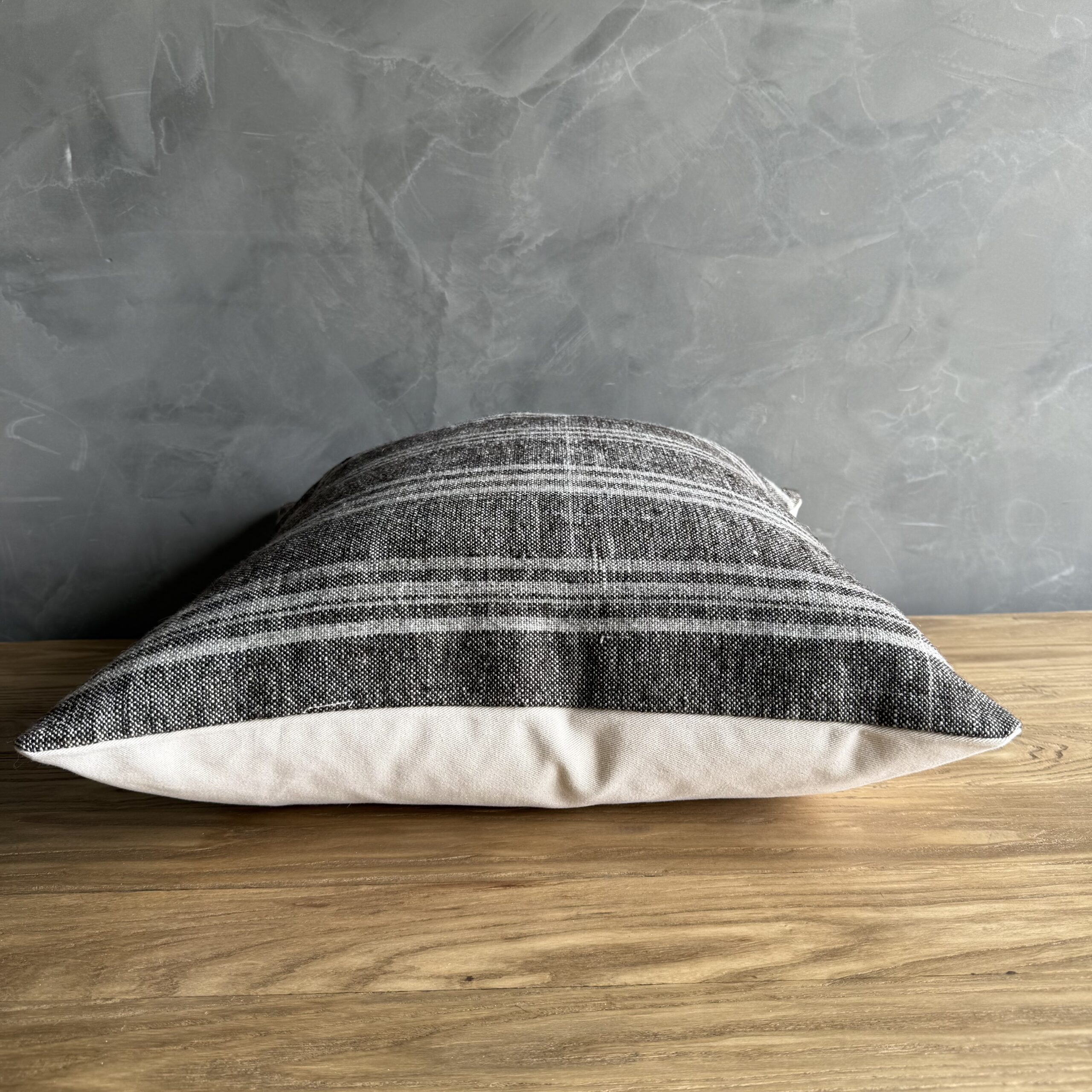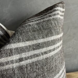 Creamy white hemp rug pillow with original seams. Soft hand, linen blend backing with zipper closure. Spot cleaning is recommended, or dry clean. These rugs have been professionally cleaned prior to construction. These durable pillows will last for years, and are great for high use areas.