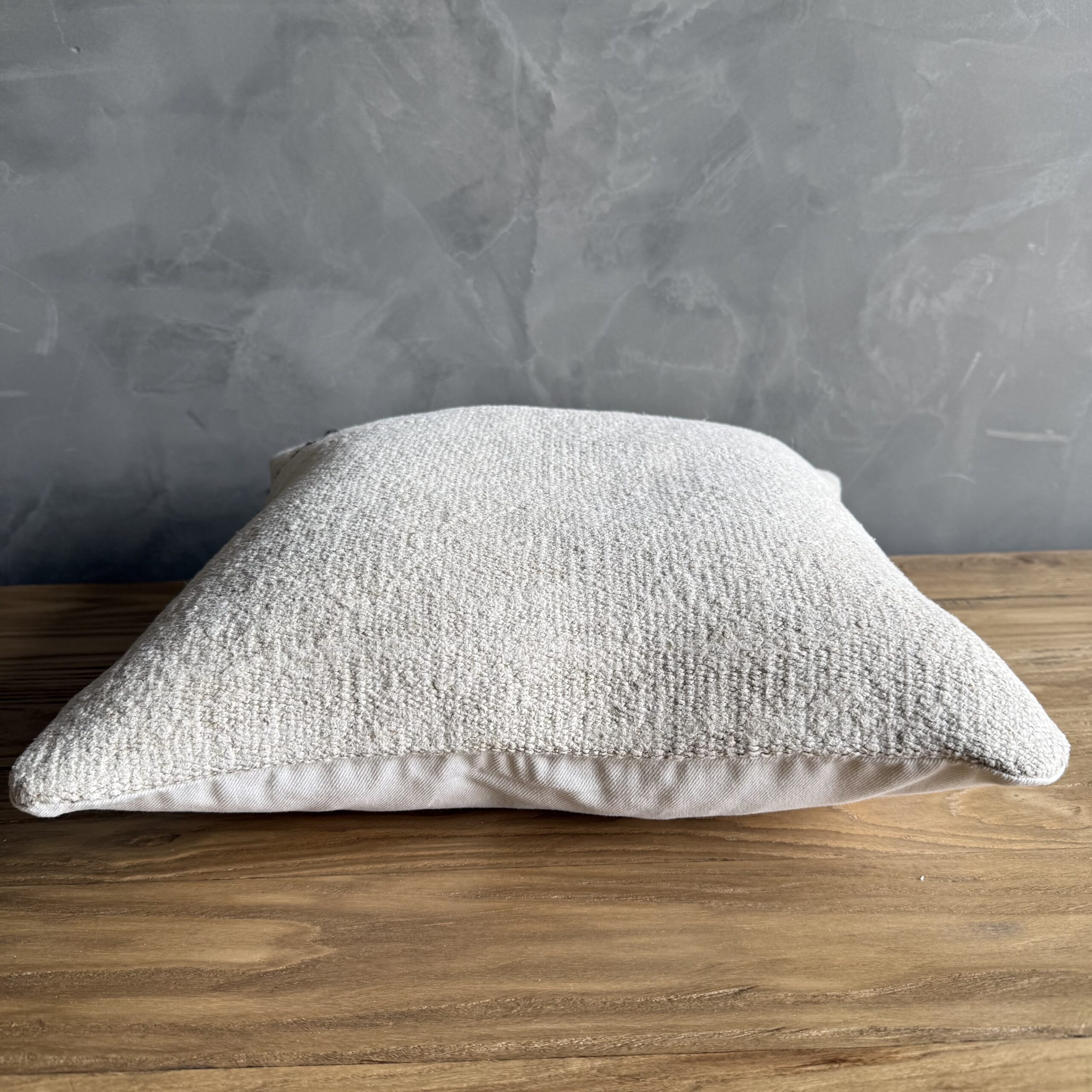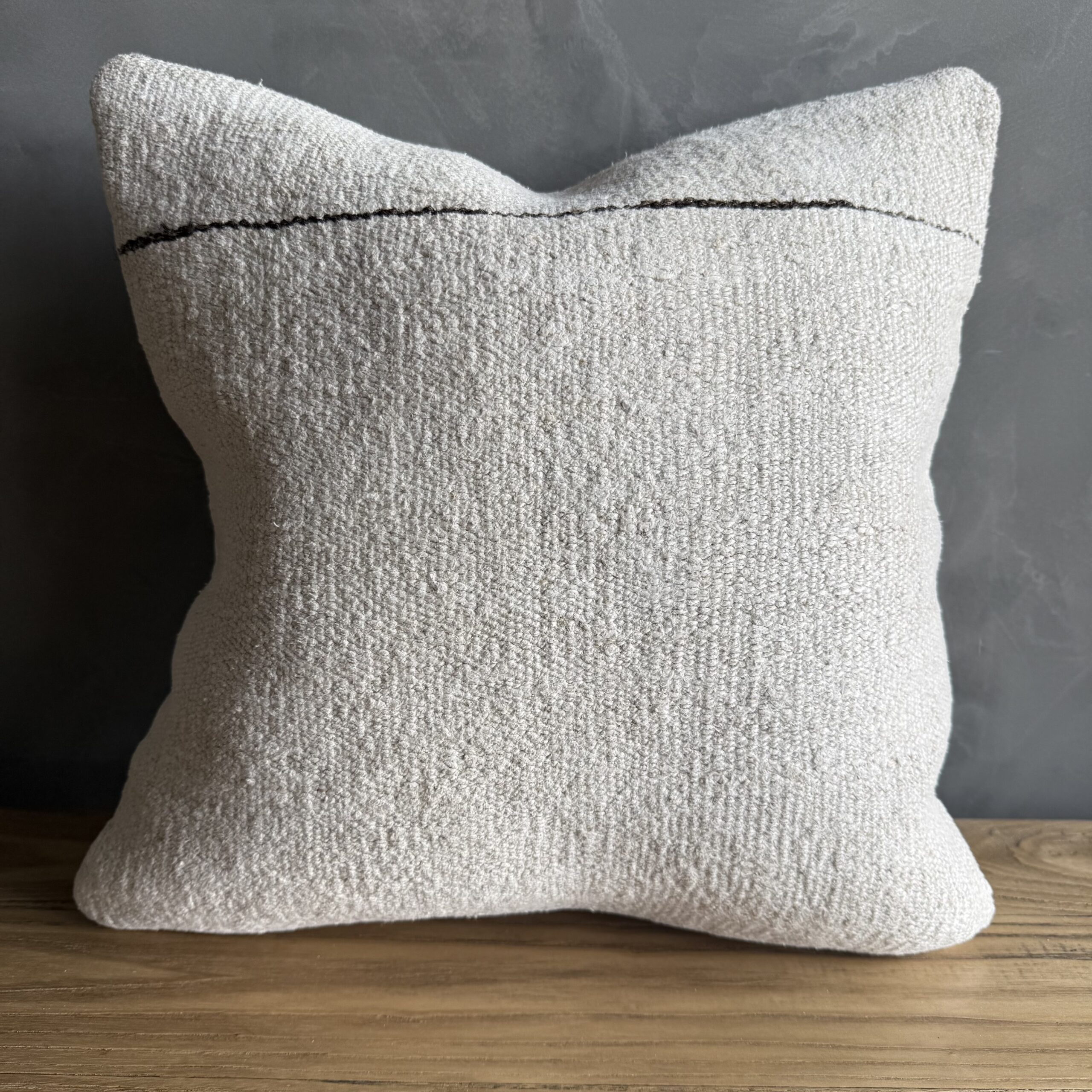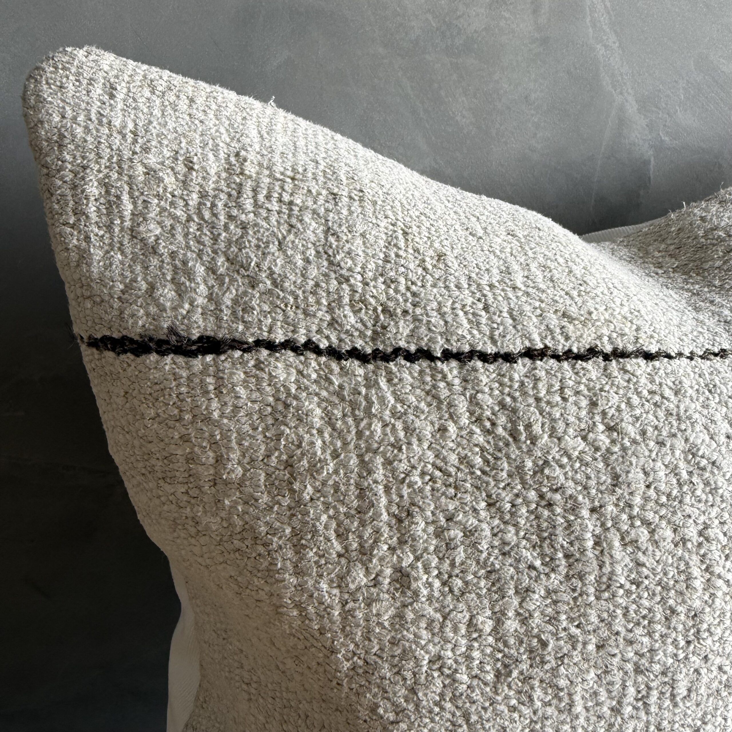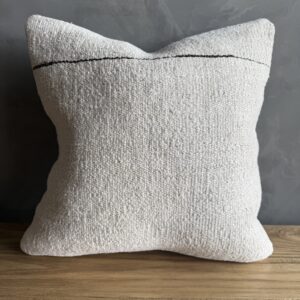 Creamy white hemp rug pillow with original seams. Soft hand, linen blend backing with zipper closure. Spot cleaning is recommended, or dry clean. These rugs have been professionally cleaned prior to construction. These durable pillows will last for years, and are great for high use areas.
