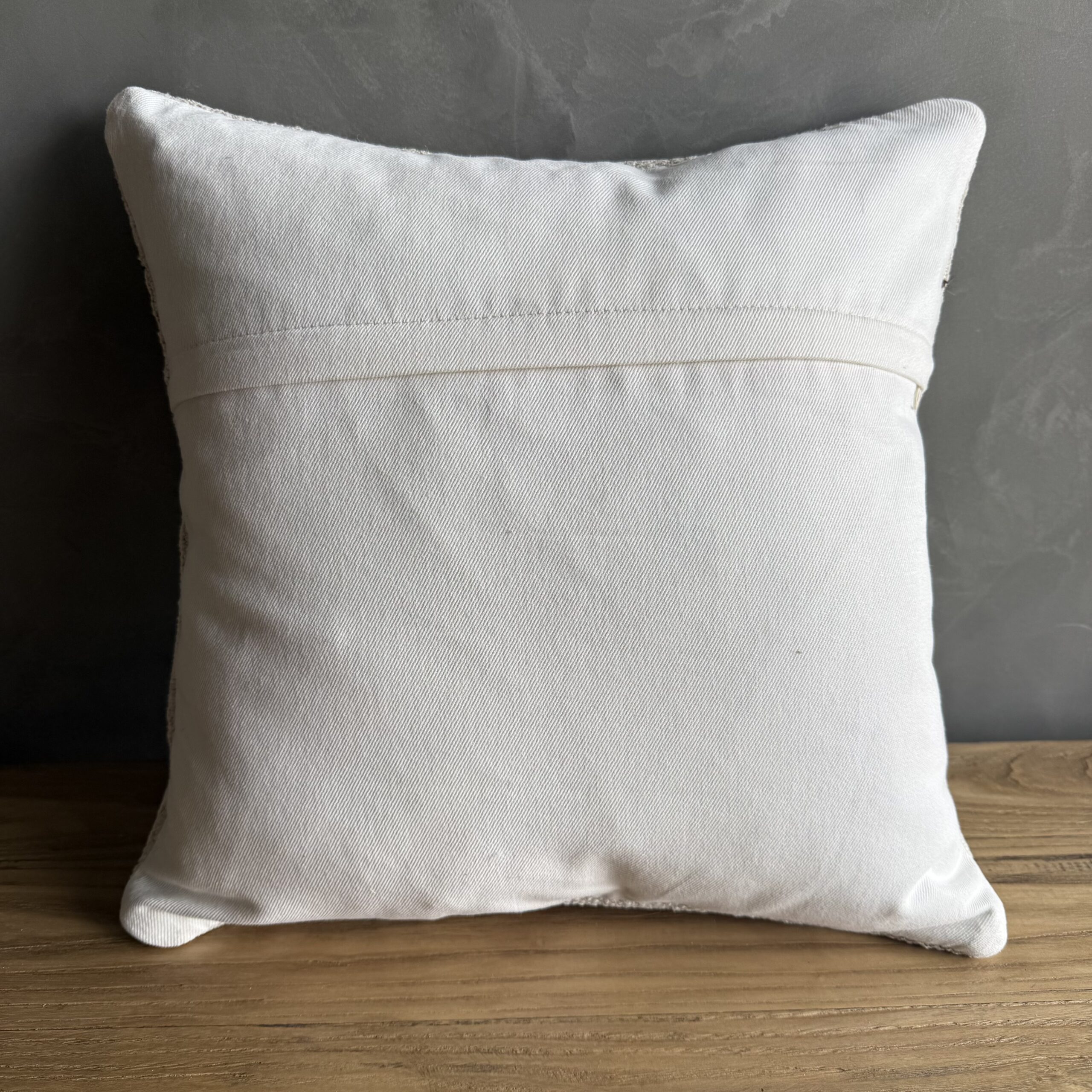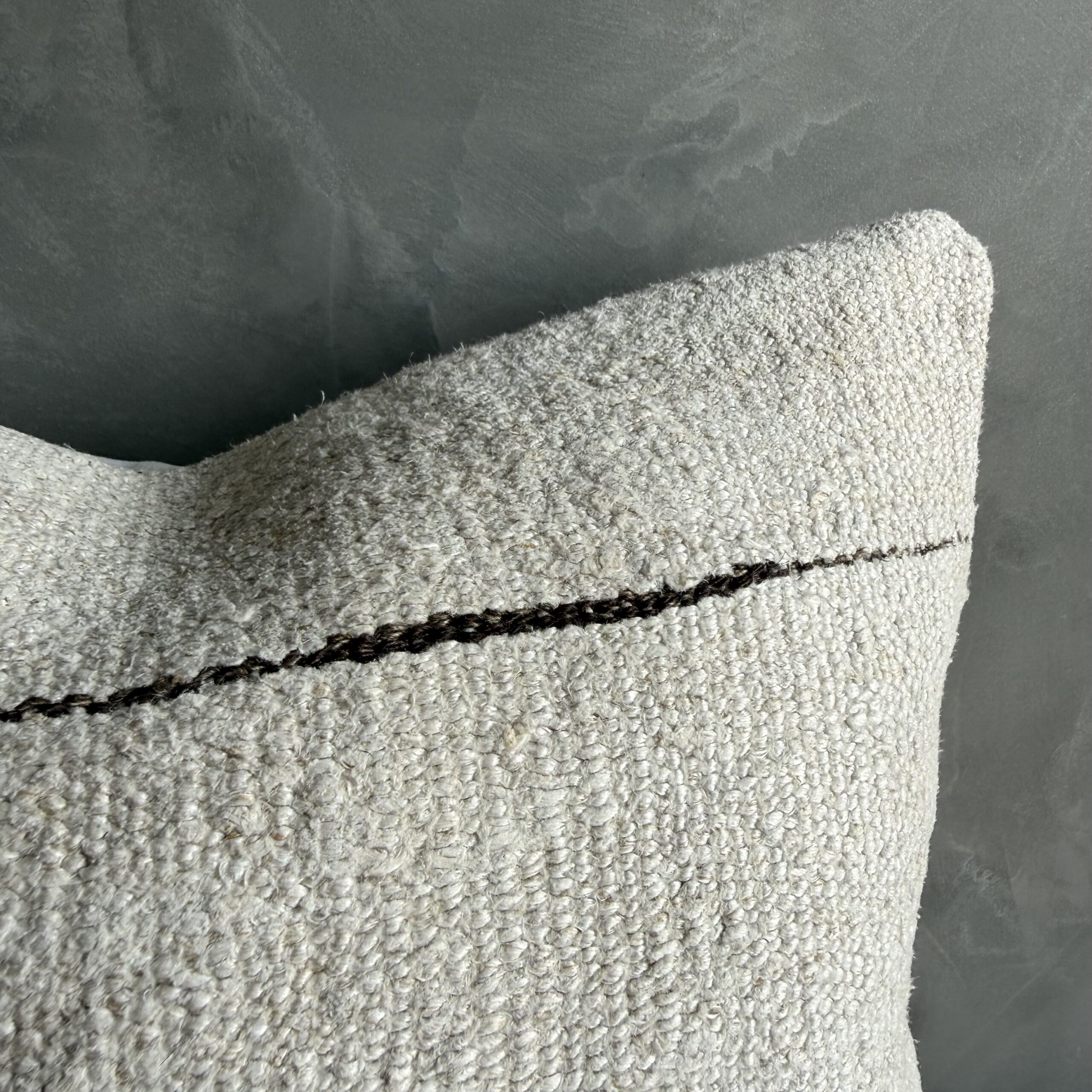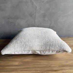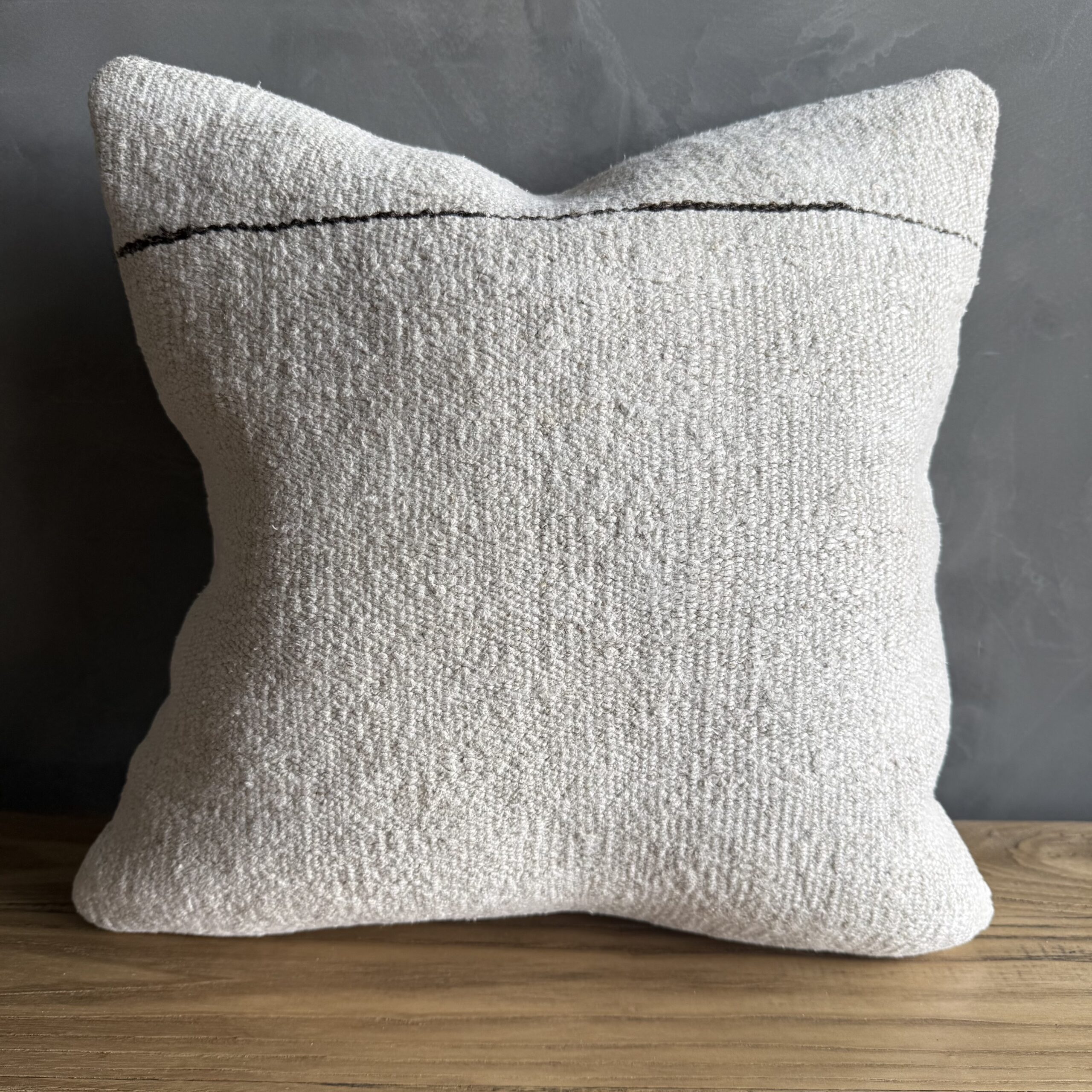 Creamy white hemp rug pillow with original seams. Soft hand, linen blend backing with zipper closure. Spot cleaning is recommended, or dry clean. These rugs have been professionally cleaned prior to construction. These durable pillows will last for years, and are great for high use areas.