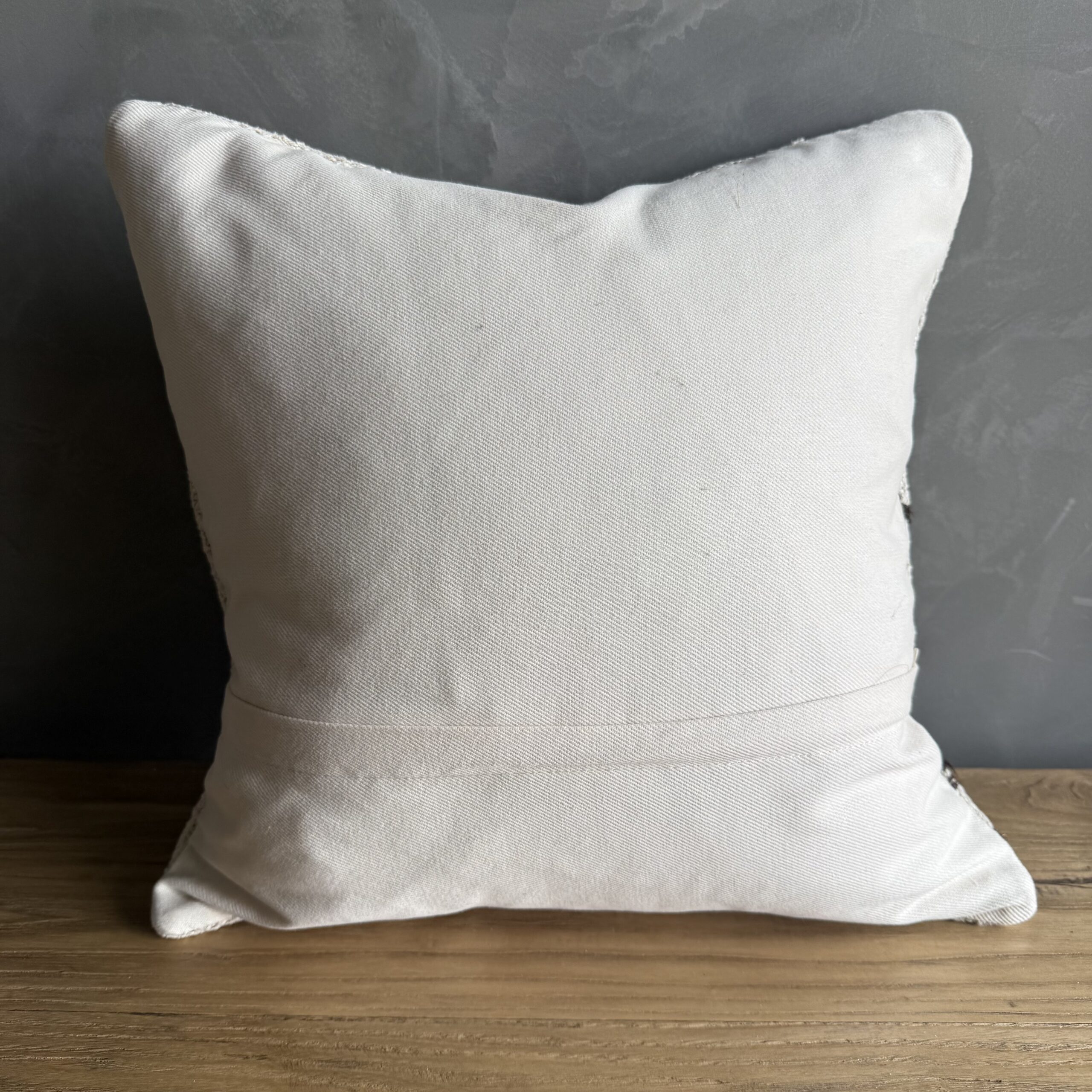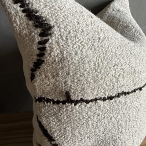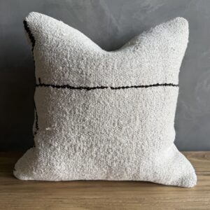 Creamy white hemp rug pillow with original seams. Soft hand, linen blend backing with zipper closure. Spot cleaning is recommended, or dry clean. These rugs have been professionally cleaned prior to construction. These durable pillows will last for years, and are great for high use areas.