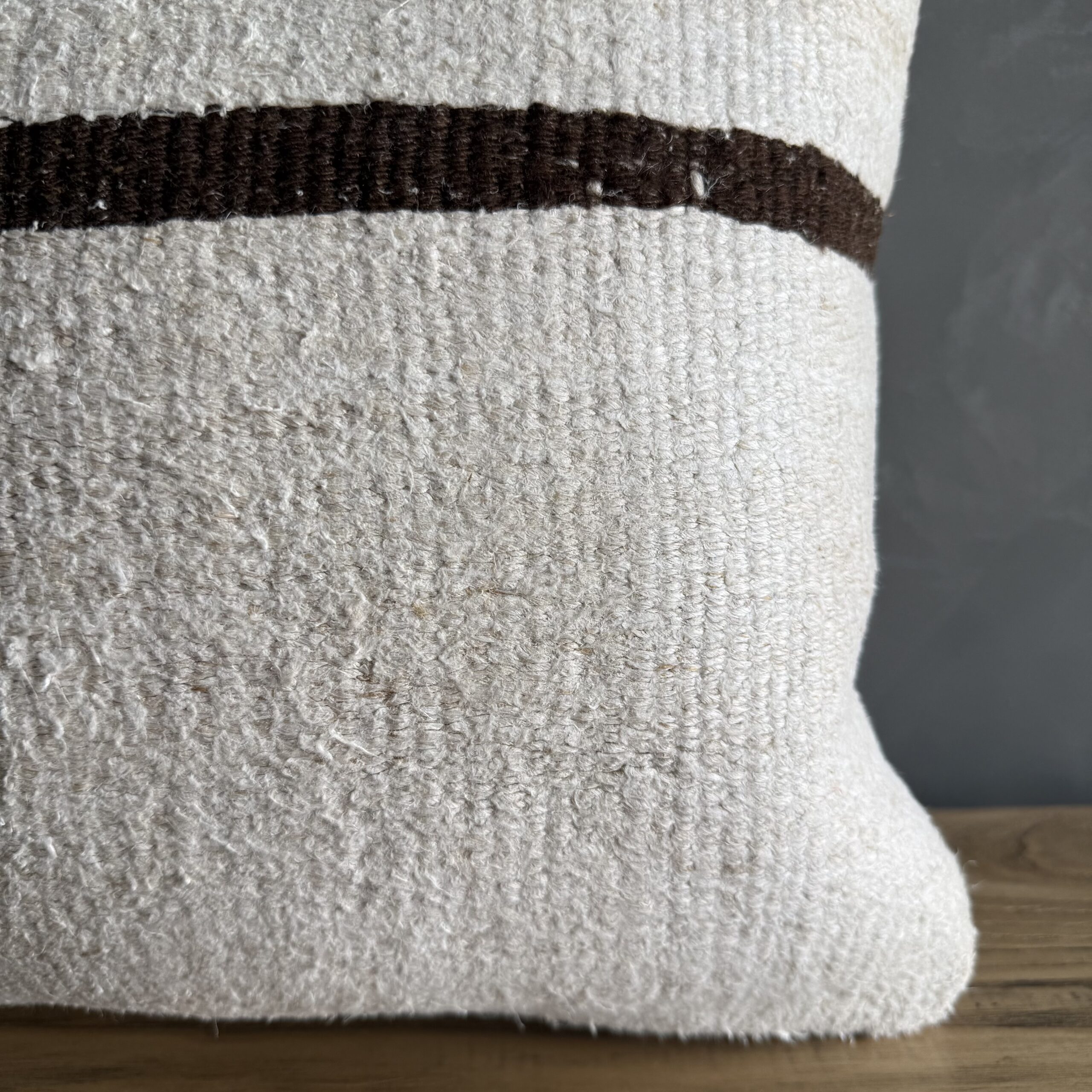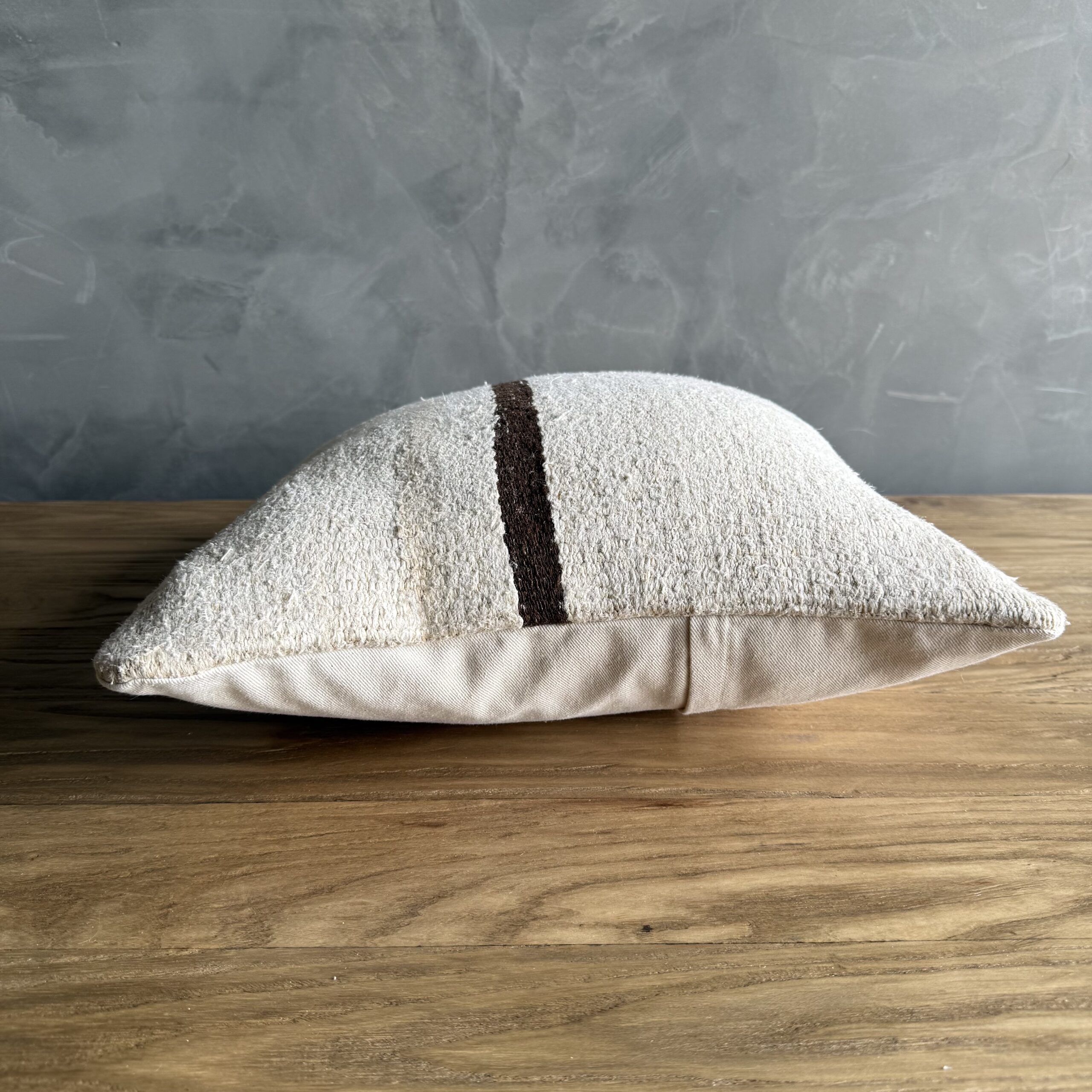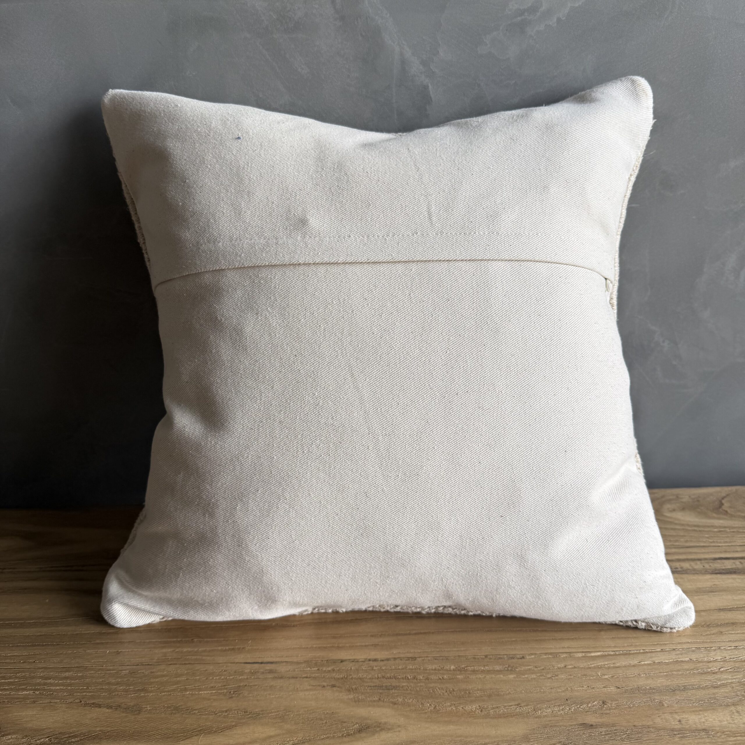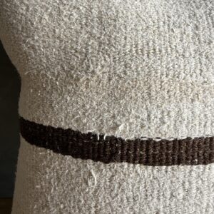 Creamy white hemp rug pillow with original seams. Soft hand, linen blend backing with zipper closure. Spot cleaning is recommended, or dry clean. These rugs have been professionally cleaned prior to construction. These durable pillows will last for years, and are great for high use areas.