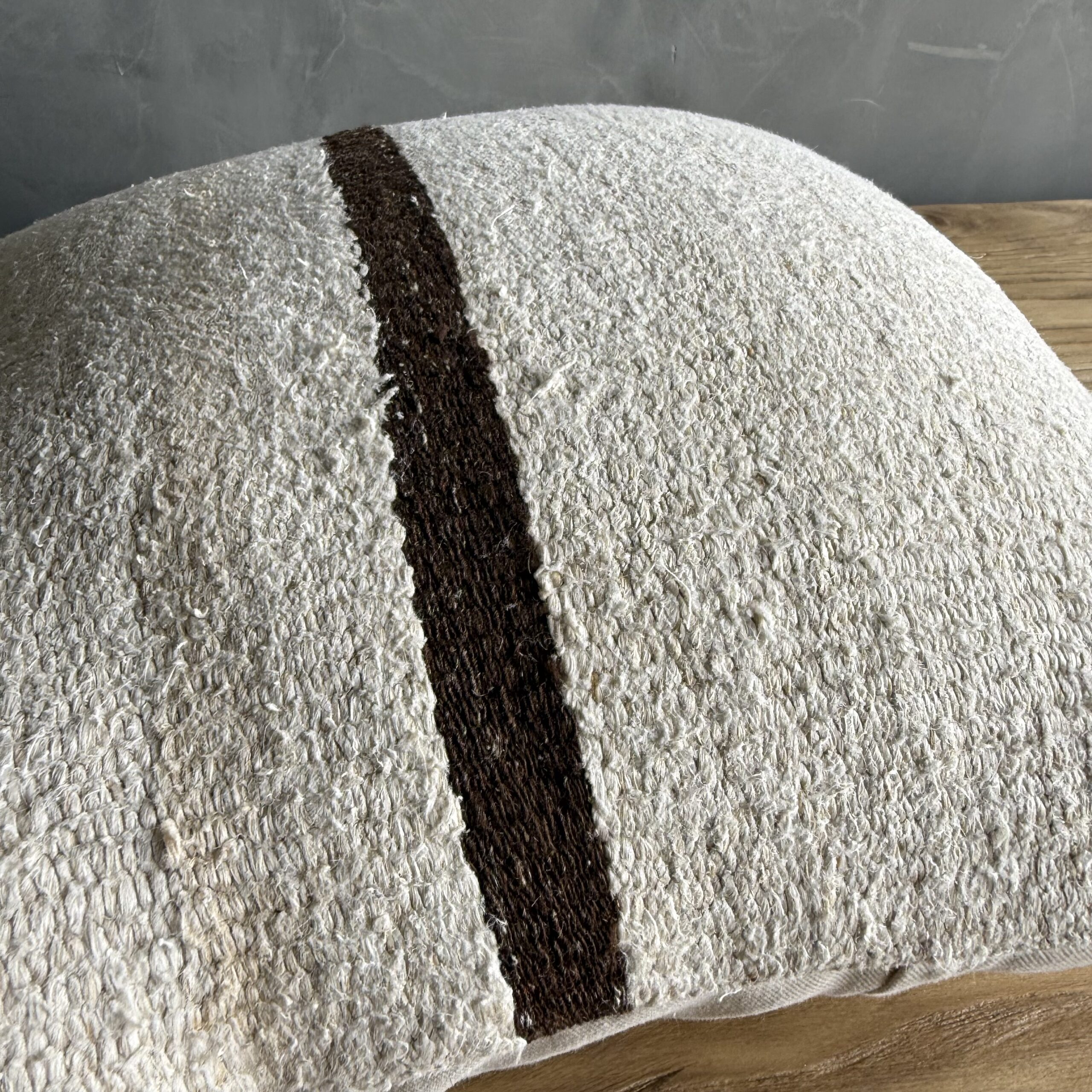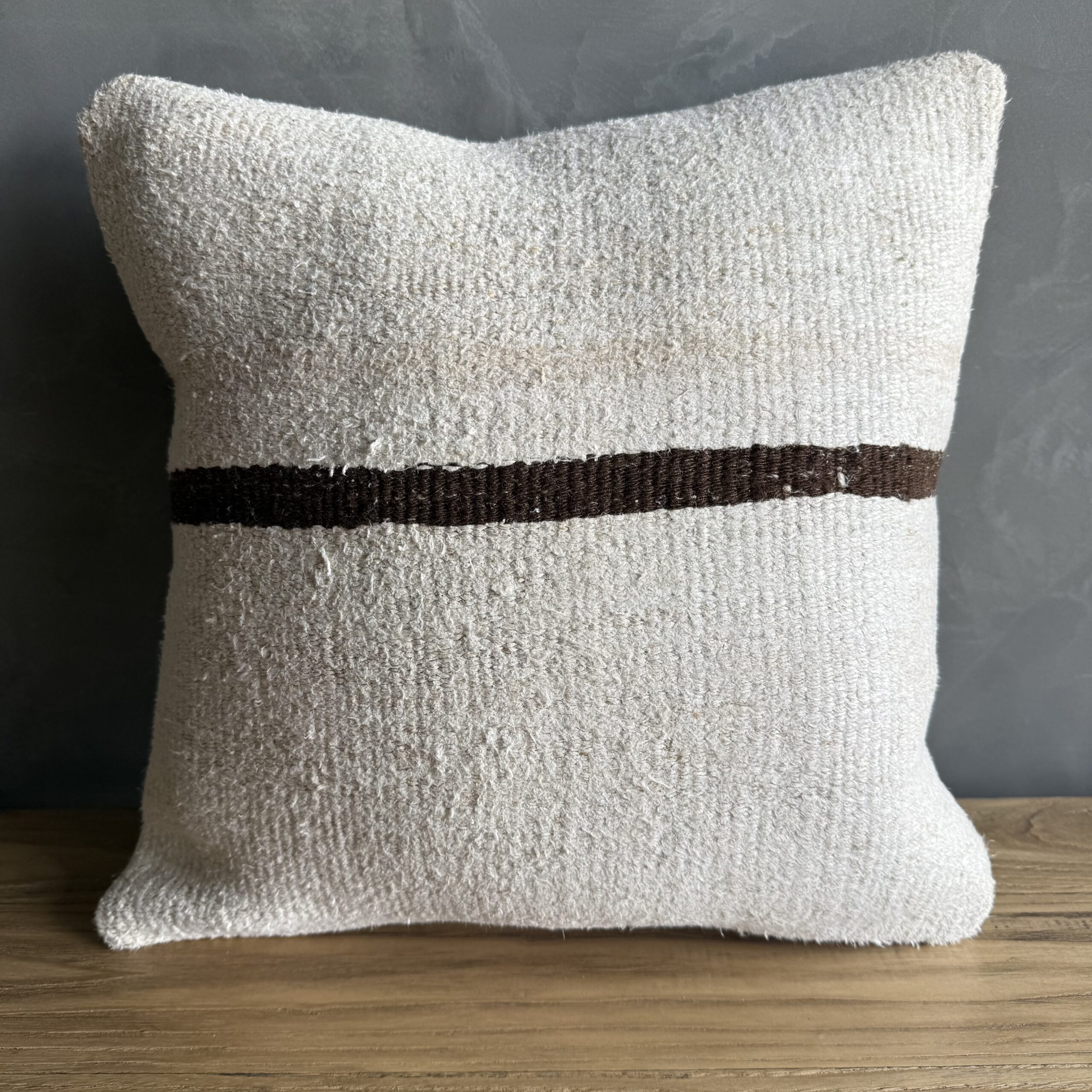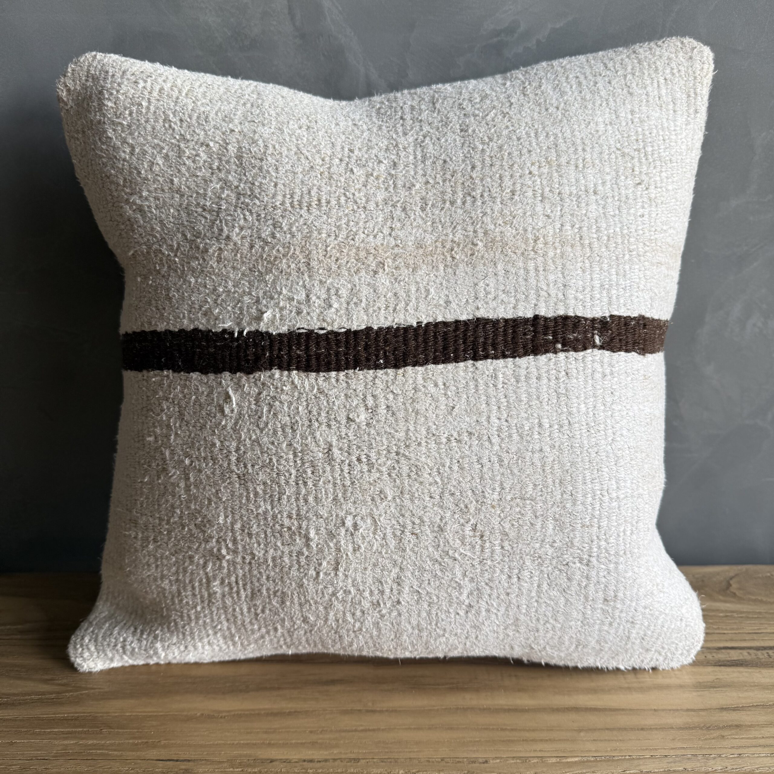 Creamy white hemp rug pillow with original seams. Soft hand, linen blend backing with zipper closure. Spot cleaning is recommended, or dry clean. These rugs have been professionally cleaned prior to construction. These durable pillows will last for years, and are great for high use areas.
