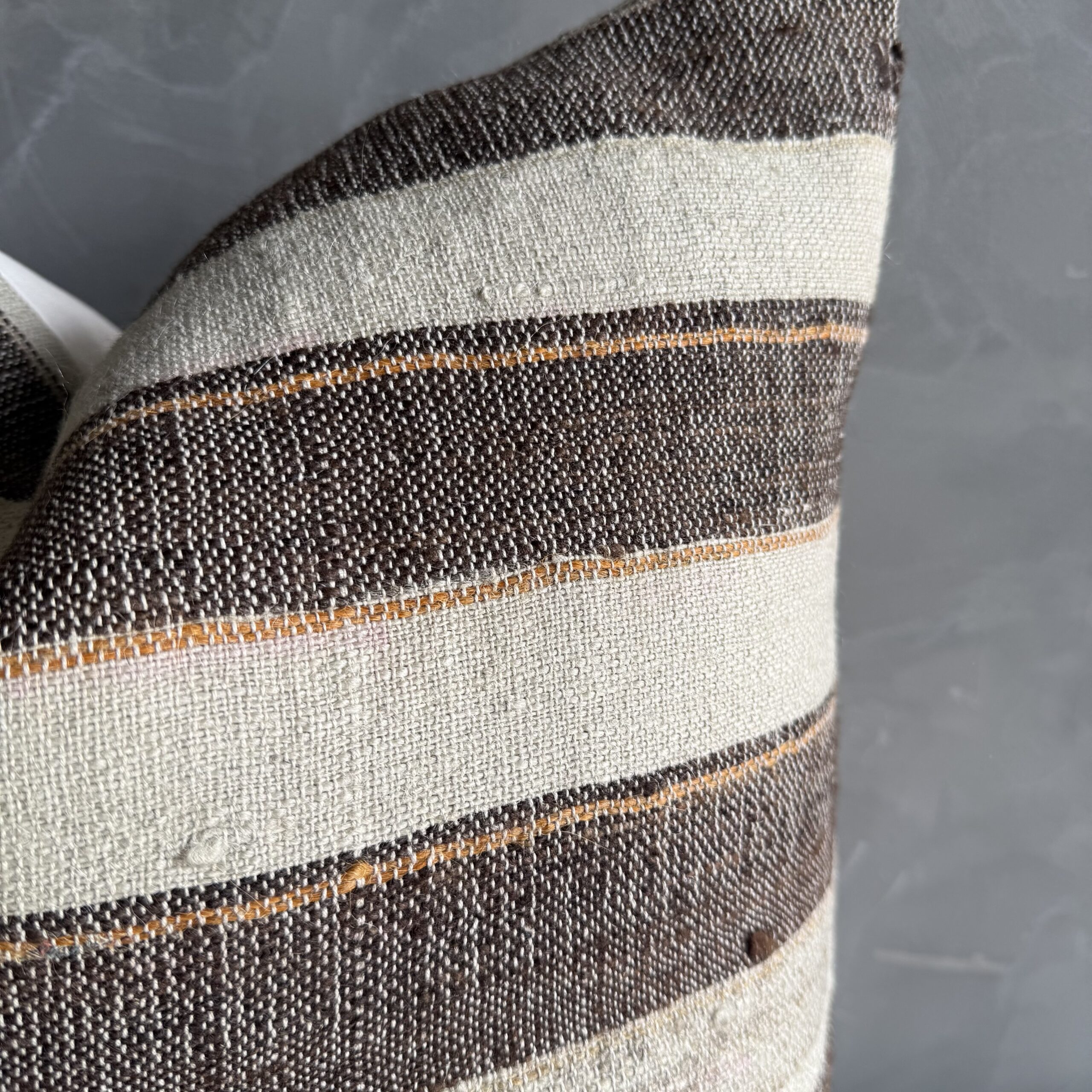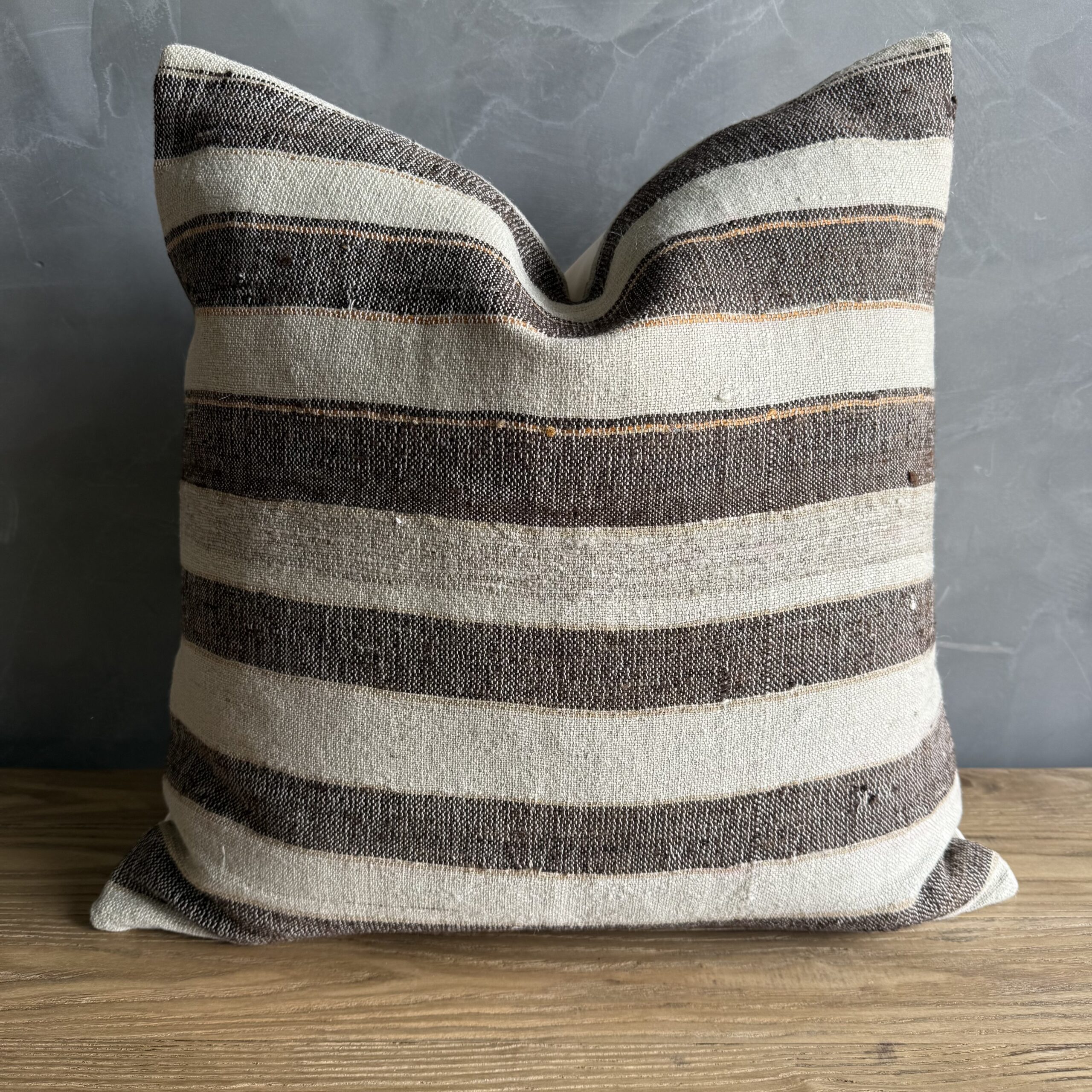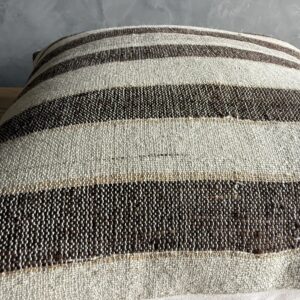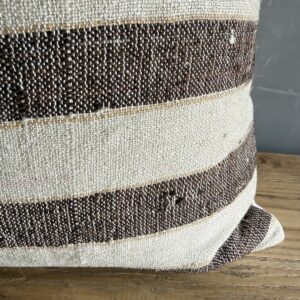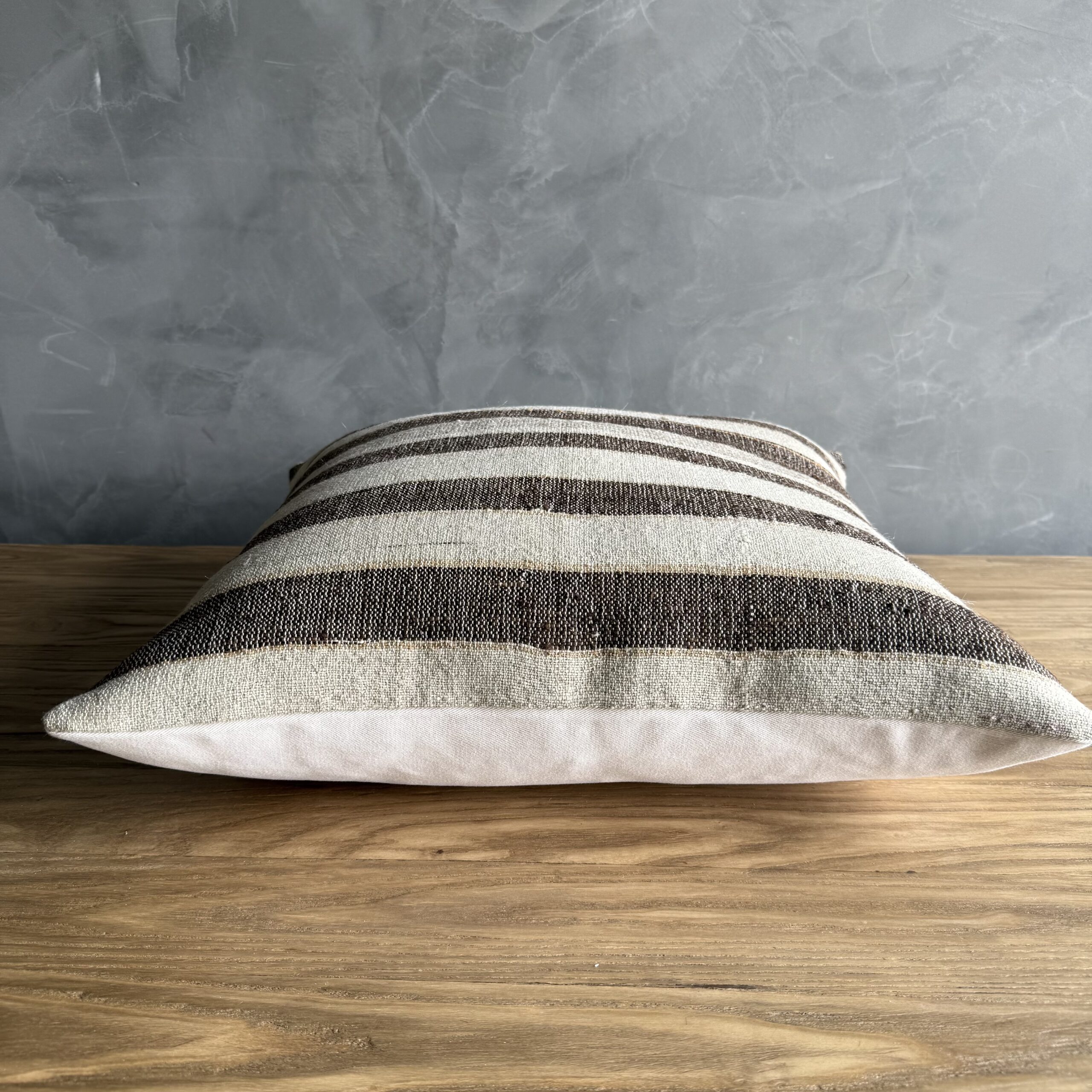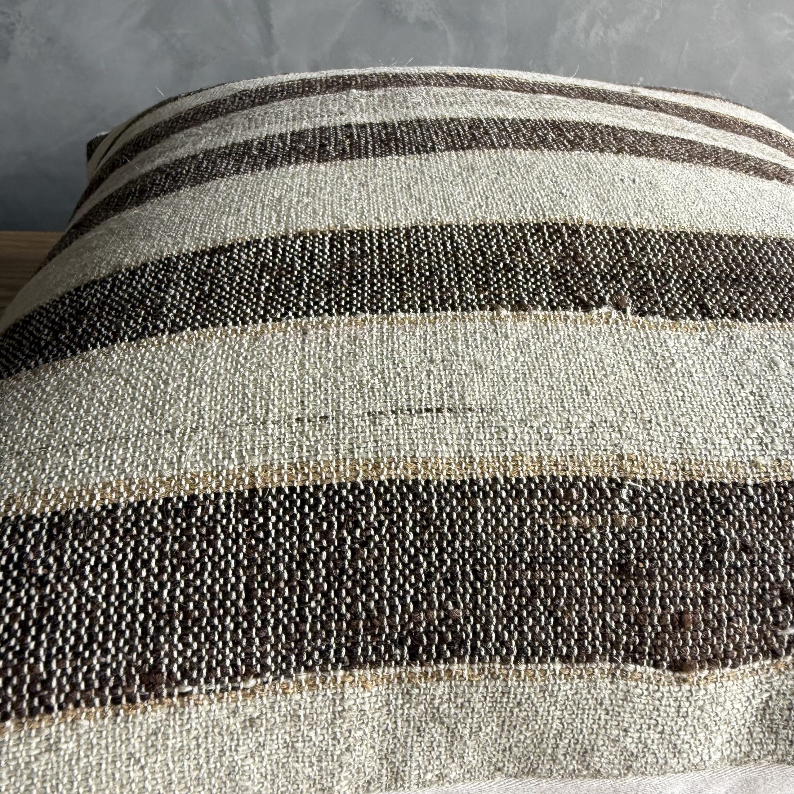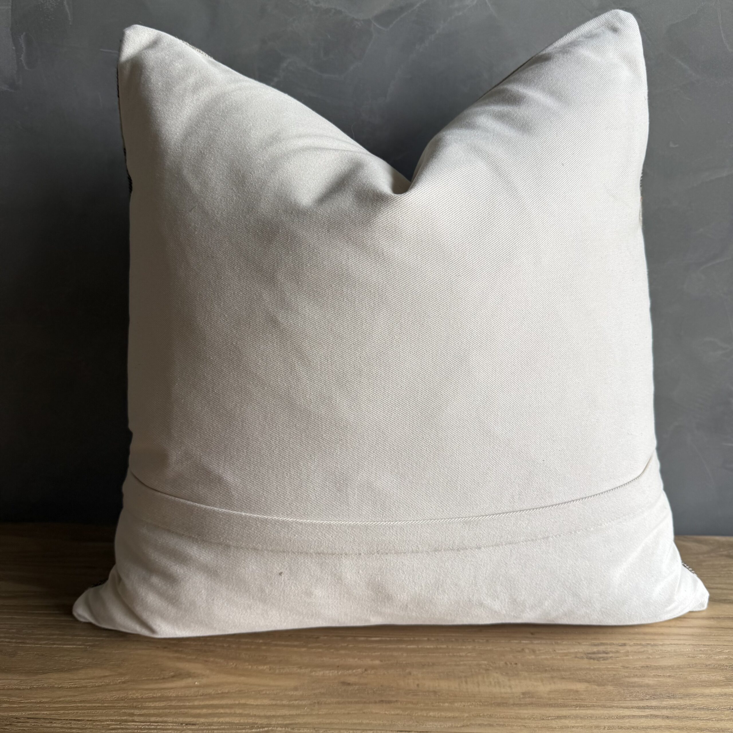 Creamy white hemp rug pillow with original seams. Soft hand, linen blend backing with zipper closure. Spot cleaning is recommended, or dry clean. These rugs have been professionally cleaned prior to construction. These durable pillows will last for years, and are great for high use areas.