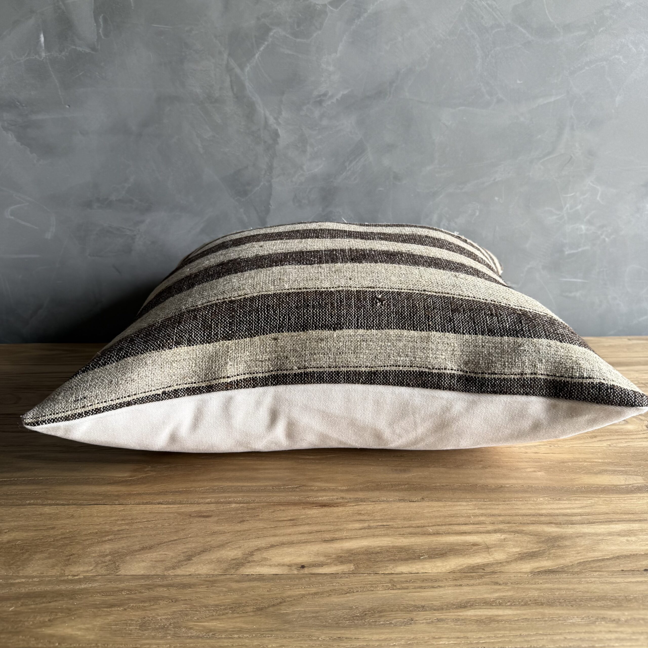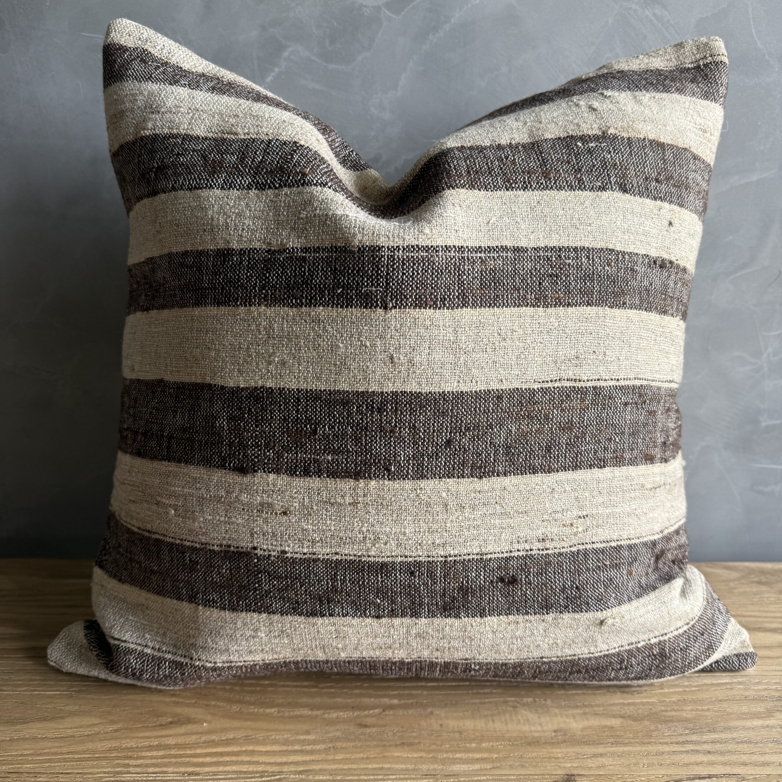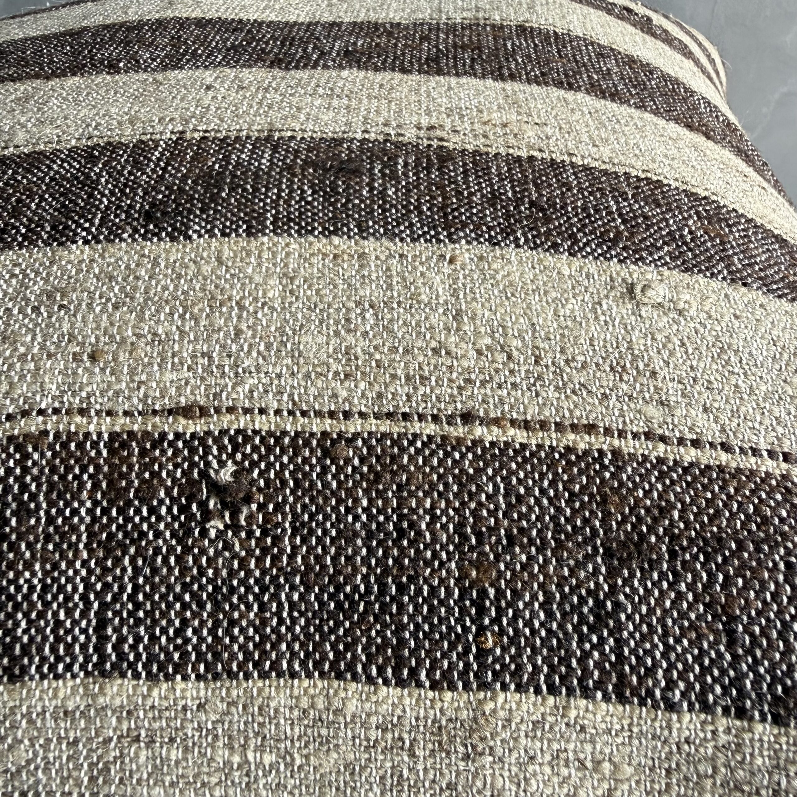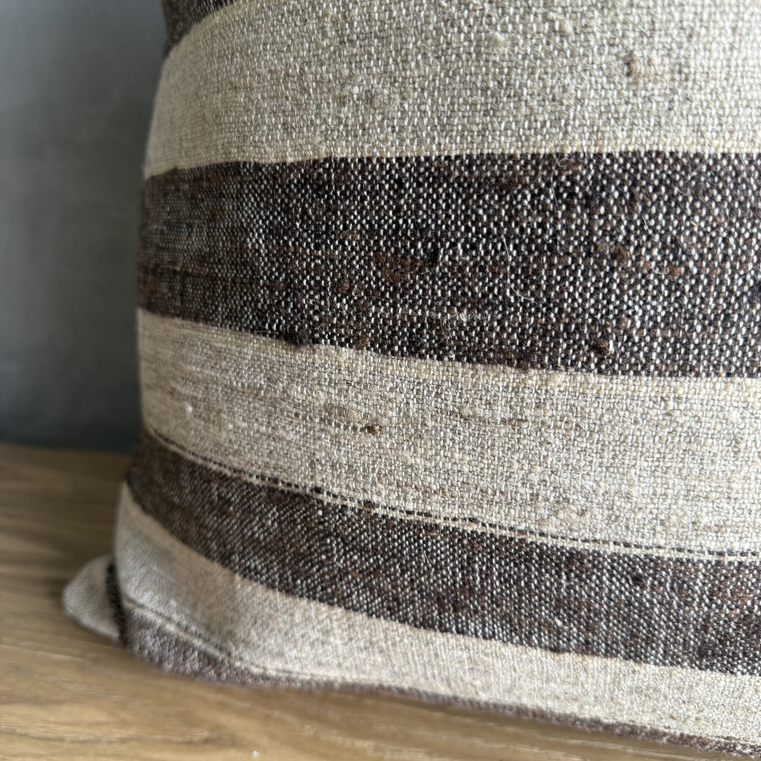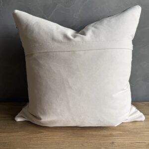 Creamy white hemp rug pillow with original seams. Soft hand, linen blend backing with zipper closure. Spot cleaning is recommended, or dry clean. These rugs have been professionally cleaned prior to construction. These durable pillows will last for years, and are great for high use areas.